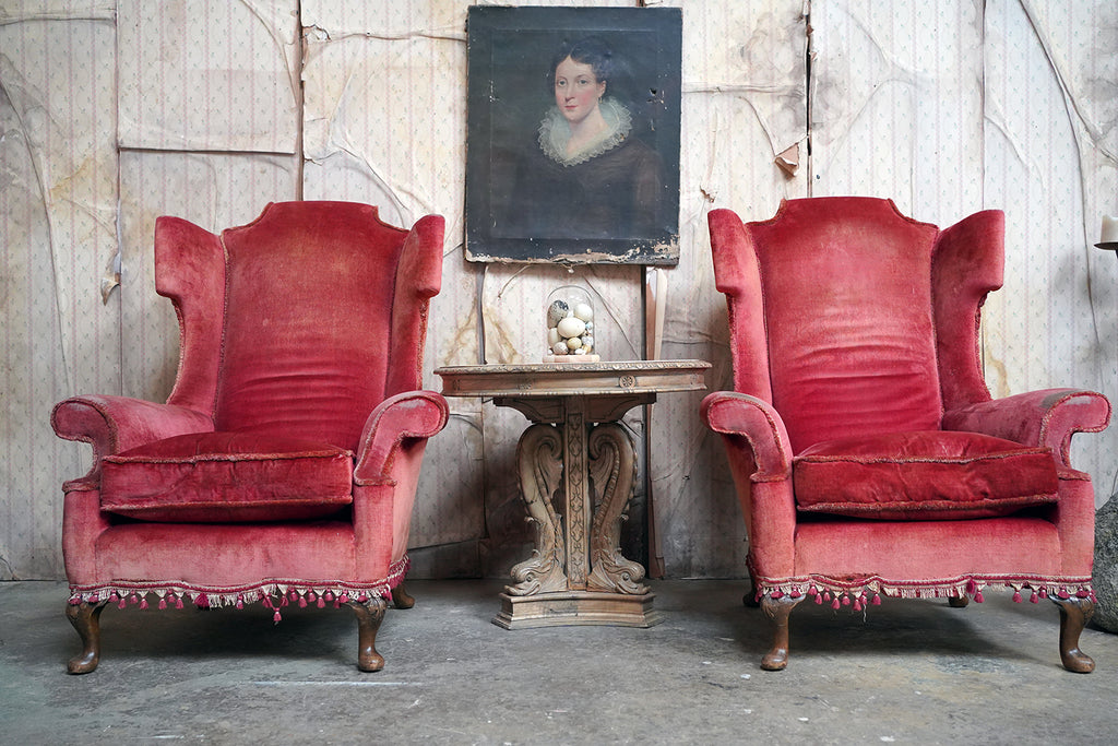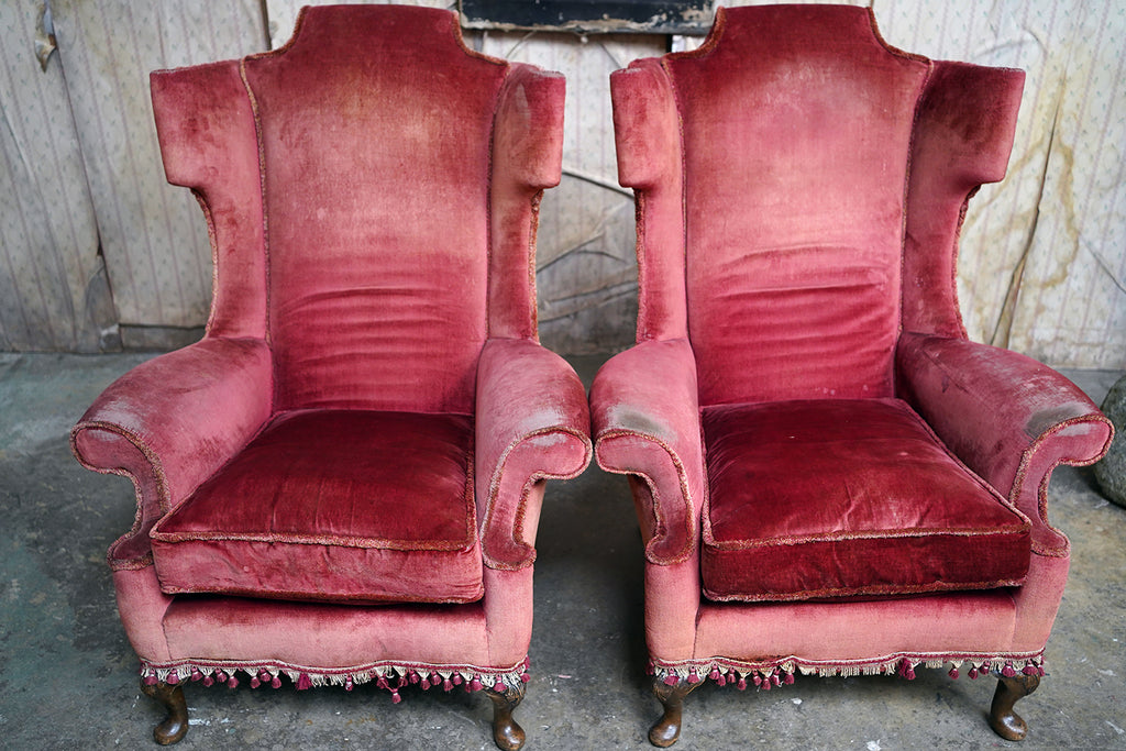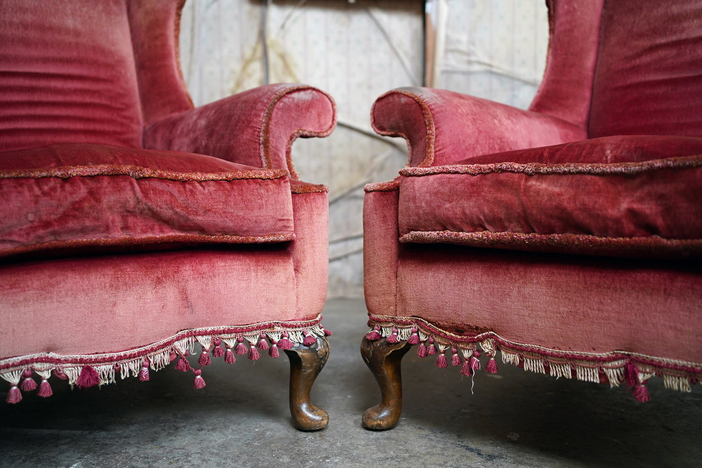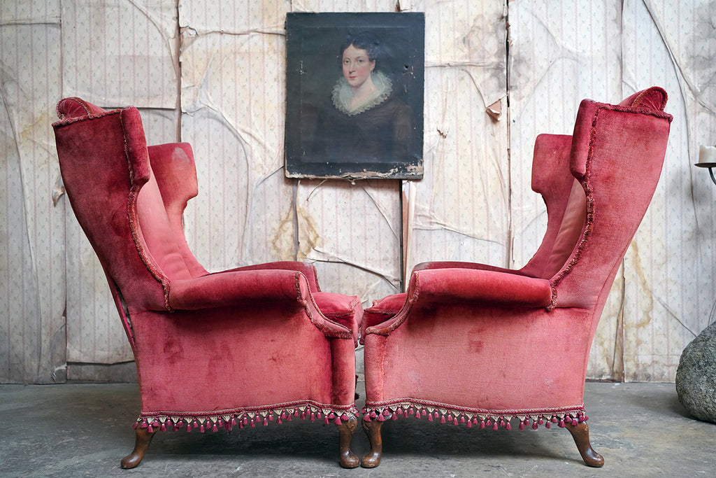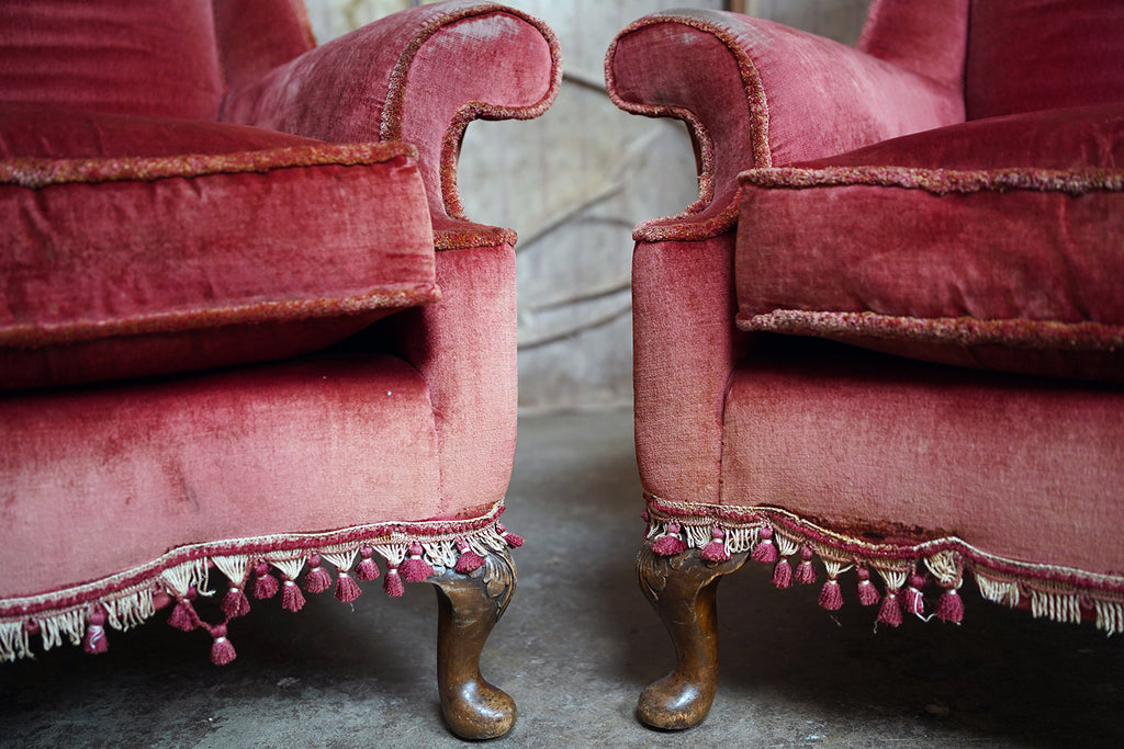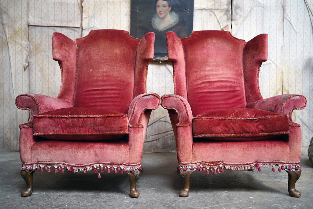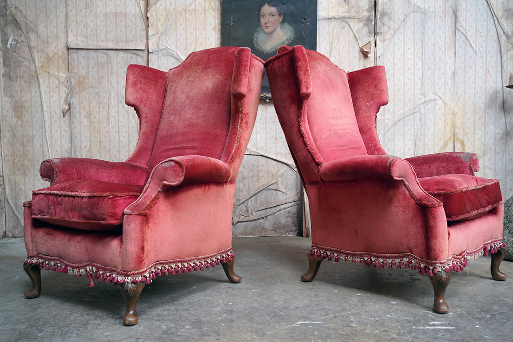 The Georgian revival country house wing armchairs, upholstered in historic faded scarlet red velvet with lower apron tasselling, each raised on short walnut cabriole legs with acanthus leaf detailing to pad feet, the wholes in the Queen Anne style, the carcasses with strongly defined shaped wing backs with pronounced sculptured scrolled wings and arm rests, each surviving from Edwardian period England.
