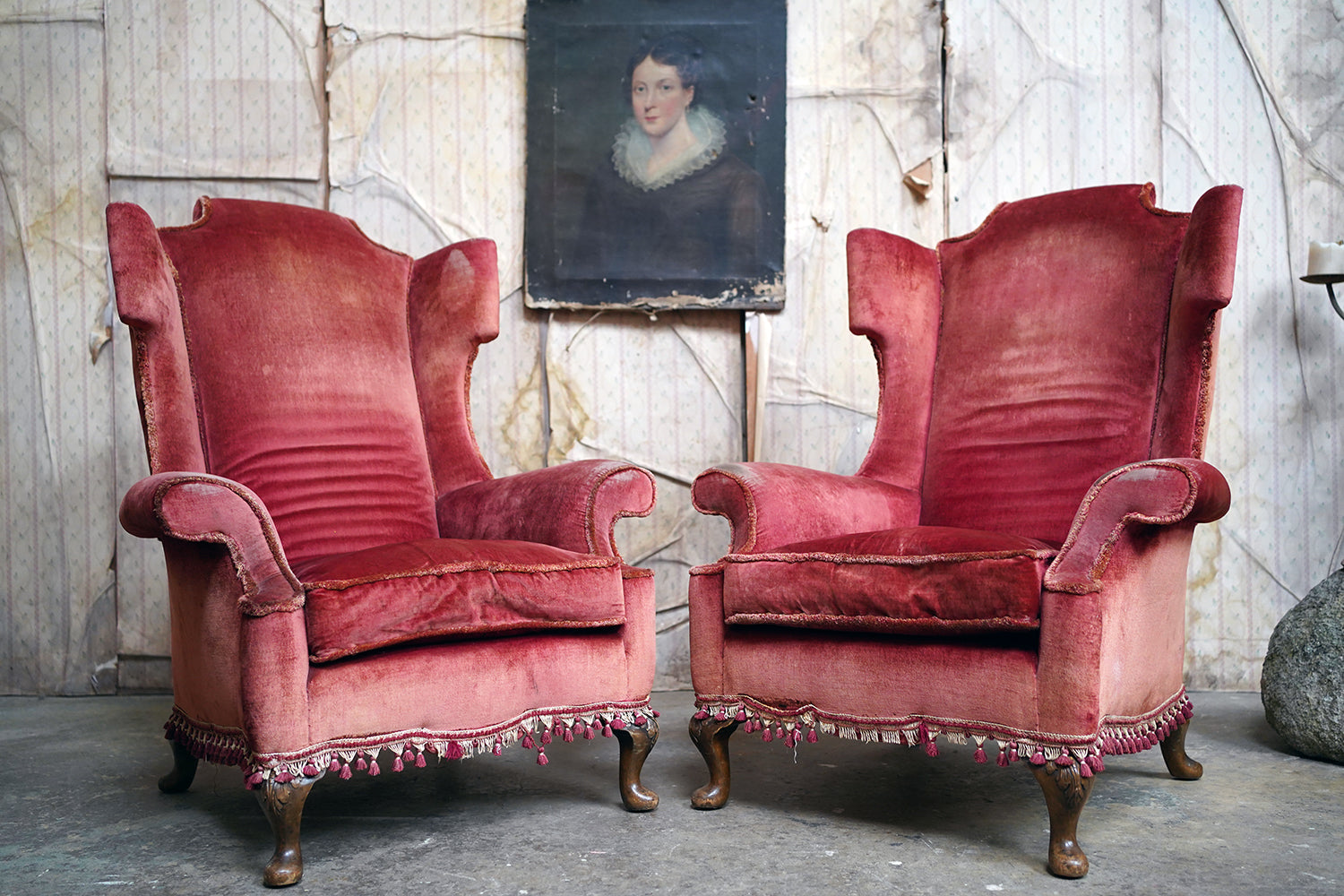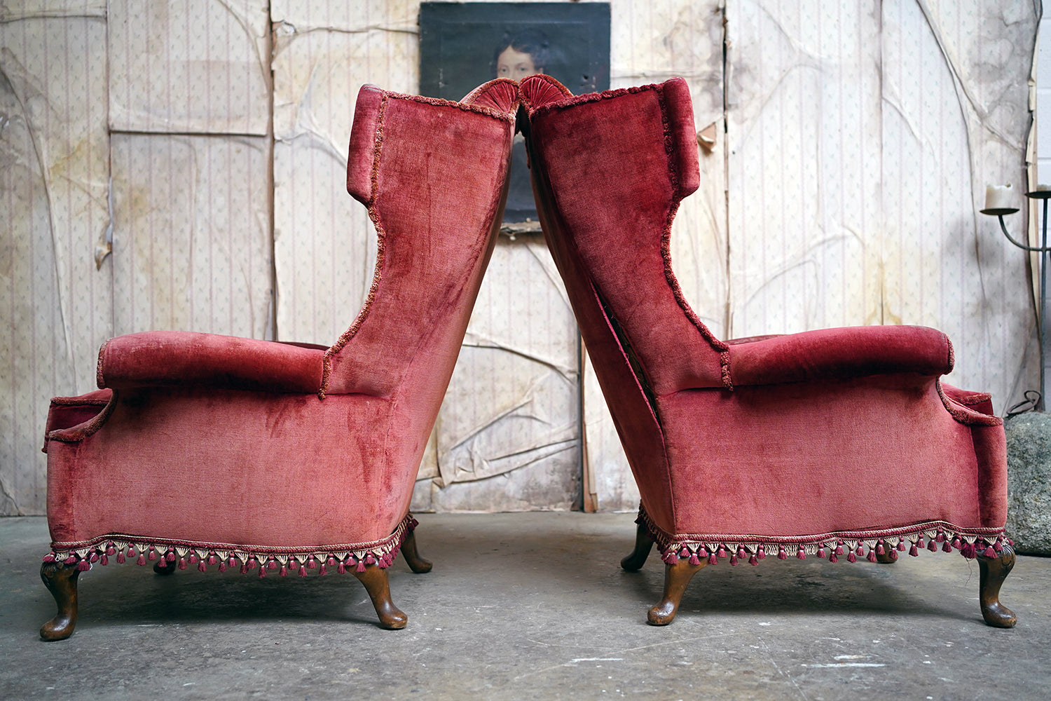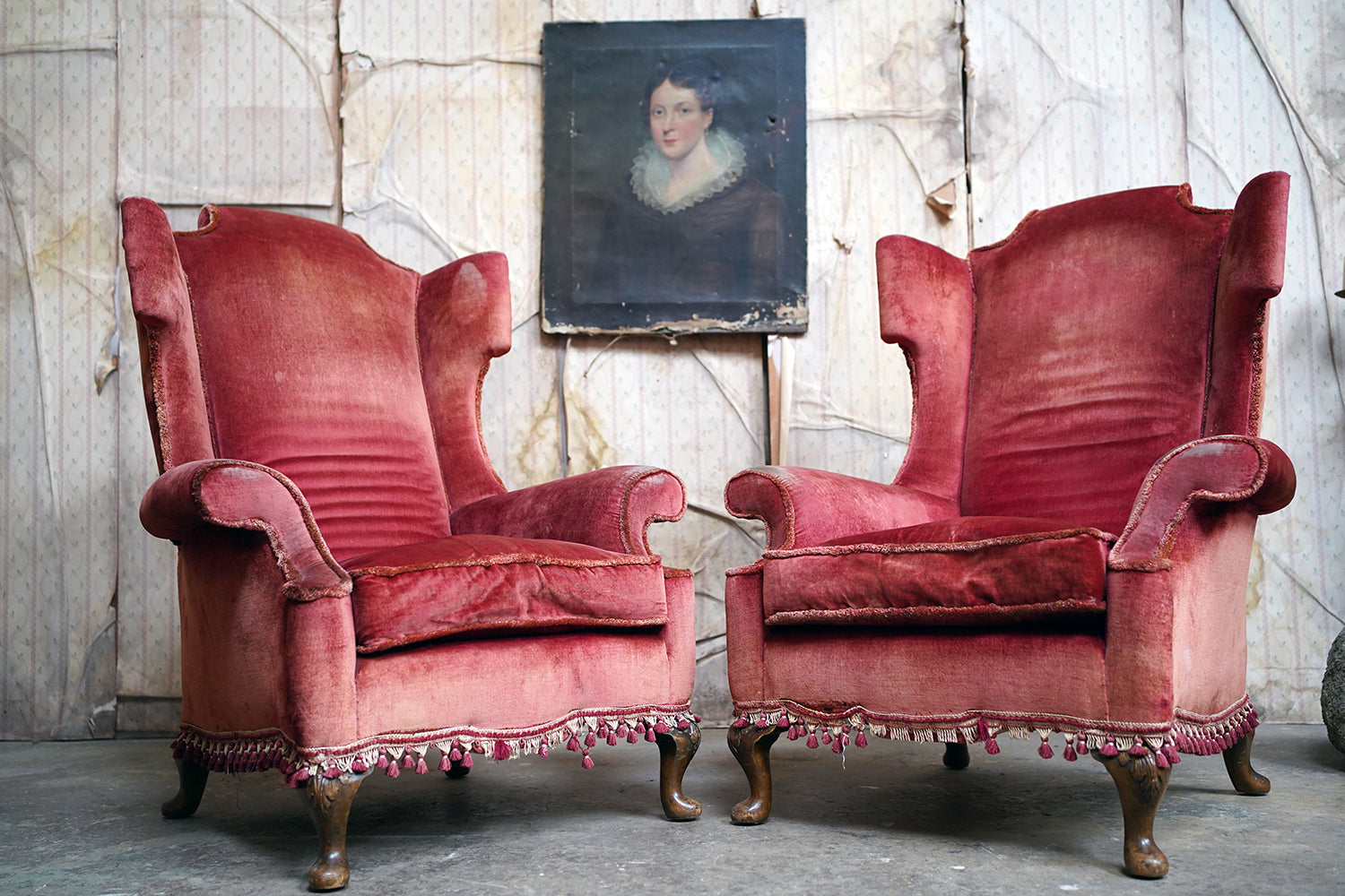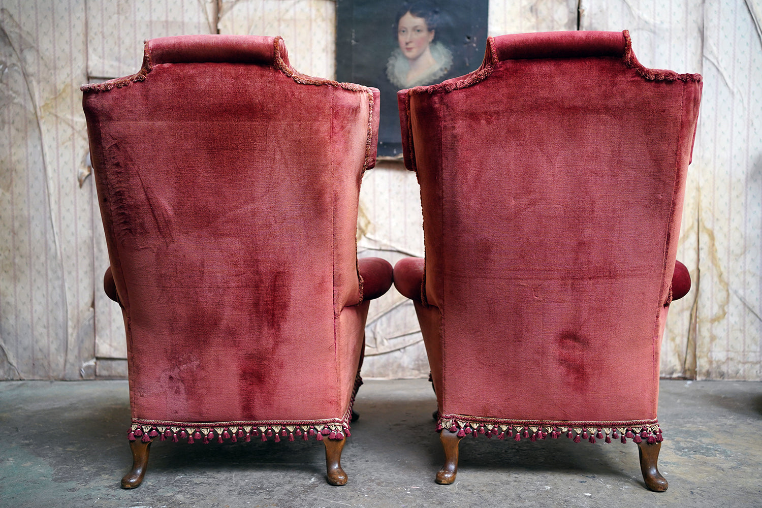 The Georgian revival country house wing armchairs, upholstered in historic faded scarlet red velvet with lower apron tasselling, each raised on short walnut cabriole legs with acanthus leaf detailing to pad feet, the wholes in the Queen Anne style, the carcasses with strongly defined shaped wing backs with pronounced sculptured scrolled wings and arm rests, each surviving from Edwardian period England.