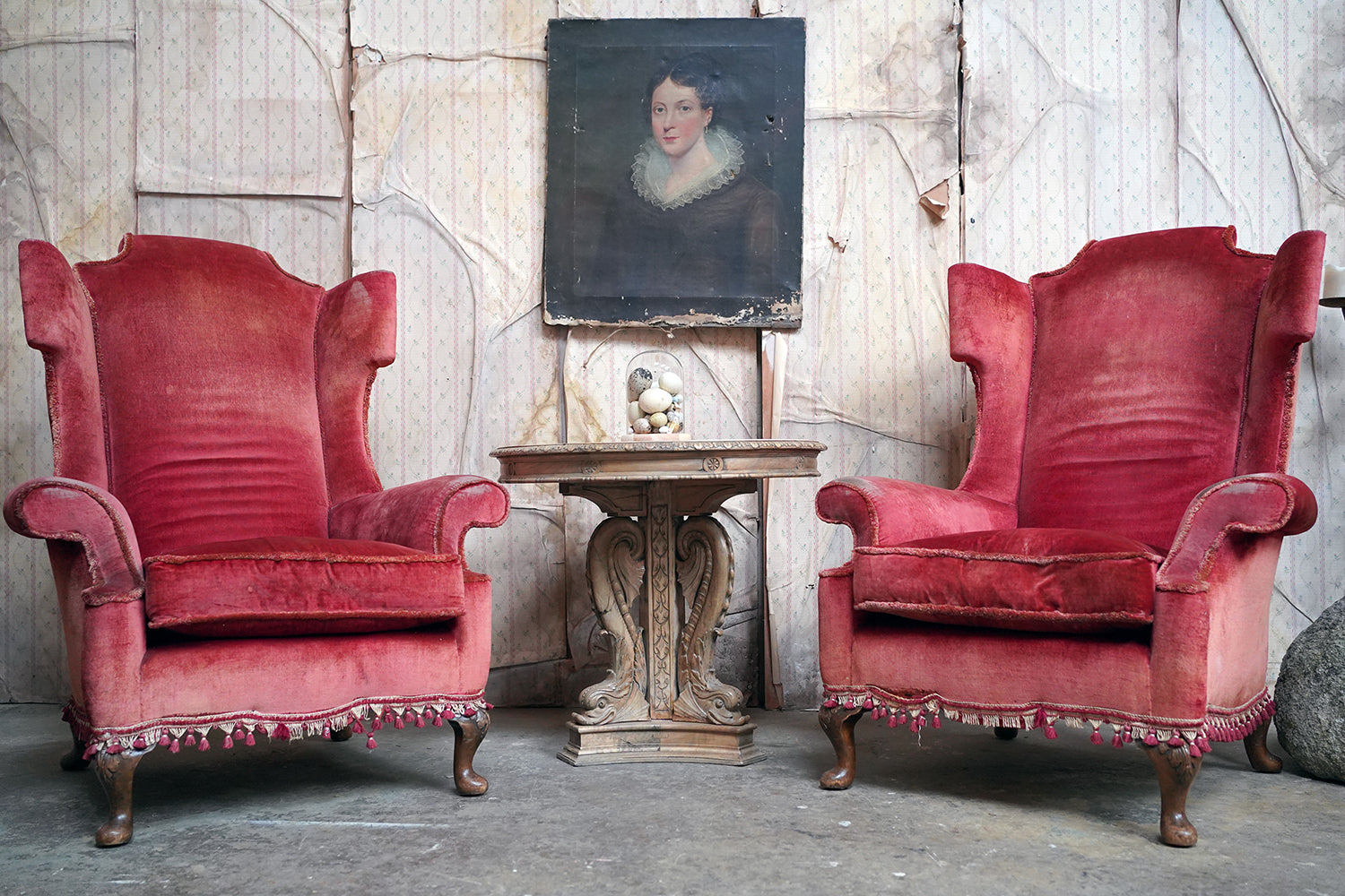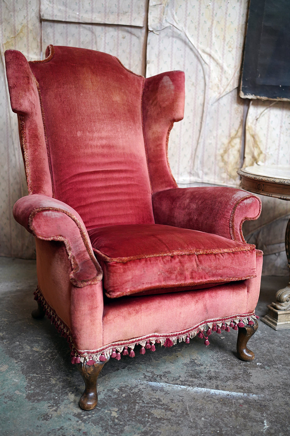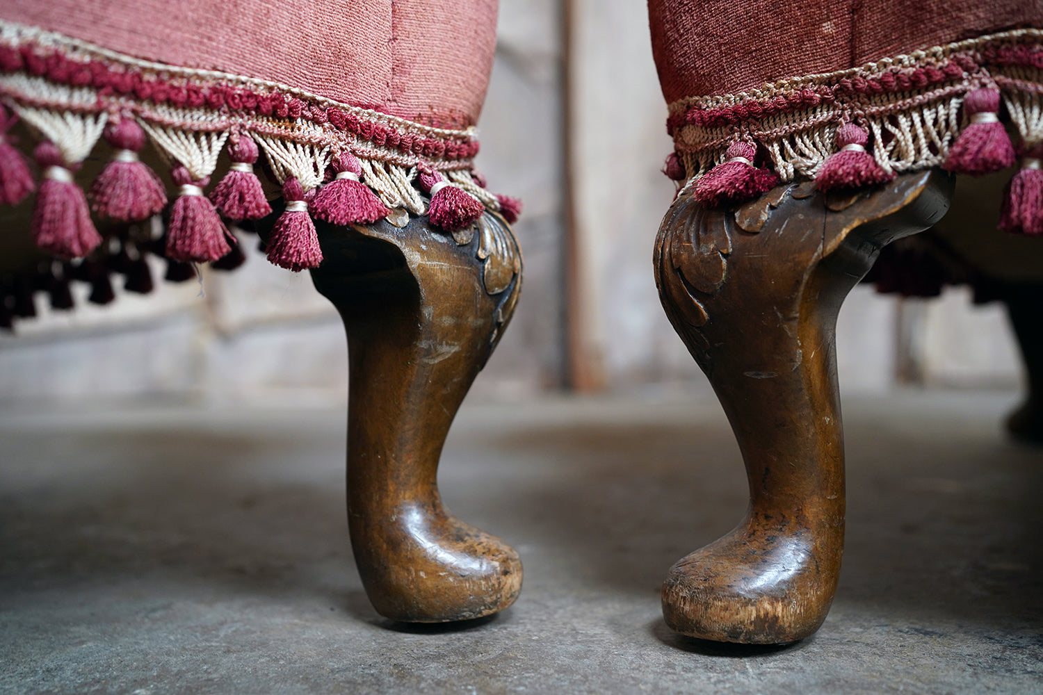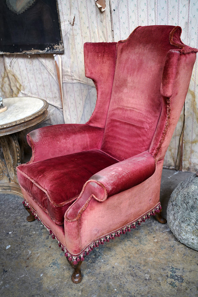 The Georgian revival country house wing armchairs, upholstered in historic faded scarlet red velvet with lower apron tasselling, each raised on short walnut cabriole legs with acanthus leaf detailing to pad feet, the wholes in the Queen Anne style, the carcasses with strongly defined shaped wing backs with pronounced sculptured scrolled wings and arm rests, each surviving from Edwardian period England.