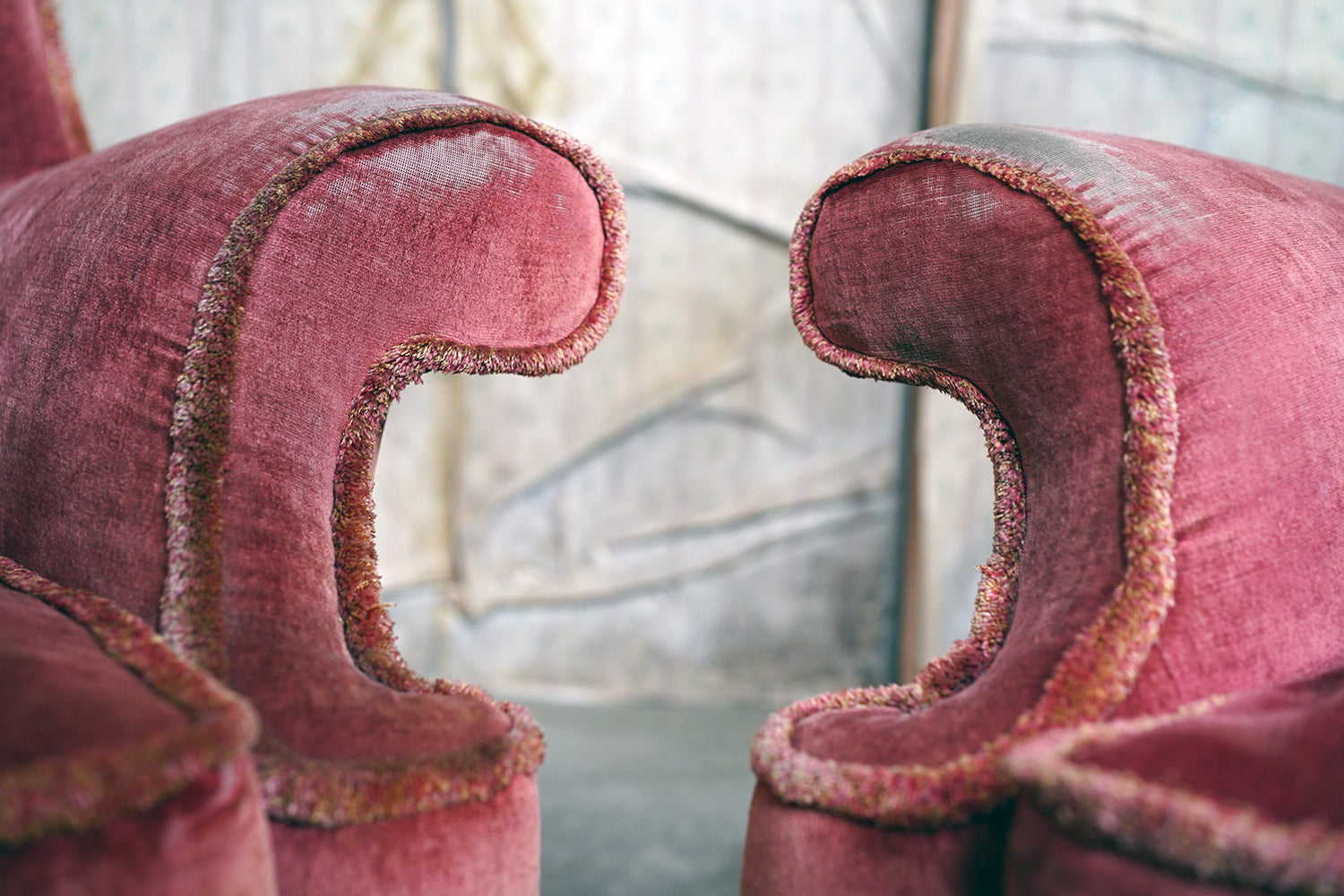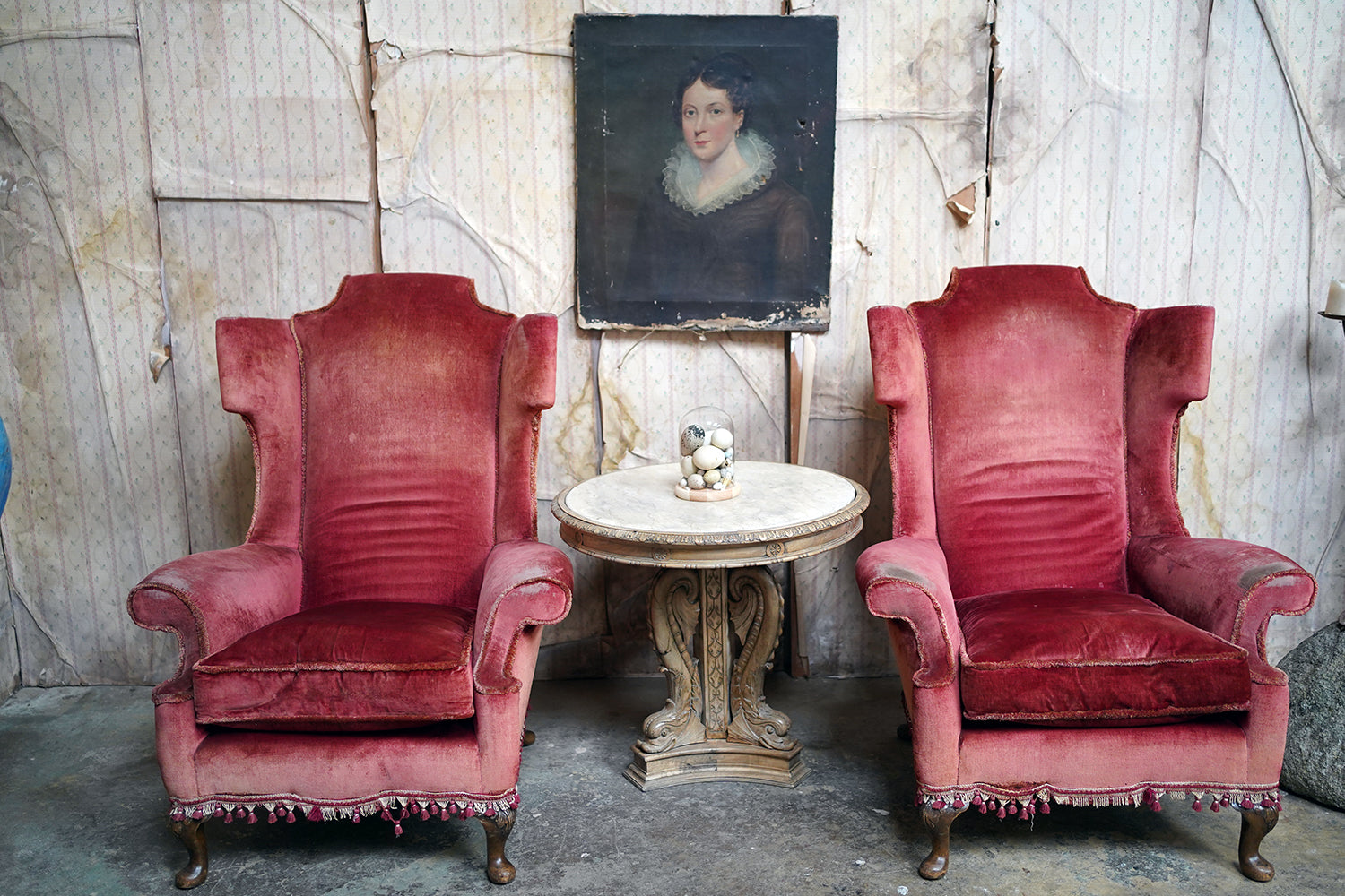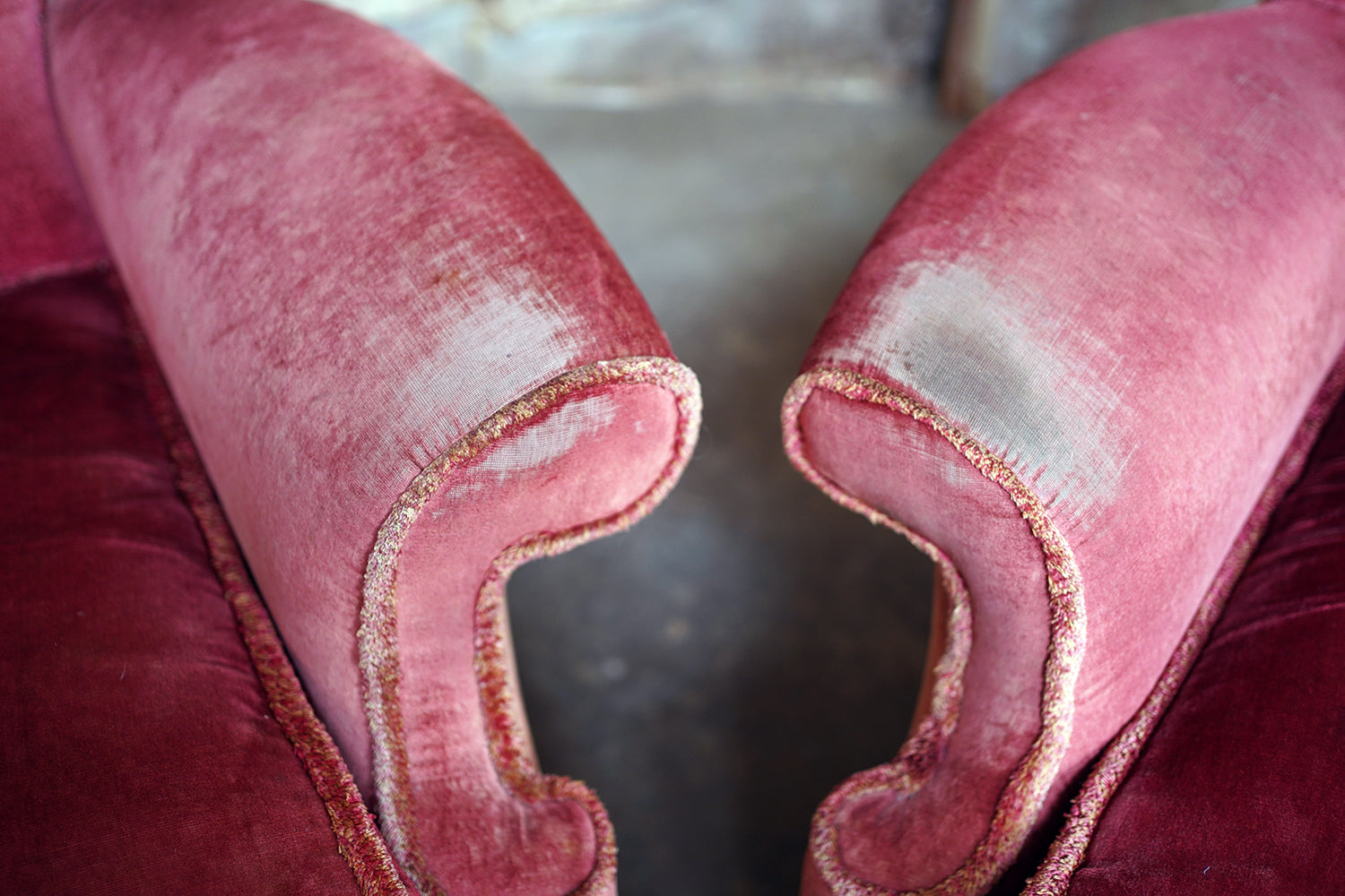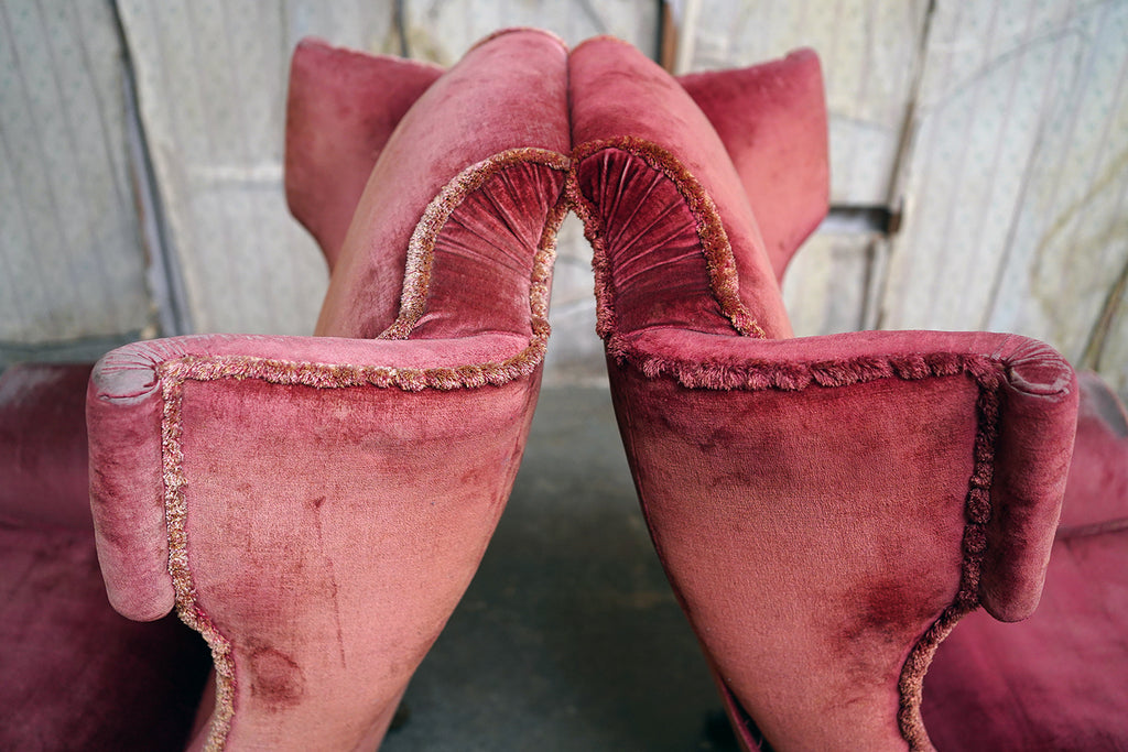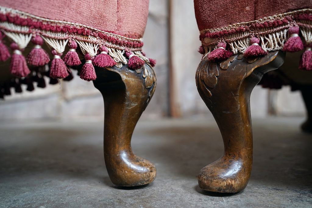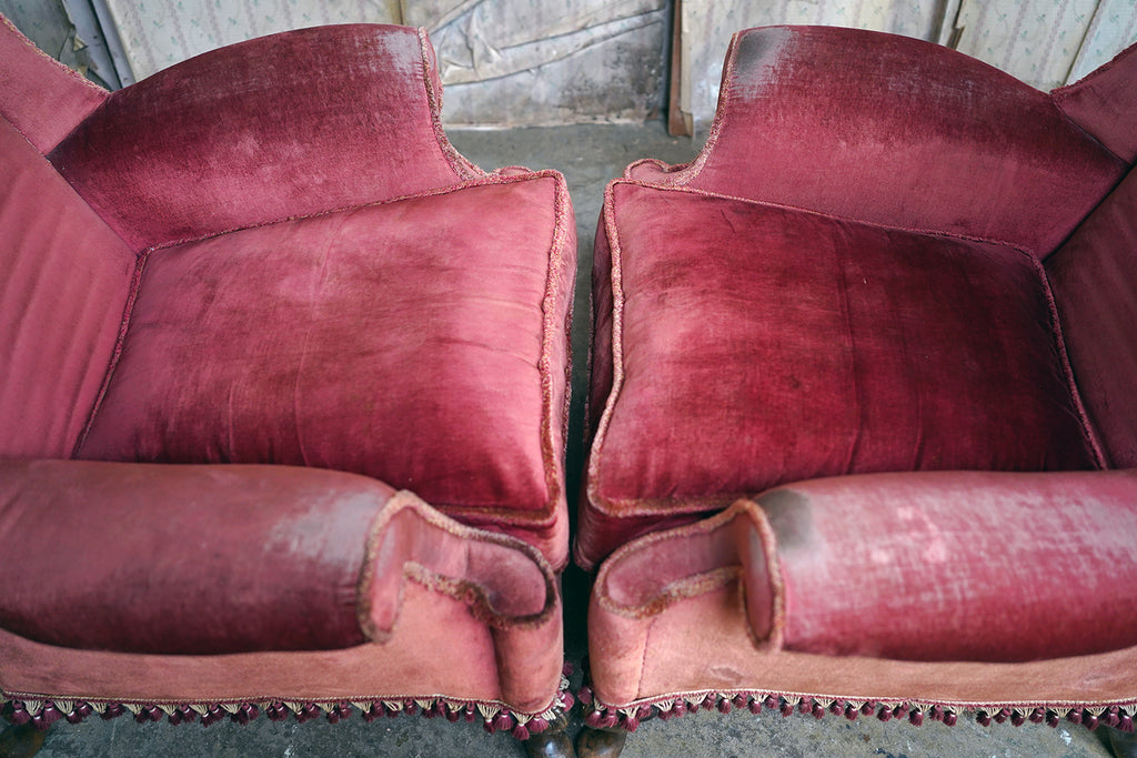 The condition of the chairs is overall fair to good with no structural flaws to report. They are comfortable and stable with the upholstery showing authentic wear to the arms and head rests, but crucially with no holes or tears as photographed. Some of the tasselling is a little loose which can be remedied. They are delightful in that they are un-meddled with.
