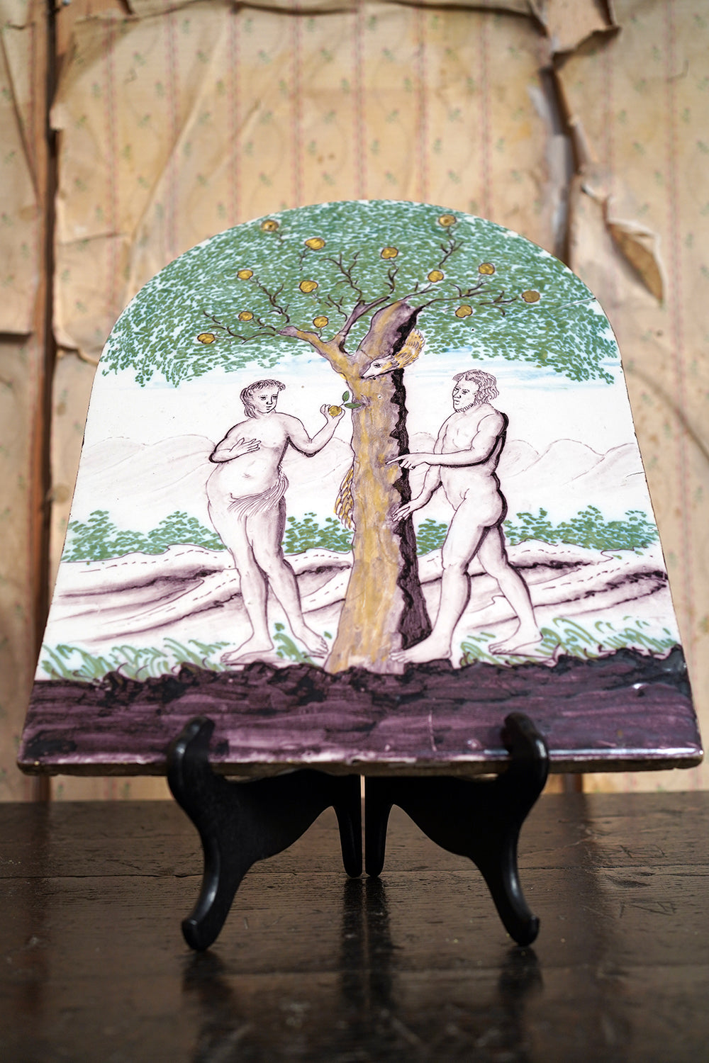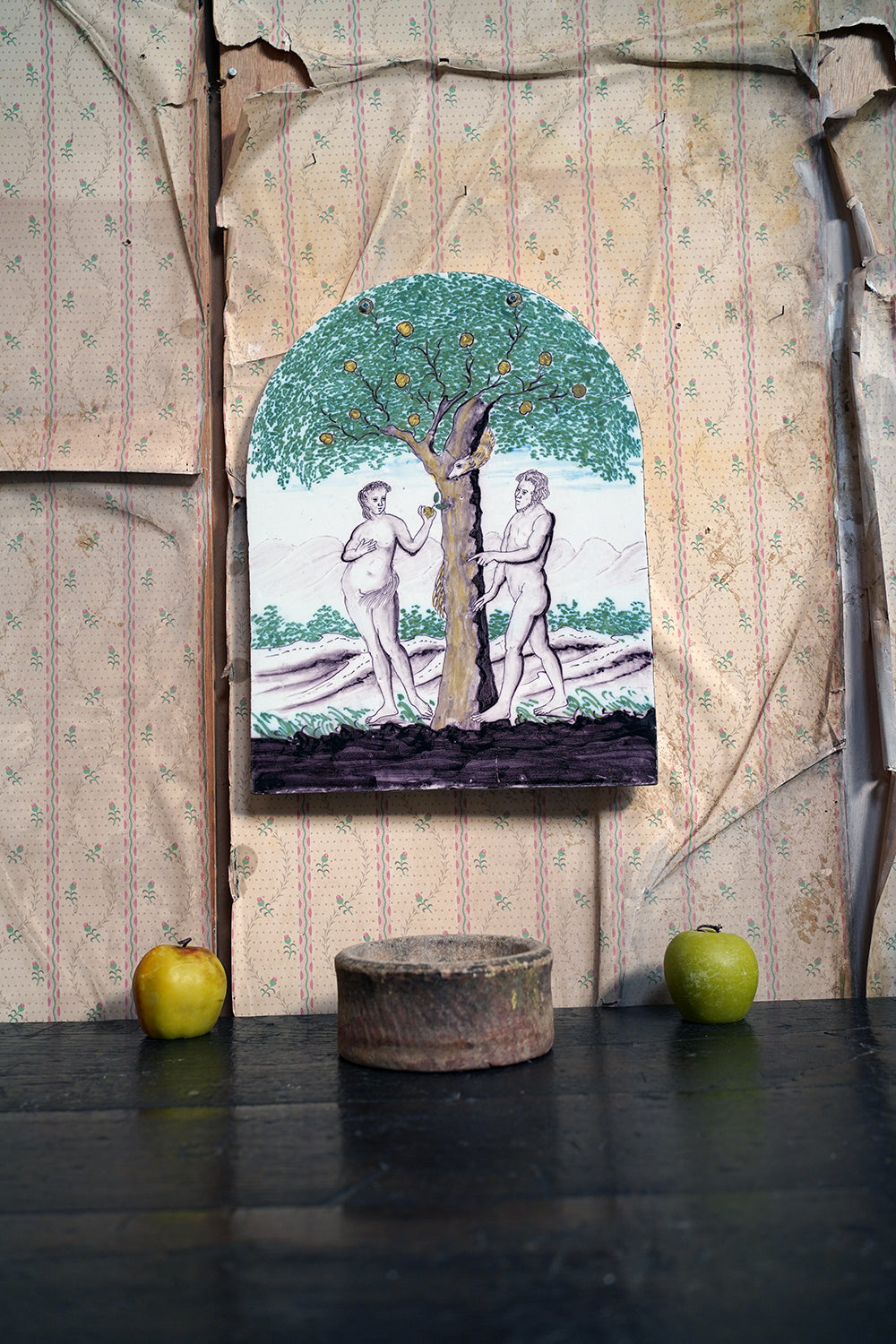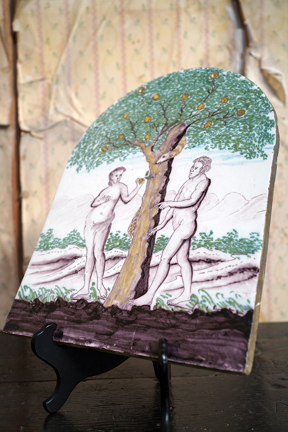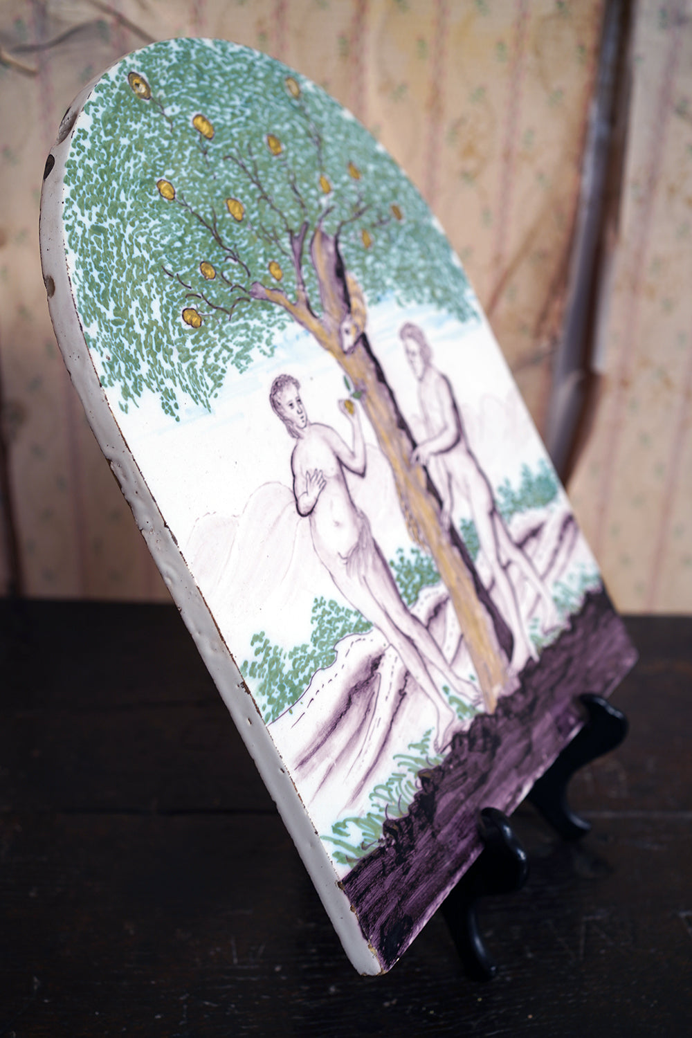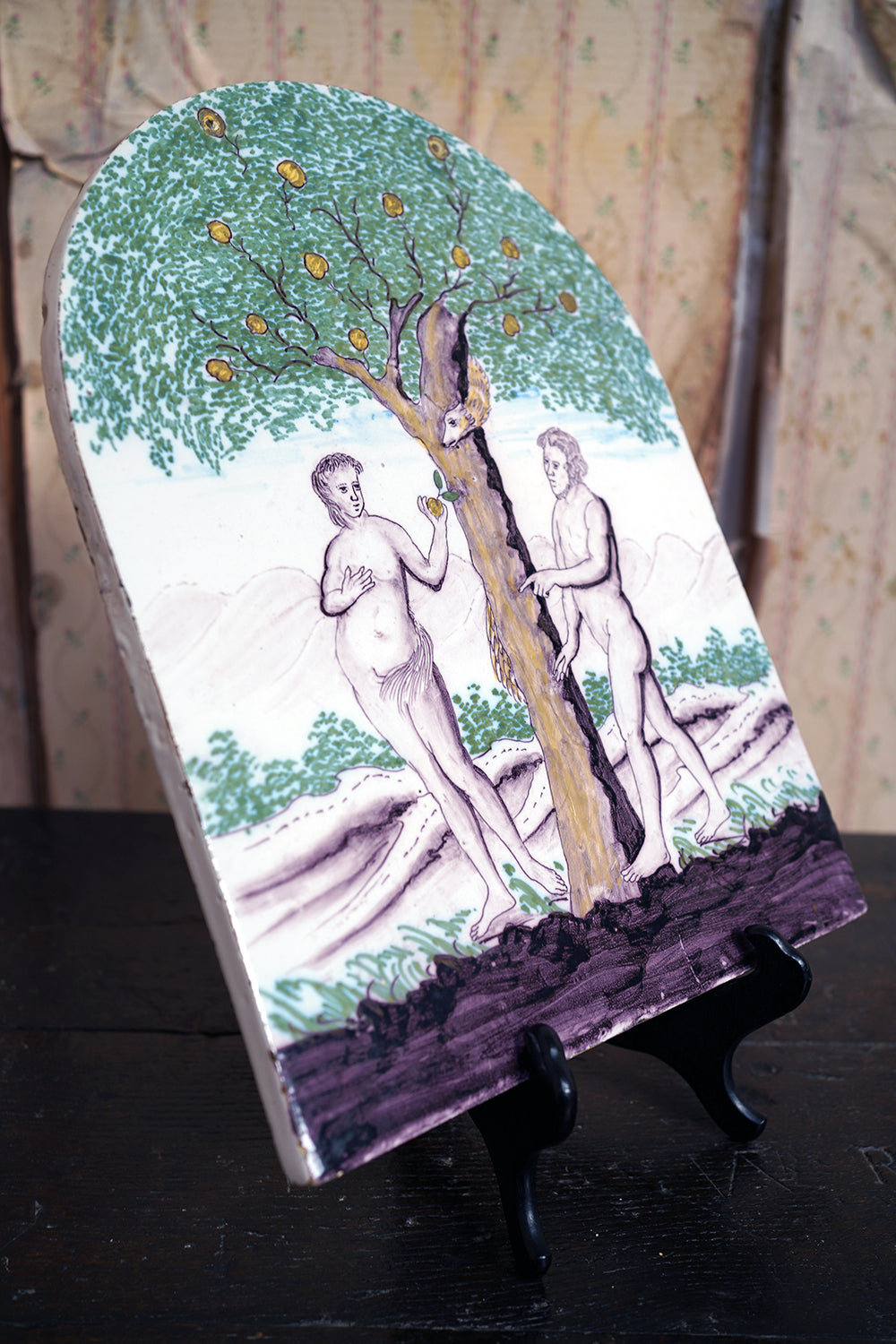 Stylistically and technically the plaque aligns closely with late 18th-century Northern European vernacular wares, most plausibly English or Low Countries in origin. The modelling of the figures, the naïve but assured draughtsmanship, the stylised landscape and foliage, and the symbolic handling of the serpent all point away from Victorian revival work and toward an earlier tradition rooted in provincial tin- or lead-glazed earthenware. The composition itself draws on earlier biblical engravings, filtered through a local workshop hand rather than an academic or factory tradition. Large-scale figural plaques of this subject and period are increasingly scarce, particularly those surviving intact and without later over-painting or restoration. Adam and Eve scenes were favoured for their moral symbolism and domestic resonance, often intended for hanging in private interiors rather than ecclesiastical settings. The arched form, generous scale, and quietly theatrical composition give the plaque a strong pictorial presence, somewhere between devotional object and domestic moralising image.