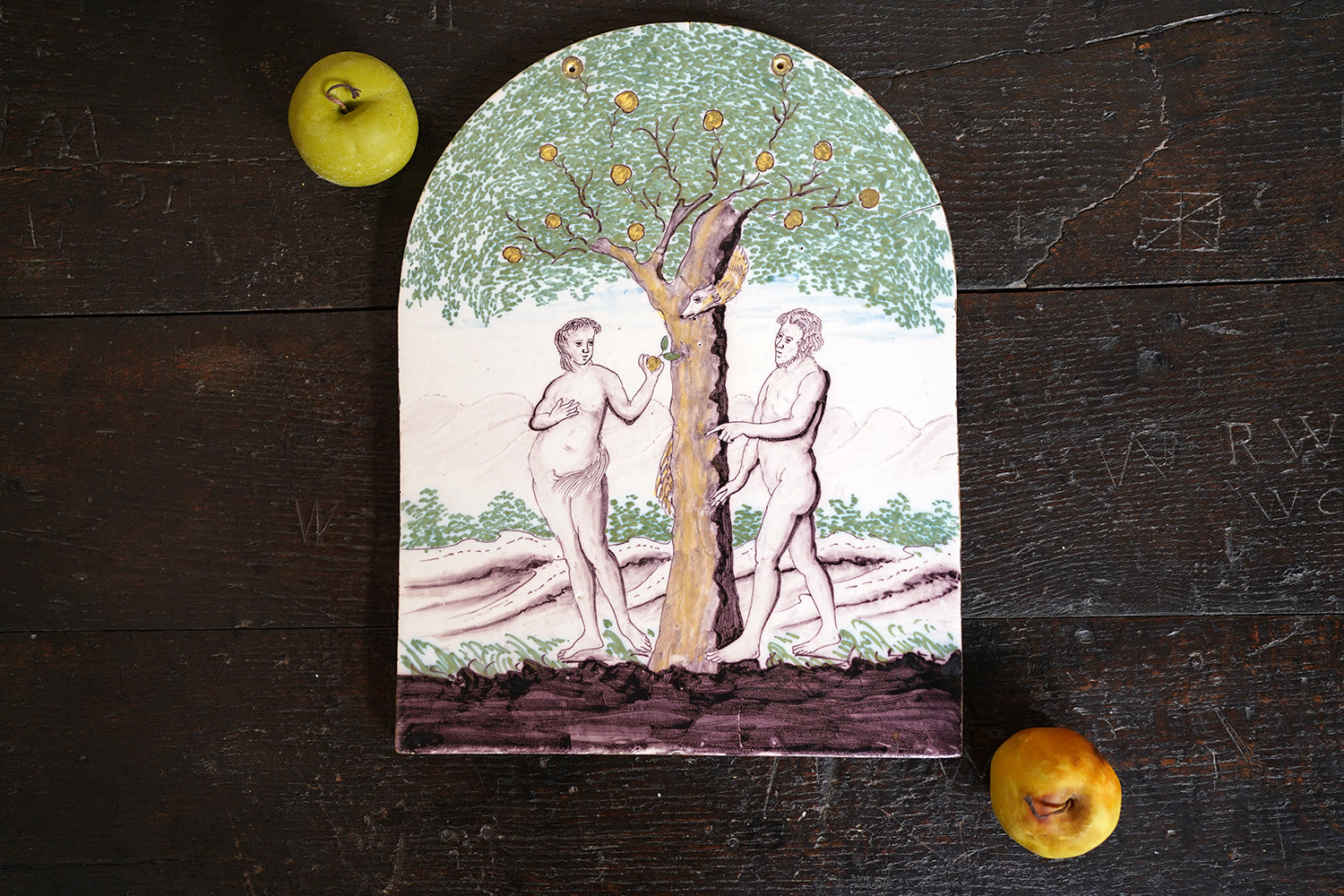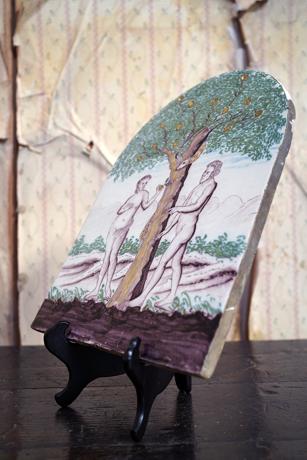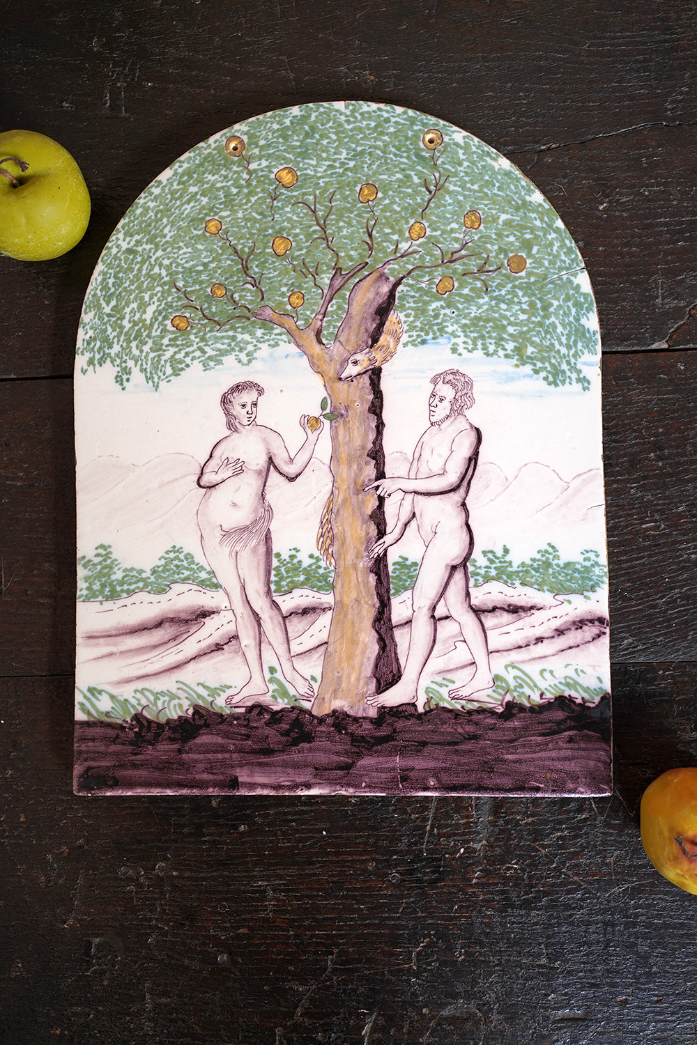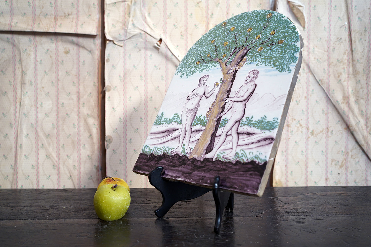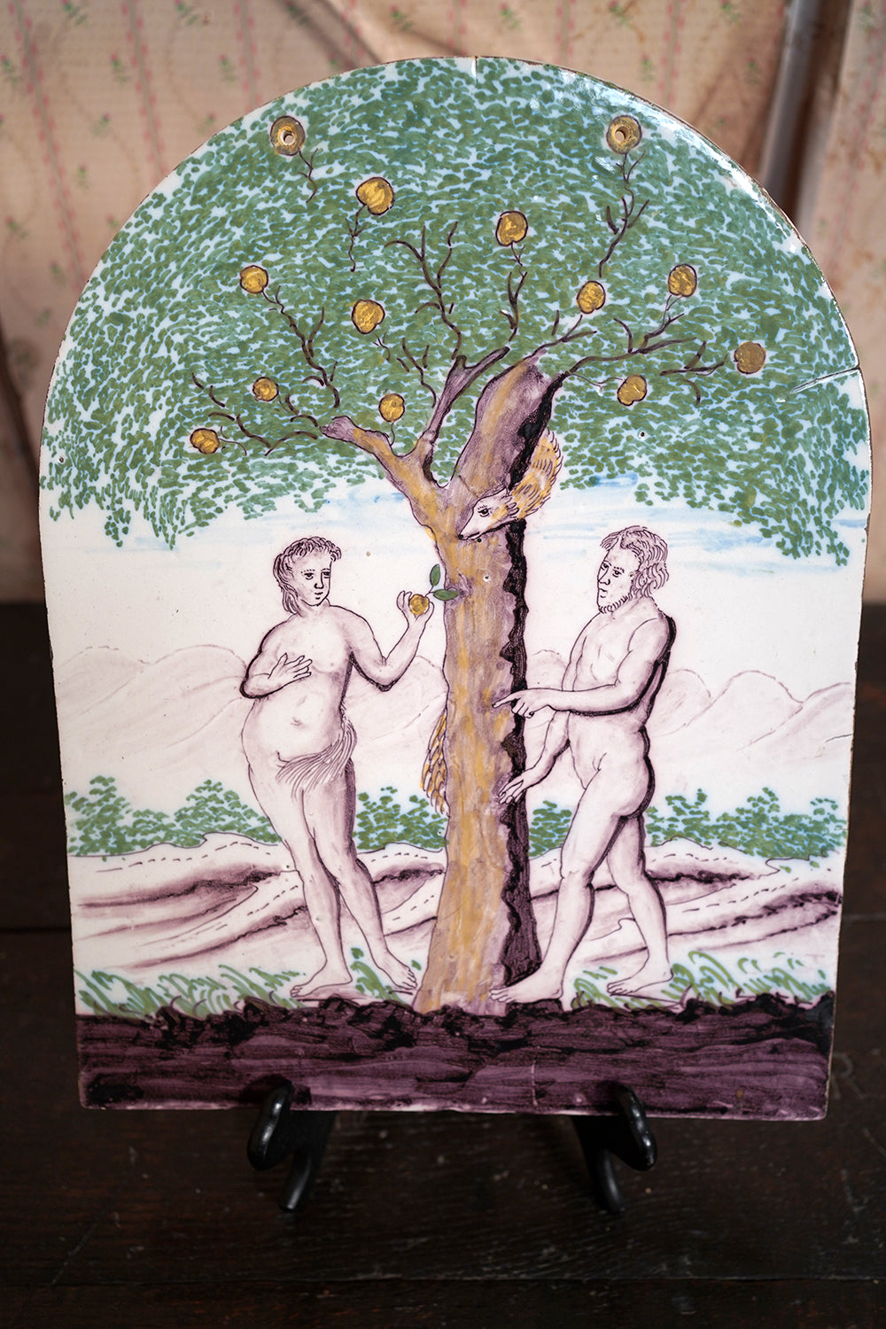 Stylistically and technically the plaque aligns closely with late 18th-century Northern European vernacular wares, most plausibly English or Low Countries in origin. The modelling of the figures, the naïve but assured draughtsmanship, the stylised landscape and foliage, and the symbolic handling of the serpent all point away from Victorian revival work and toward an earlier tradition rooted in provincial tin- or lead-glazed earthenware. The composition itself draws on earlier biblical engravings, filtered through a local workshop hand rather than an academic or factory tradition. Large-scale figural plaques of this subject and period are increasingly scarce, particularly those surviving intact and without later over-painting or restoration. Adam and Eve scenes were favoured for their moral symbolism and domestic resonance, often intended for hanging in private interiors rather than ecclesiastical settings. The arched form, generous scale, and quietly theatrical composition give the plaque a strong pictorial presence, somewhere between devotional object and domestic moralising image.