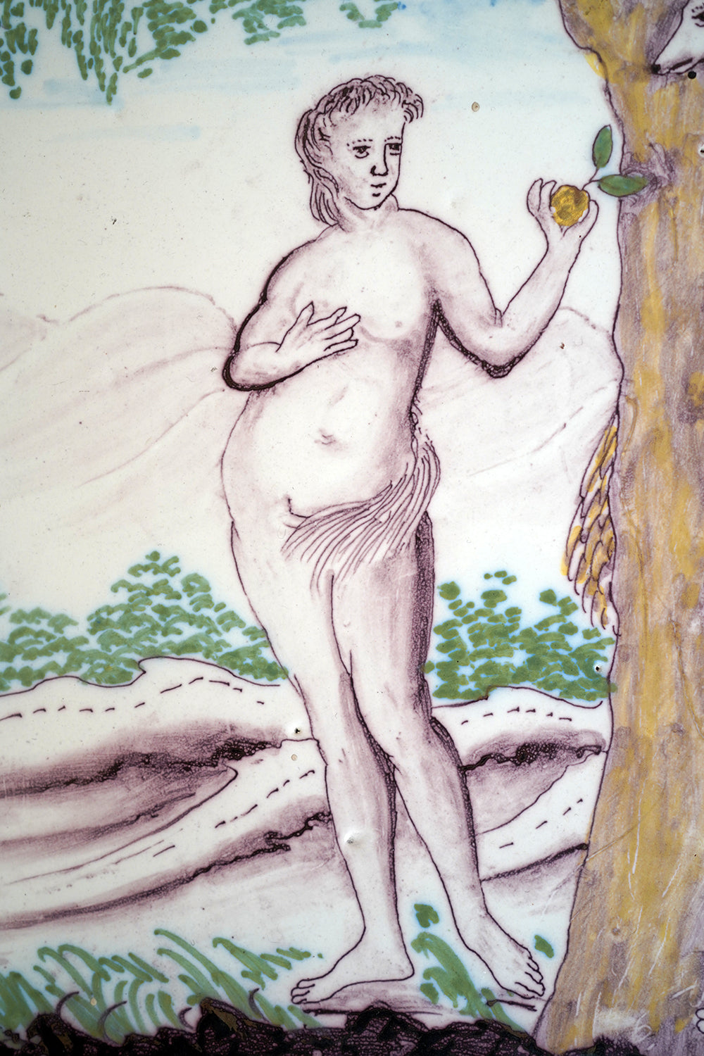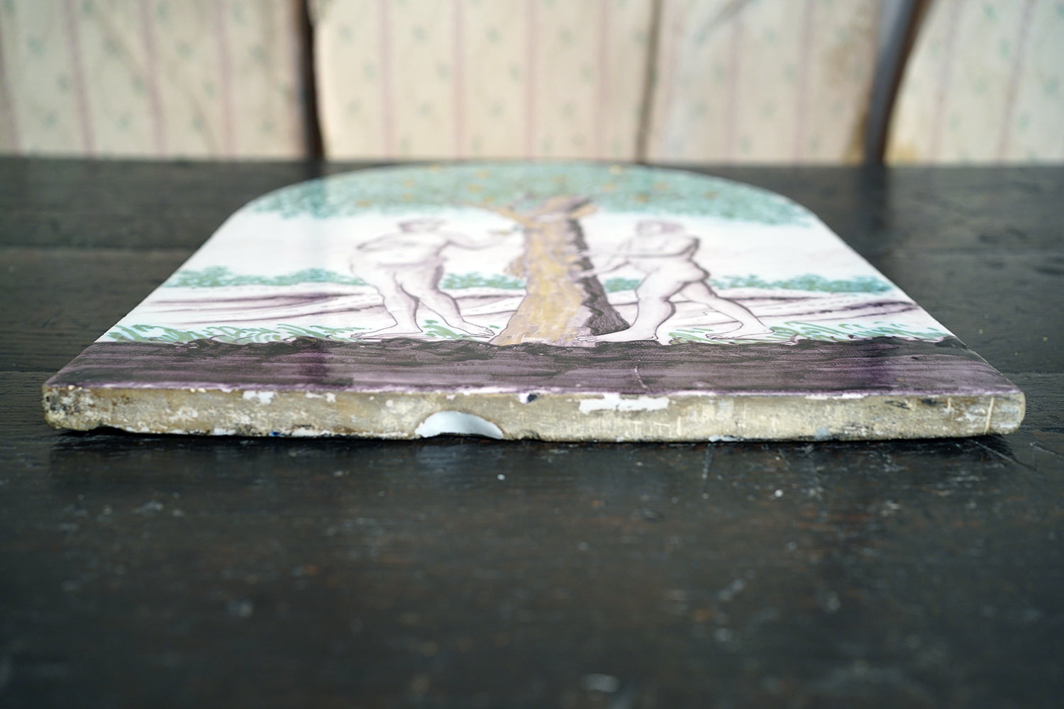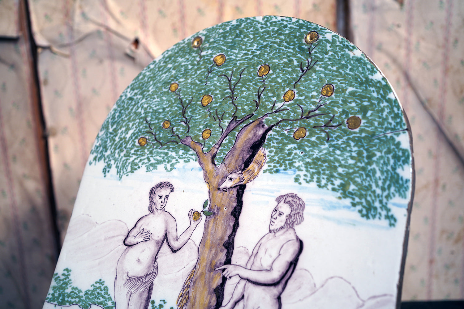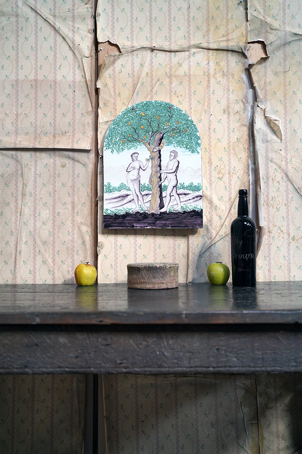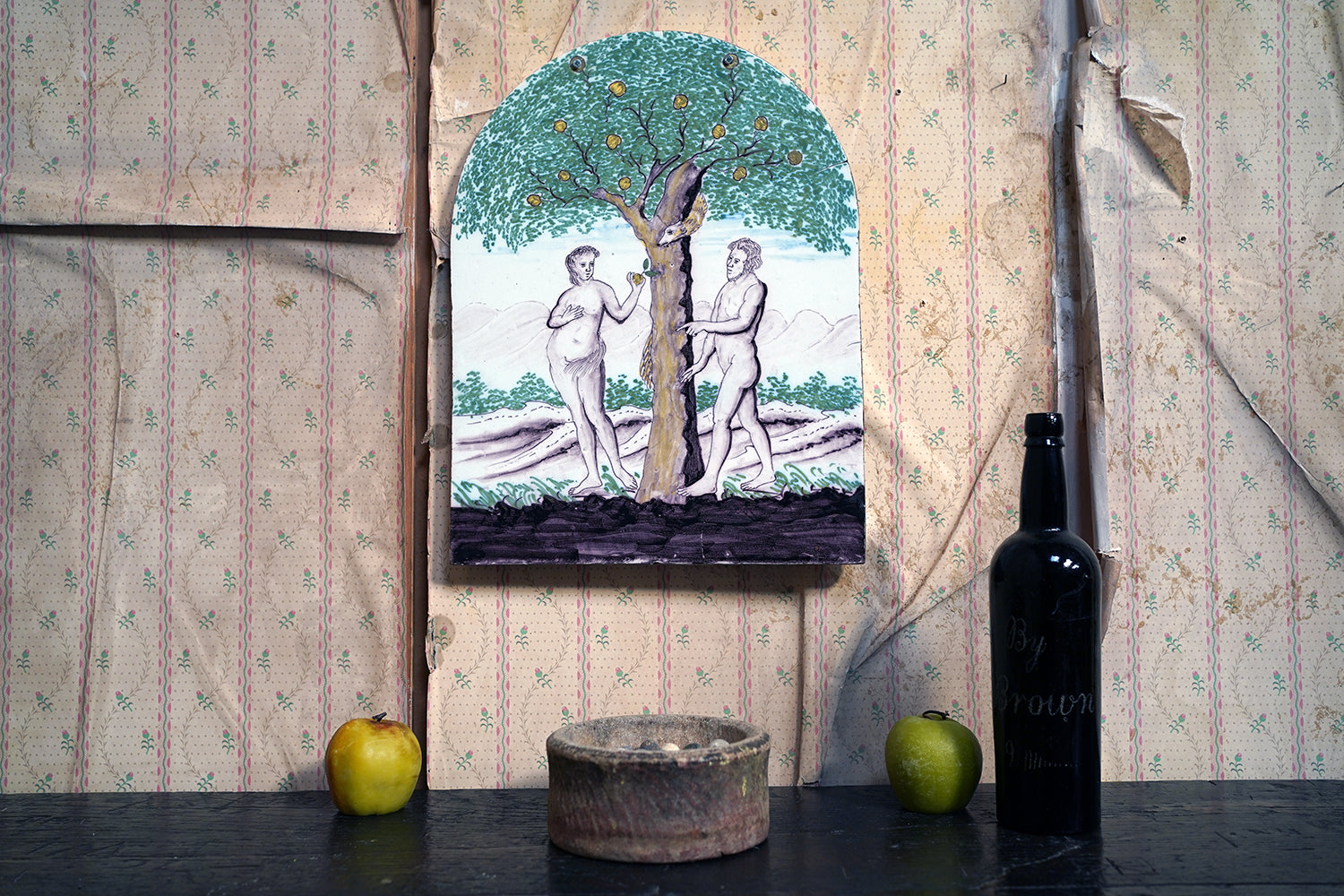 Stylistically and technically the plaque aligns closely with late 18th-century Northern European vernacular wares, most plausibly English or Low Countries in origin. The modelling of the figures, the naïve but assured draughtsmanship, the stylised landscape and foliage, and the symbolic handling of the serpent all point away from Victorian revival work and toward an earlier tradition rooted in provincial tin- or lead-glazed earthenware. The composition itself draws on earlier biblical engravings, filtered through a local workshop hand rather than an academic or factory tradition. Large-scale figural plaques of this subject and period are increasingly scarce, particularly those surviving intact and without later over-painting or restoration. Adam and Eve scenes were favoured for their moral symbolism and domestic resonance, often intended for hanging in private interiors rather than ecclesiastical settings. The arched form, generous scale, and quietly theatrical composition give the plaque a strong pictorial presence, somewhere between devotional object and domestic moralising image.