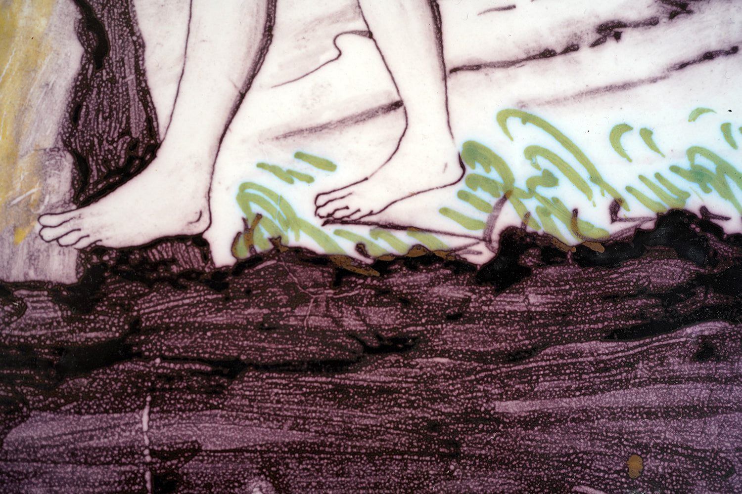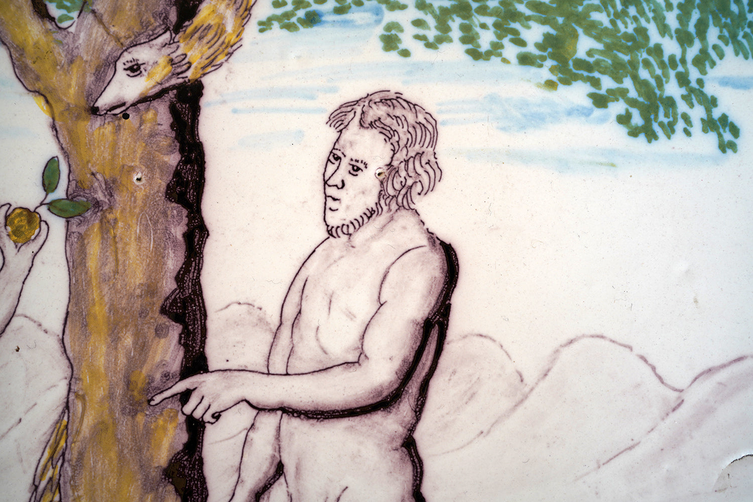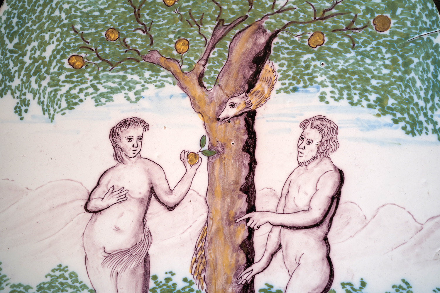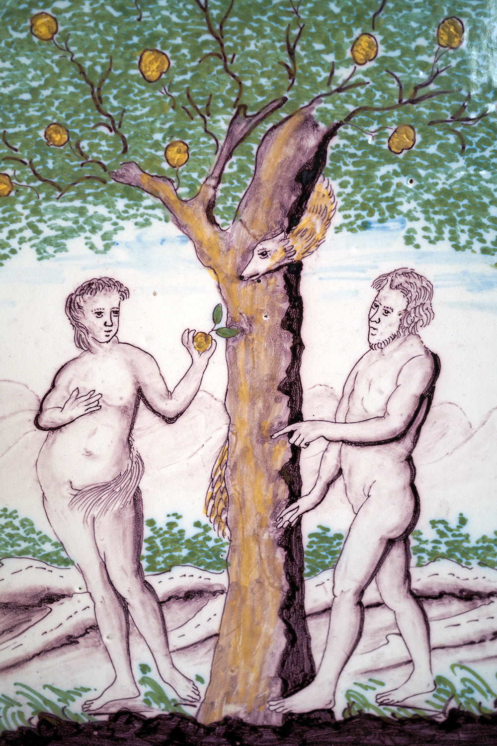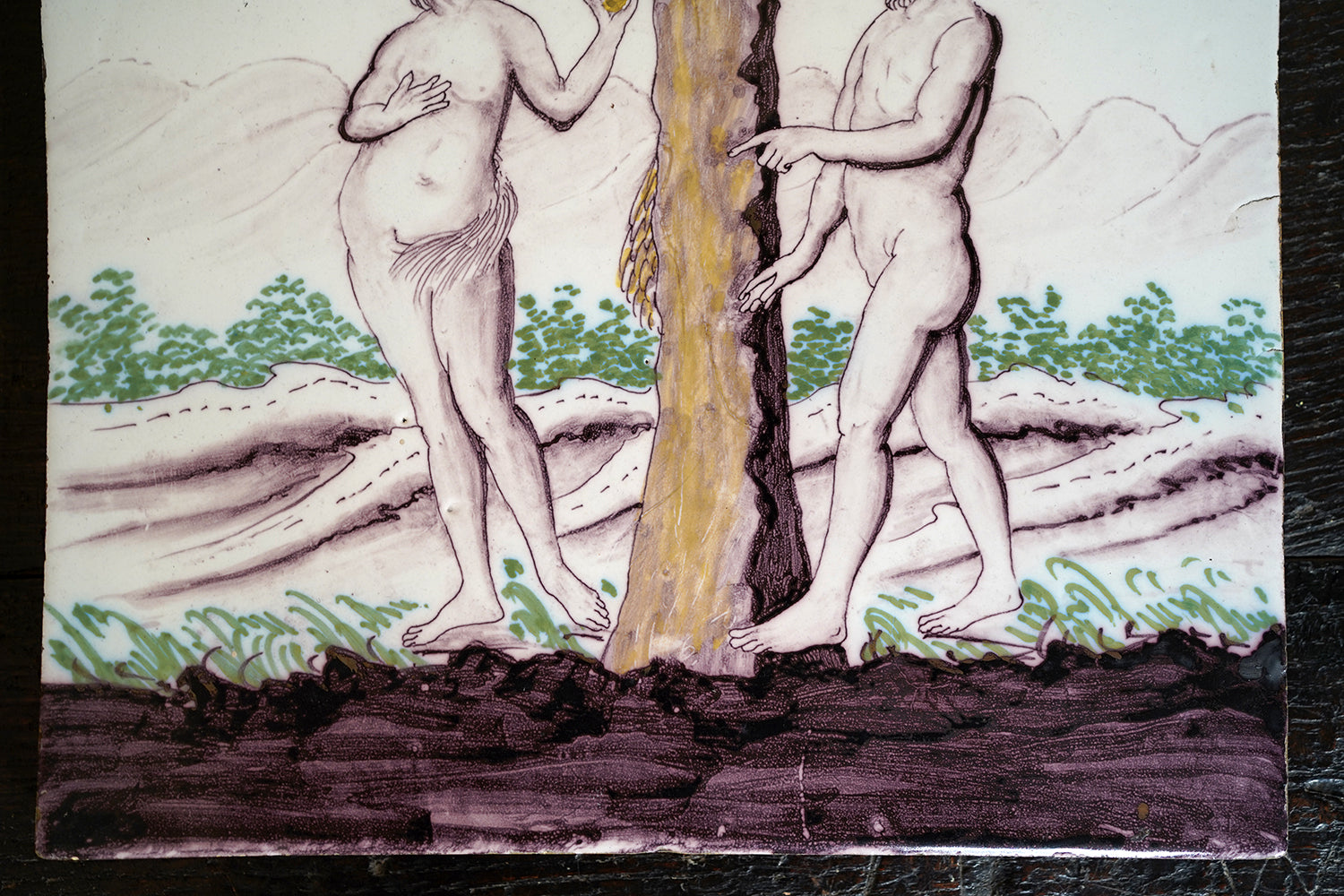 Stylistically and technically the plaque aligns closely with late 18th-century Northern European vernacular wares, most plausibly English or Low Countries in origin. The modelling of the figures, the naïve but assured draughtsmanship, the stylised landscape and foliage, and the symbolic handling of the serpent all point away from Victorian revival work and toward an earlier tradition rooted in provincial tin- or lead-glazed earthenware. The composition itself draws on earlier biblical engravings, filtered through a local workshop hand rather than an academic or factory tradition. Large-scale figural plaques of this subject and period are increasingly scarce, particularly those surviving intact and without later over-painting or restoration. Adam and Eve scenes were favoured for their moral symbolism and domestic resonance, often intended for hanging in private interiors rather than ecclesiastical settings. The arched form, generous scale, and quietly theatrical composition give the plaque a strong pictorial presence, somewhere between devotional object and domestic moralising image.