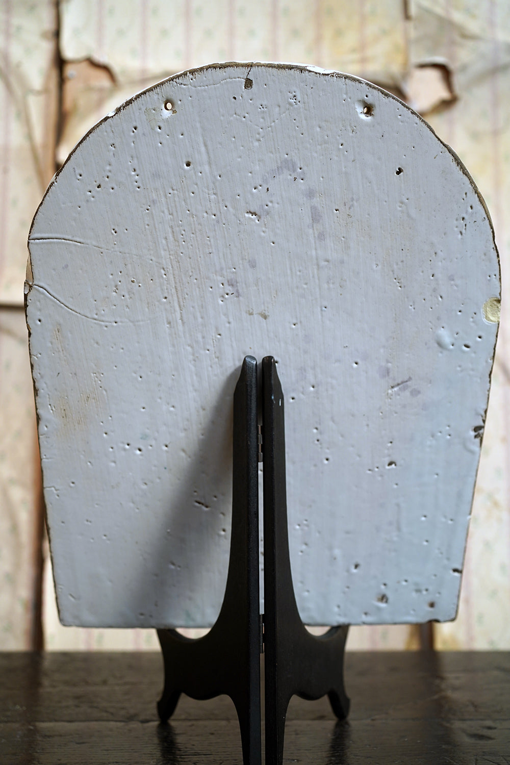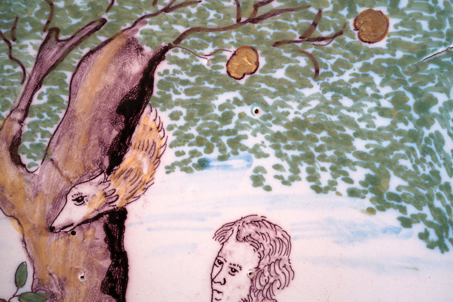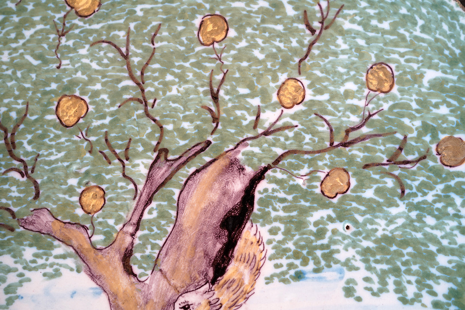 The plaque is of substantial thickness and weight, with hand-finished with slightly irregular edges and a fully glazed reverse. The reverse surface shows characteristic firing imperfections, kiln spur marks, glaze pooling and minor pin-holing consistent with 18th-century production, together with scattered old edge losses and abrasions commensurate with age. There are no later mounts or interventions evident other than two holes drilled for wall mounting, and the overall condition is honest and unforced, with wear that reinforces rather than detracts from its age and character. There are small factory cracks to the rim and a small factory hole to the tree trunk.