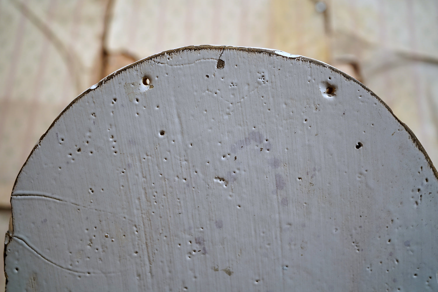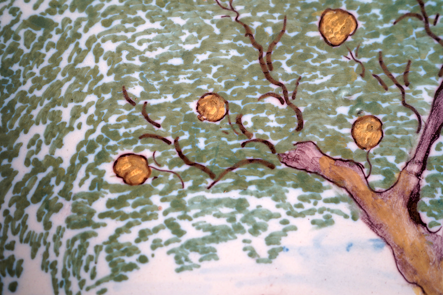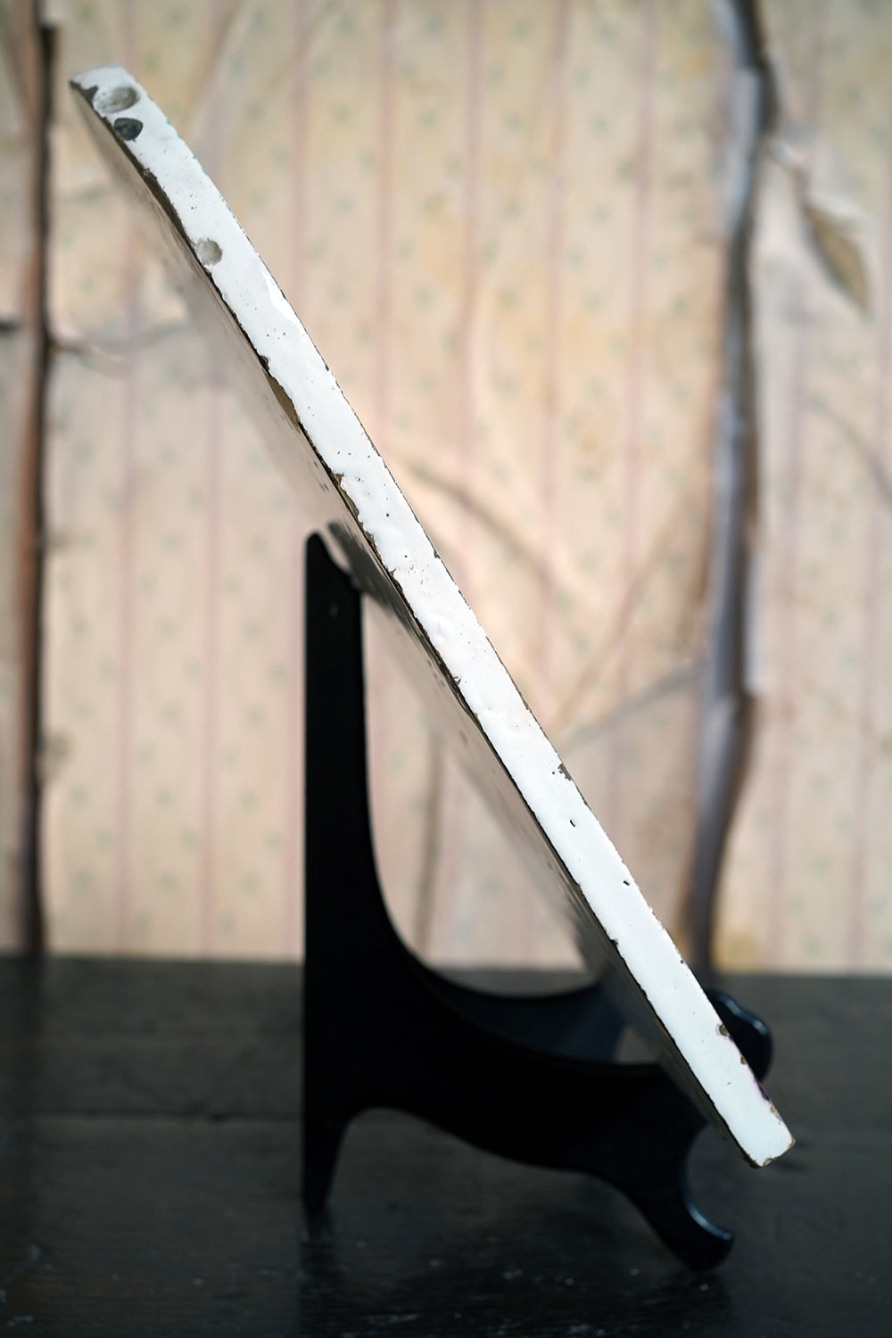 The plaque is of substantial thickness and weight, with hand-finished with slightly irregular edges and a fully glazed reverse. The reverse surface shows characteristic firing imperfections, kiln spur marks, glaze pooling and minor pin-holing consistent with 18th-century production, together with scattered old edge losses and abrasions commensurate with age. There are no later mounts or interventions evident other than two holes drilled for wall mounting, and the overall condition is honest and unforced, with wear that reinforces rather than detracts from its age and character. There are small factory cracks to the rim and a small factory hole to the tree trunk.