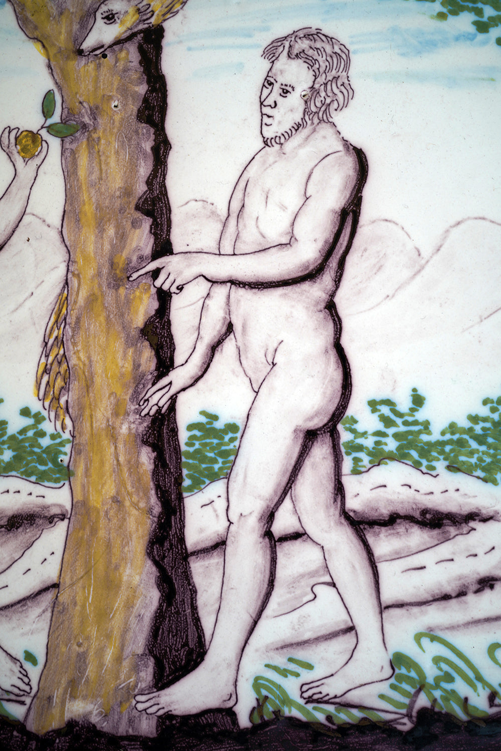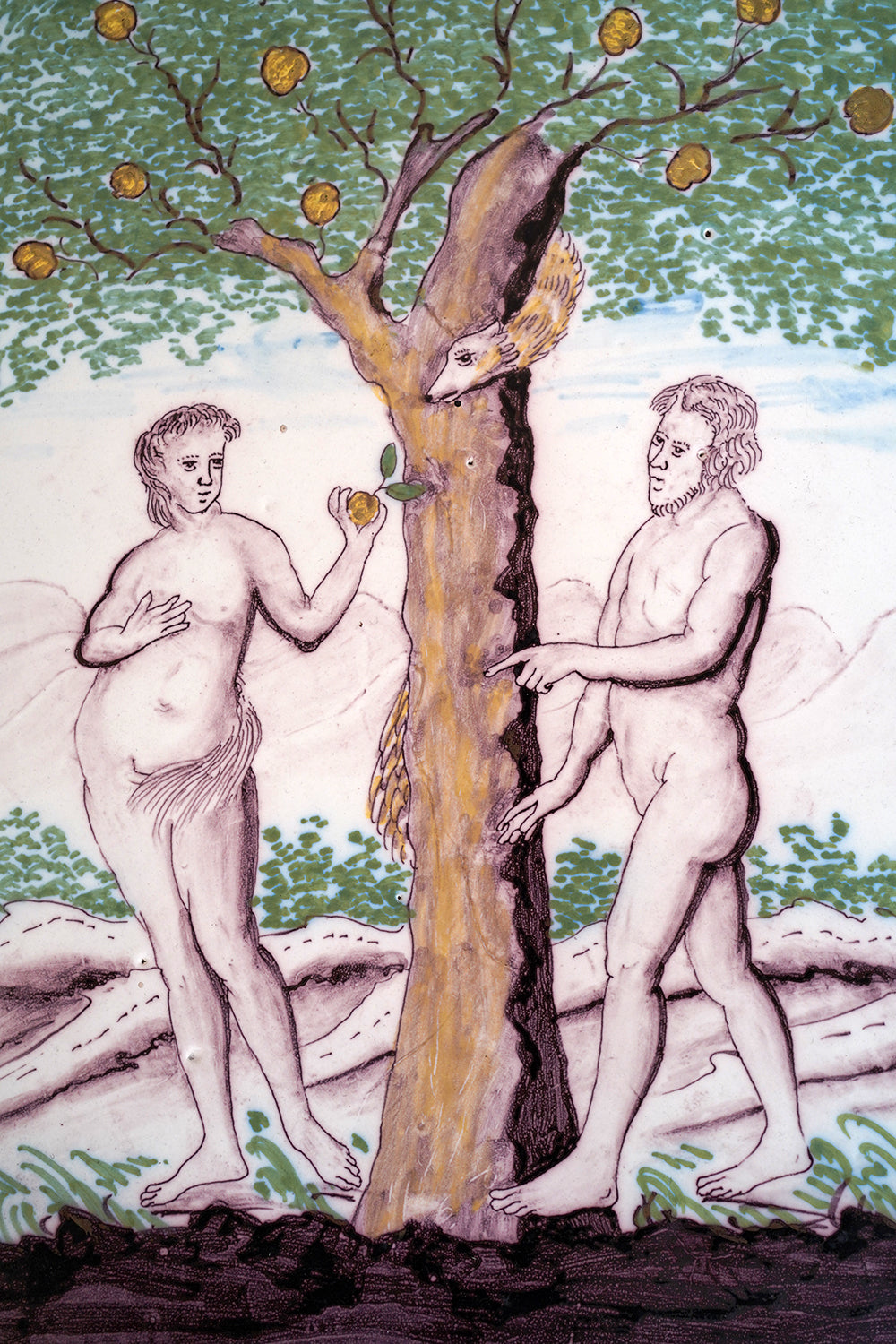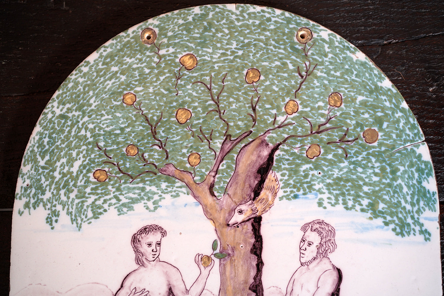 A large and evocative late eighteenth century earthenware plaque of arched form depicting Adam and Eve beneath the Tree of Knowledge, shown at the moment of temptation, with Eve holding the apple and Adam reaching toward the trunk, the serpent emerging from within the split tree, the scene rendered in a restrained palette of manganese brown, copper green and soft ochre to a pale ground, the figures outlined with a confident but naïve hand and surviving from Georgian period England.