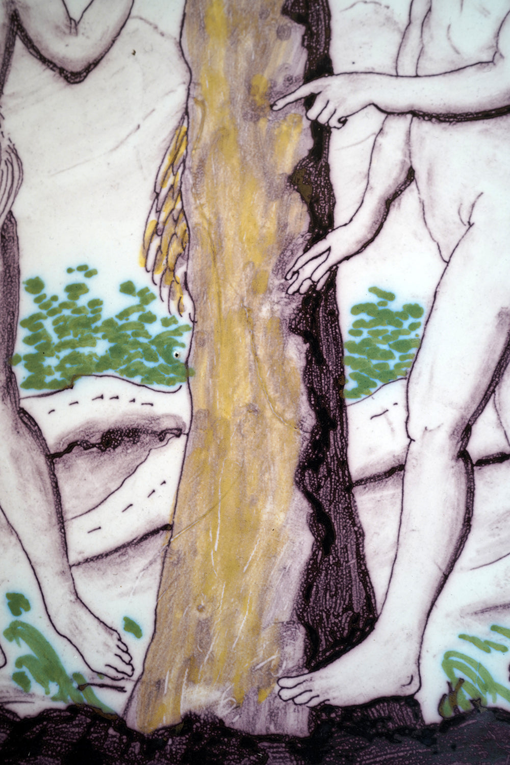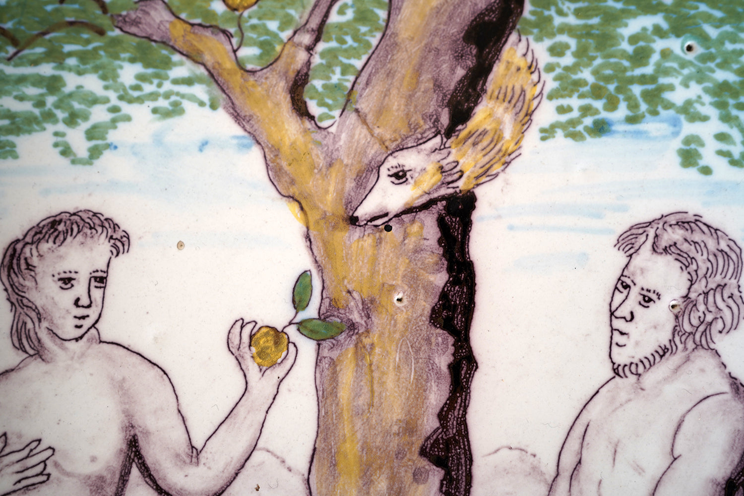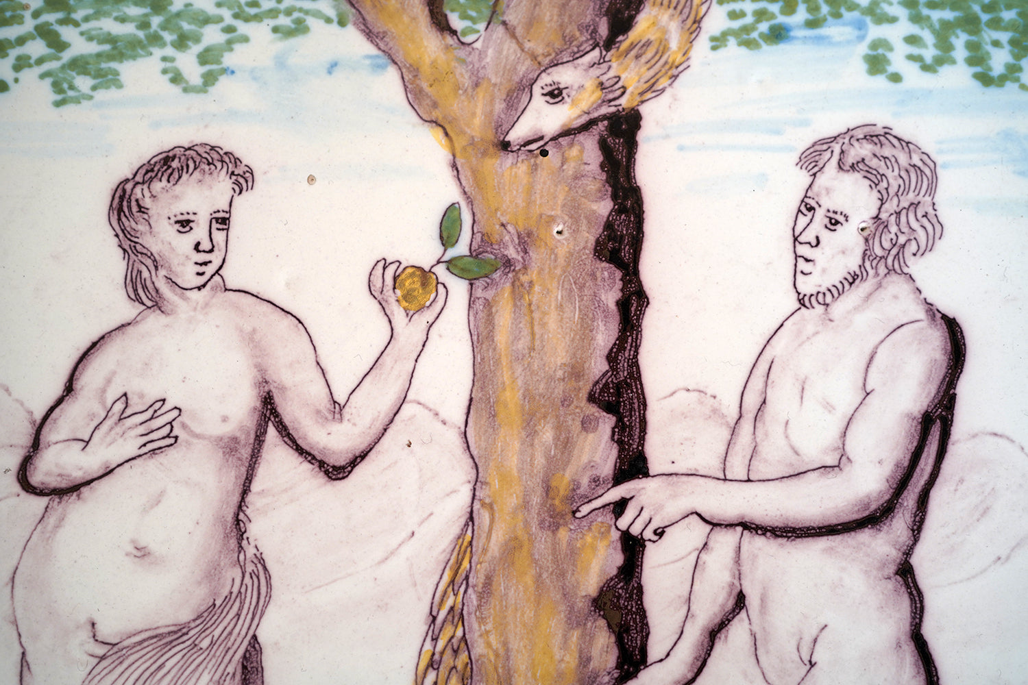 A large and evocative late eighteenth century earthenware plaque of arched form depicting Adam and Eve beneath the Tree of Knowledge, shown at the moment of temptation, with Eve holding the apple and Adam reaching toward the trunk, the serpent emerging from within the split tree, the scene rendered in a restrained palette of manganese brown, copper green and soft ochre to a pale ground, the figures outlined with a confident but naïve hand and surviving from Georgian period England.