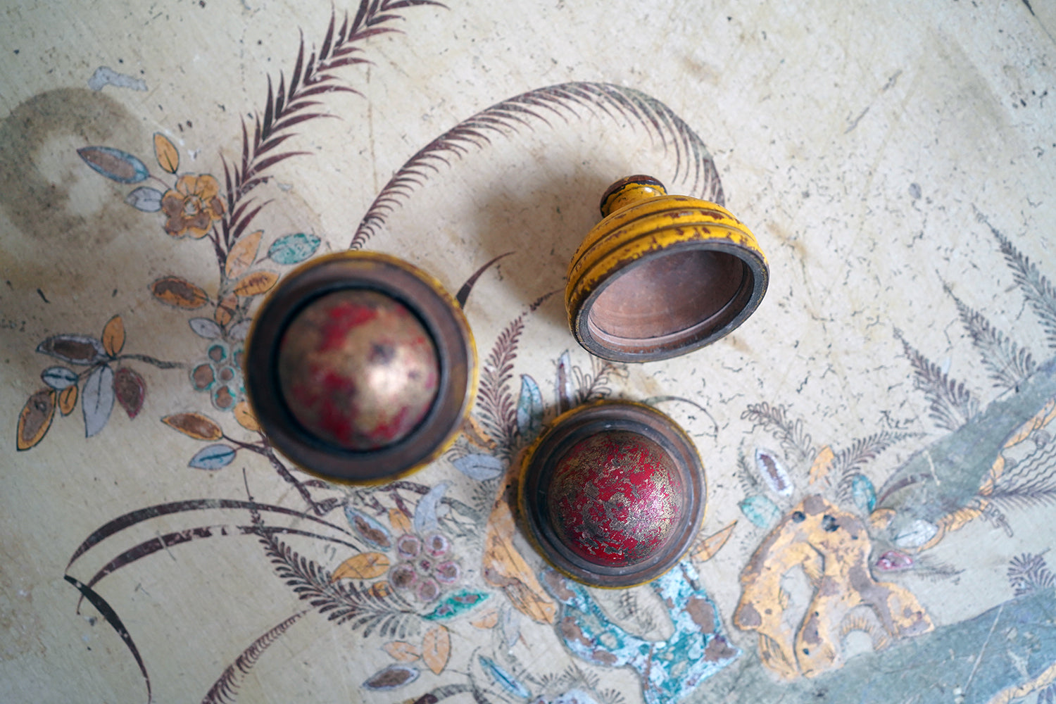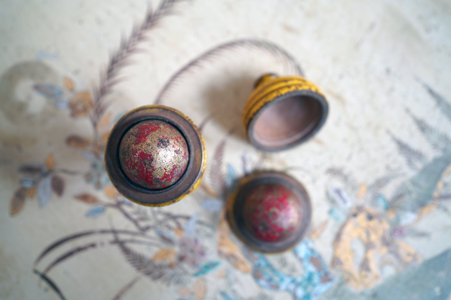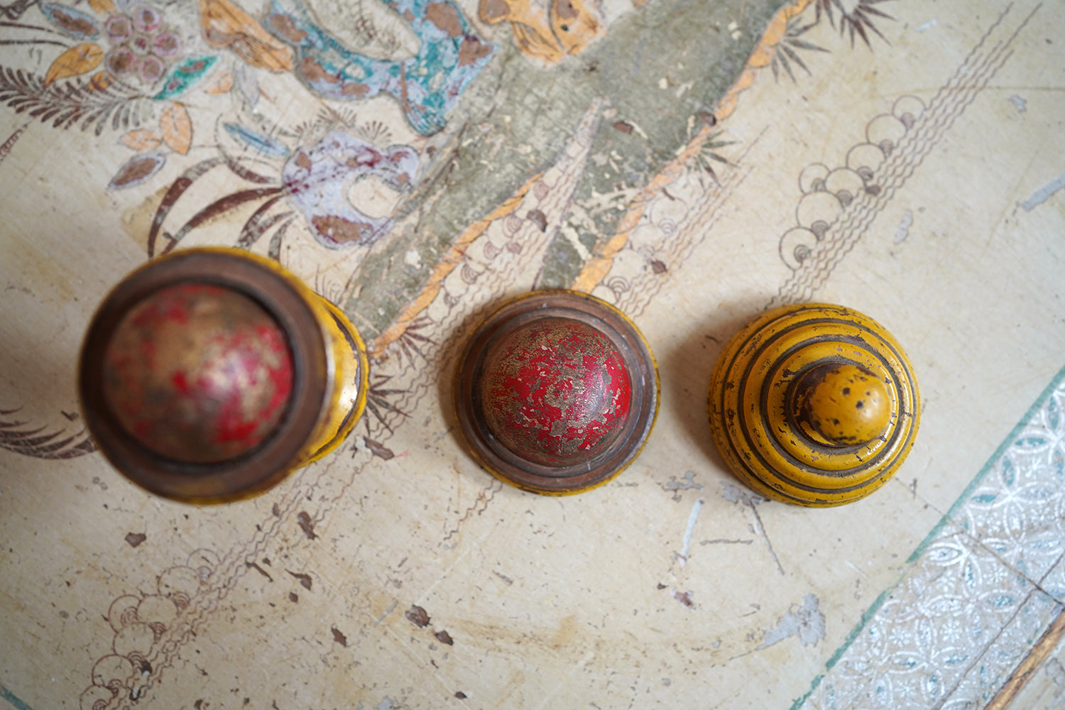 Such disappearing ball tricks were staples of Victorian and Edwardian parlour magic; intimate entertainments performed around the domestic table. Crafted in treen and brightly painted for theatrical impact, they combine craftsmanship with deception. Today they read as both toy and object; primitive, graphic and unexpectedly modern in their bold colour blocking. It is rare now to find tricks of this age especially being in complete and honest condition.