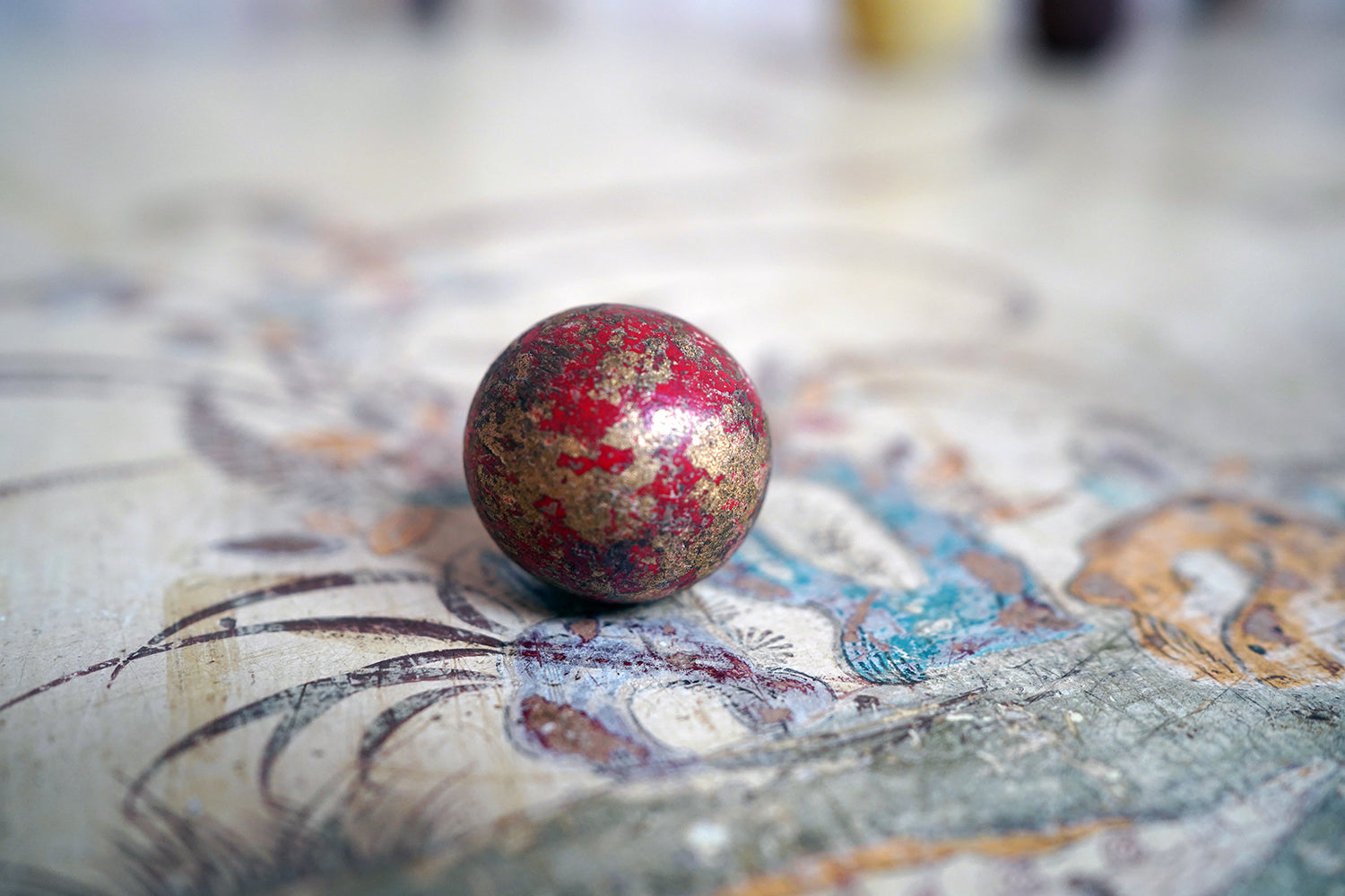 The trick shows heavy, honest wear throughout with flecked paint loss and patination to both the yellow exterior and red ball, revealing layers of age and handling making it supremely decorative. The mechanism remains intact and operable.