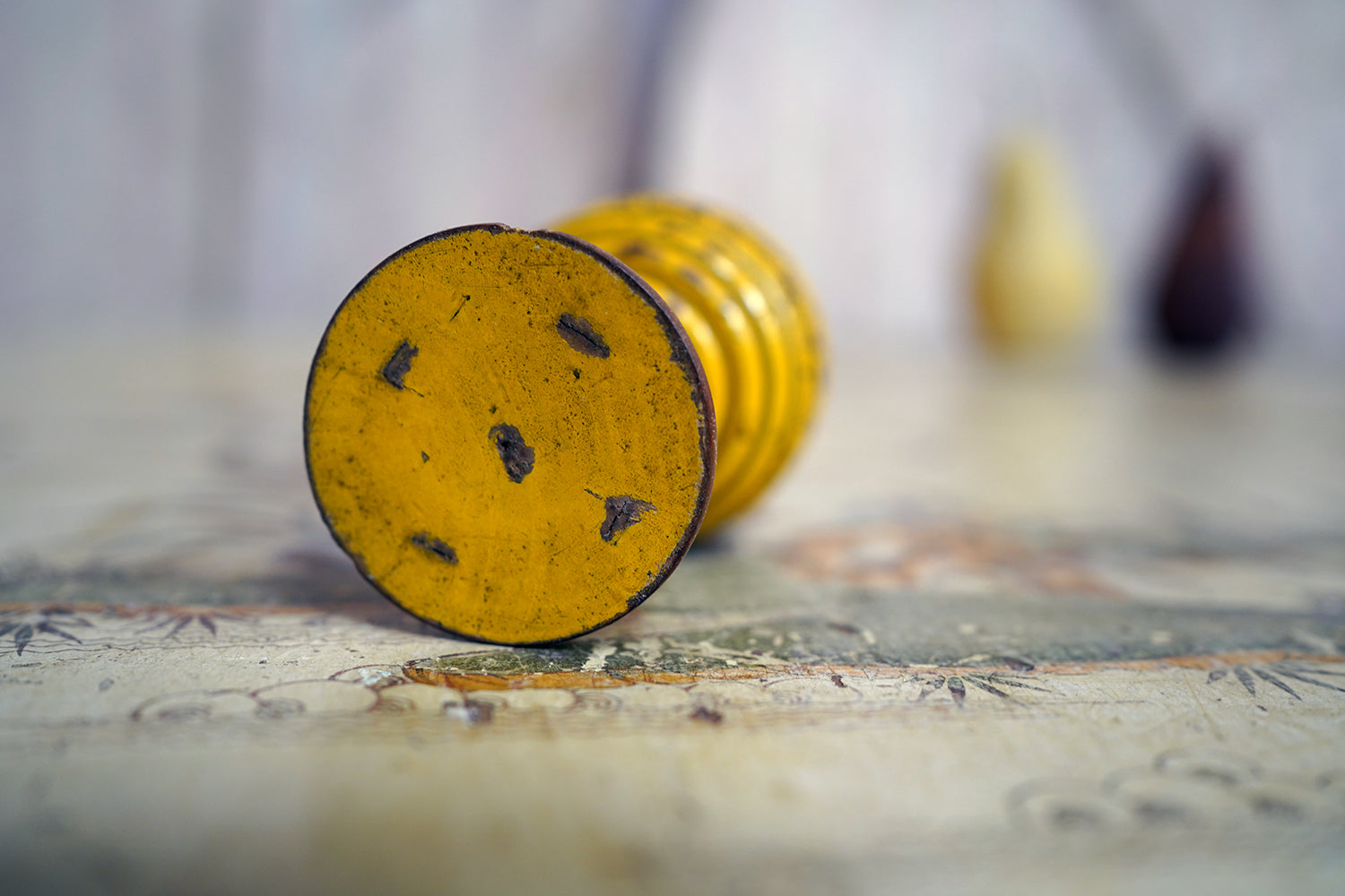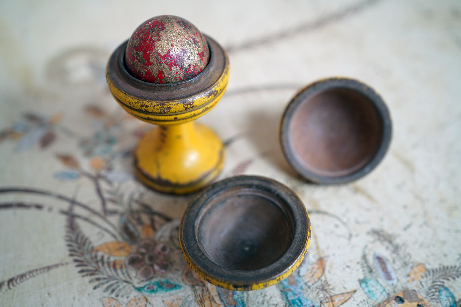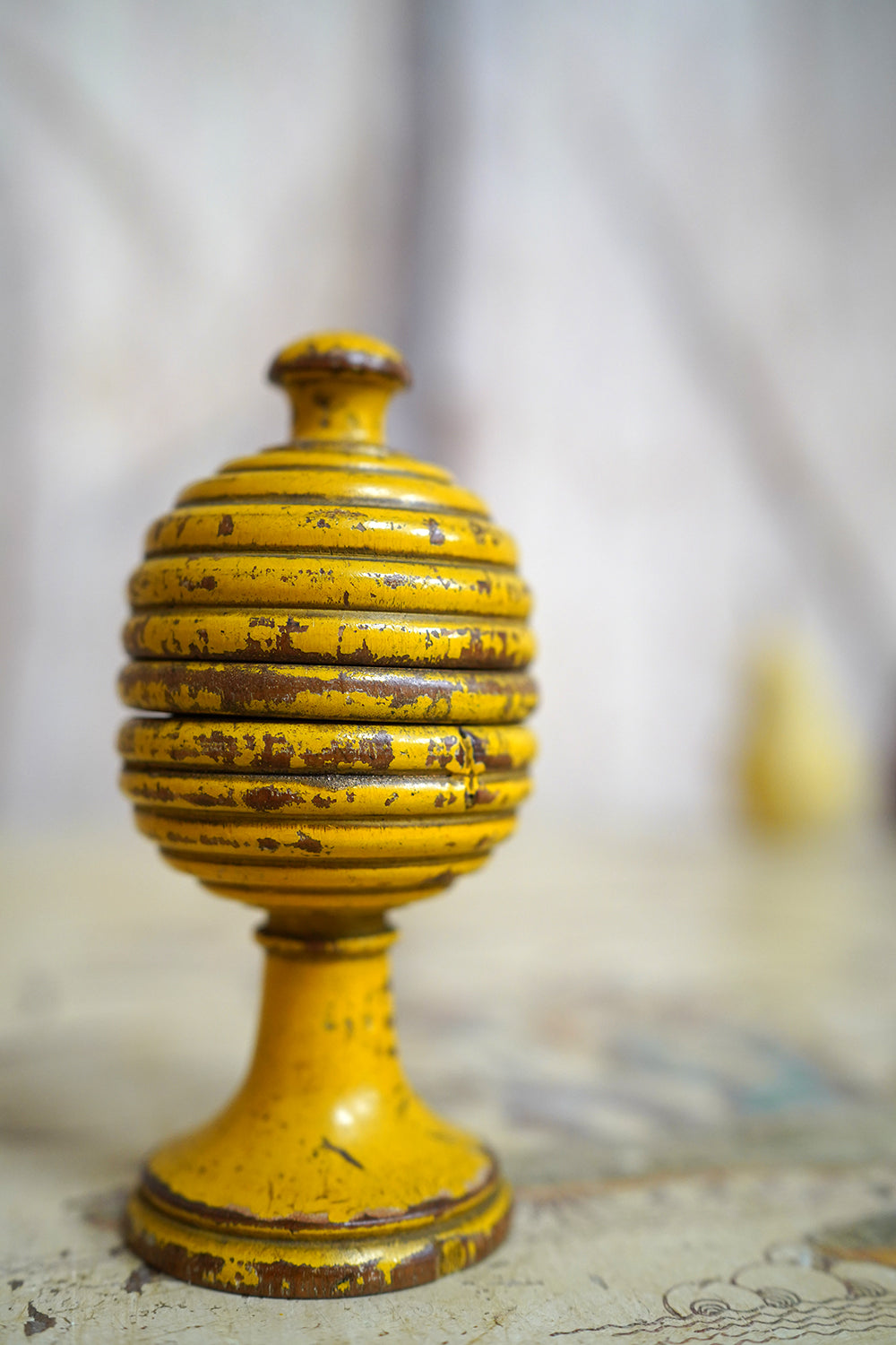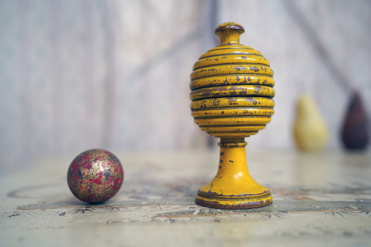 The delightful antique treen conjuring trick, formed as a turned wooden pedestal cup being bee-hive turned to a knop finial, painted in vibrant yellow, to a pressed metal interior concealing a red internal ball which appears and disappears through sleight-of-hand mechanics, whilst the second interior houses the half red painted ball; the whole with a wonderful sculptural and decorative quality and surviving from the zeniths of the nineteenth century.