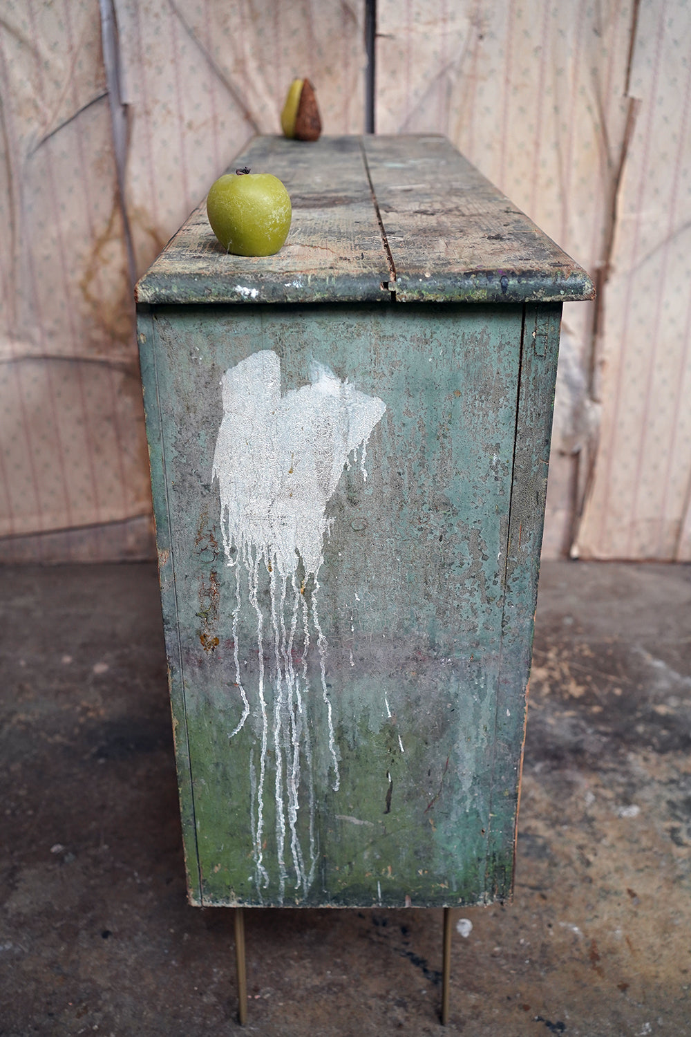 The condition is appropriately rustic and entirely in keeping with its character. The painted surface shows age, abrasions and areas of wear throughout, all contributing to its appeal rather than detracting from it. The interior is plain and functional with fixed shelving. The white painted knob handles are later replacements, though remain in keeping, whilst the top bears the expected scuffs and marks of a working life; a surface that tells its story without apology.