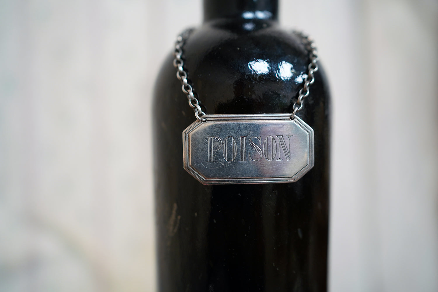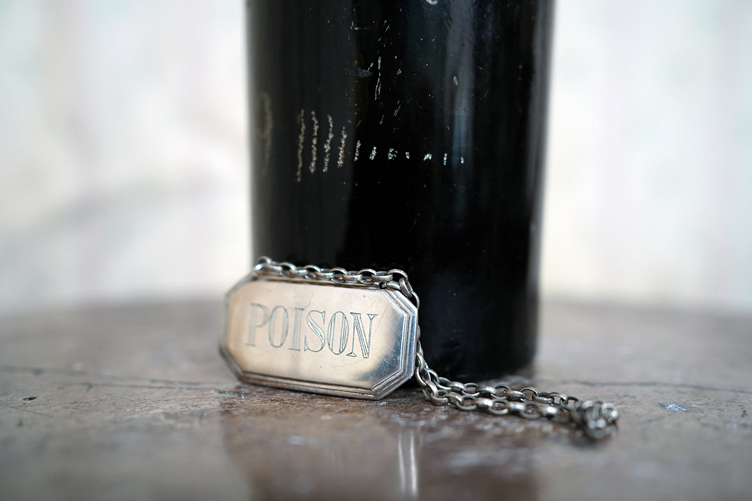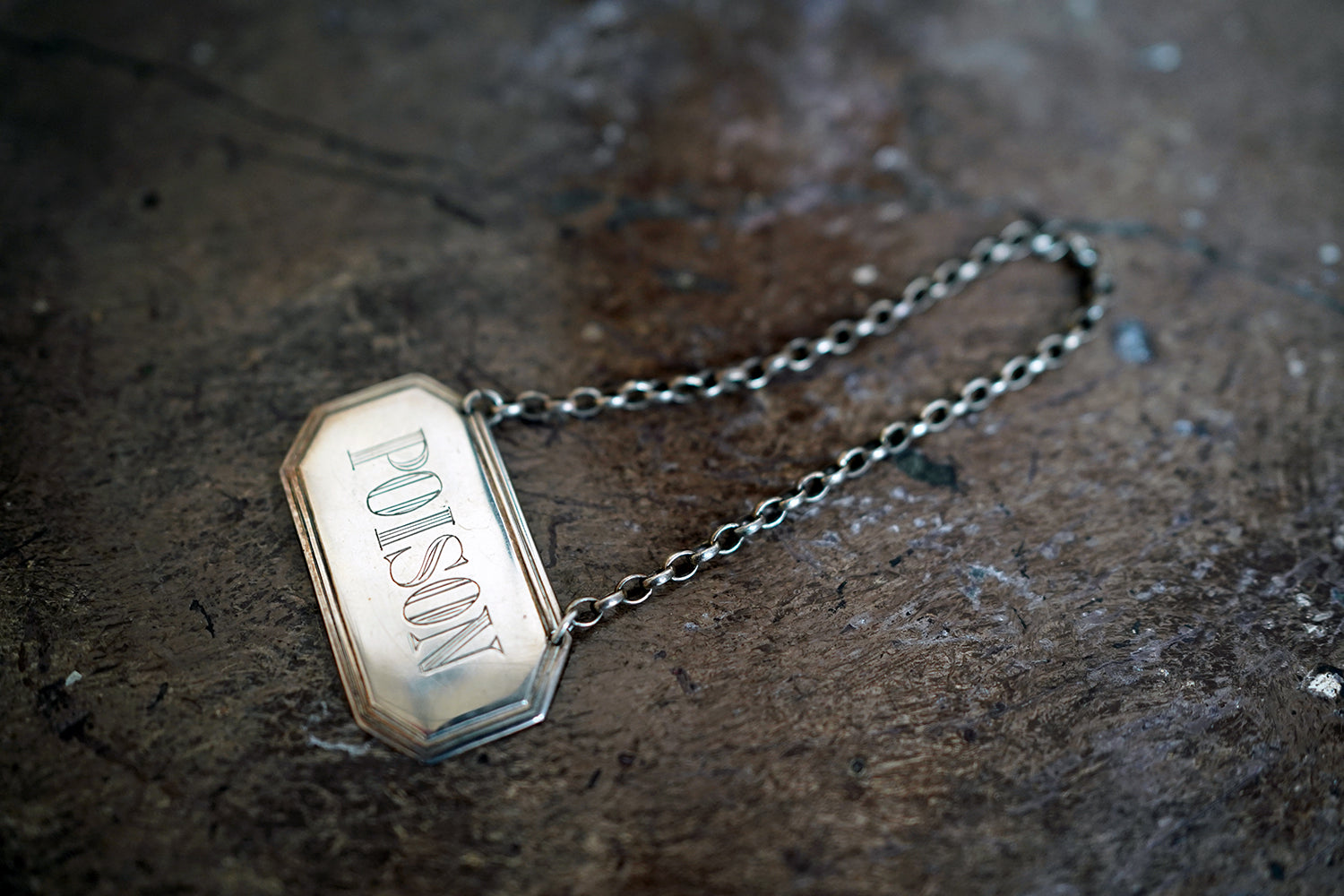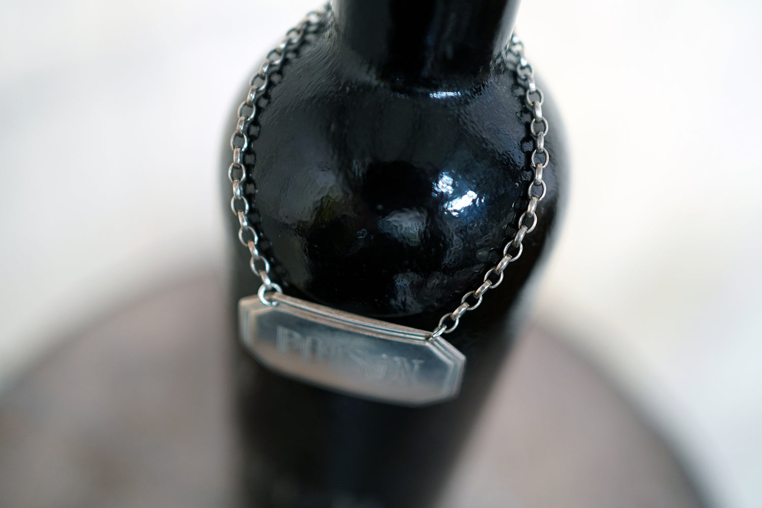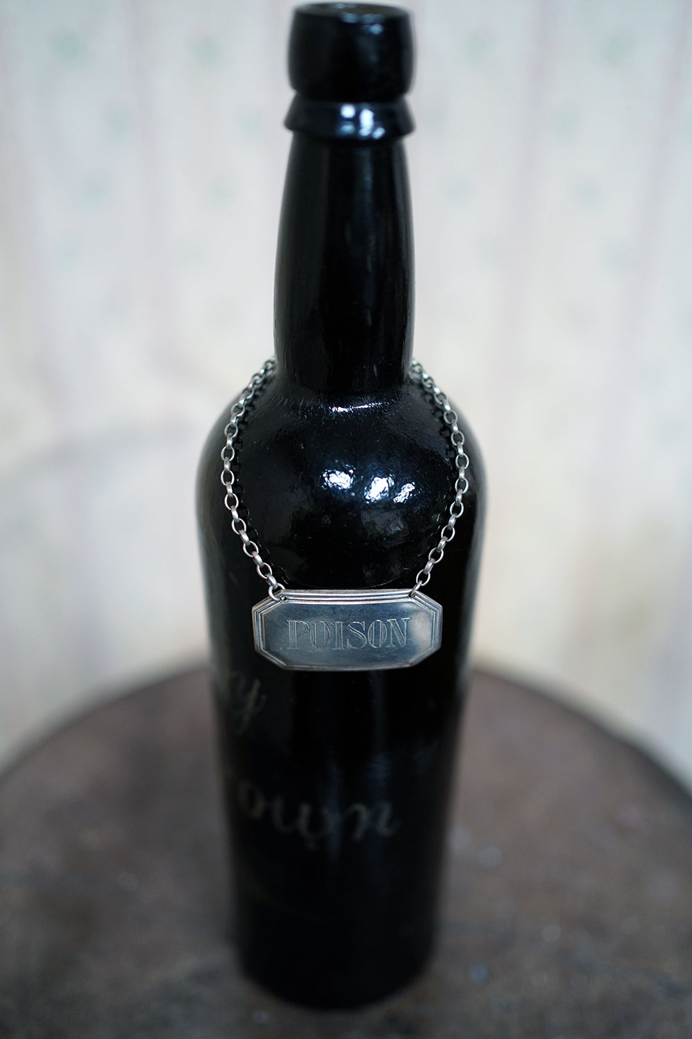 Silver decanter labels, or bottle tickets, emerged in the 18th century as practical identifiers for cut-glass decanters, particularly within grand dining settings. By the later twentieth century they were revived in sterling silver as both functional and novelty pieces. Examples bearing standard spirits are commonplace; however those engraved with more unusual or macabre wording such as “Poison” were produced in far smaller numbers and have a distinctly decorative rather than practical intent. The choice of word nods to apothecary traditions, gothic interiors, and the long-standing aesthetic fascination with danger and the forbidden. Though modest in scale, it carries undeniable theatrical presence; a small object with disproportionate impact.