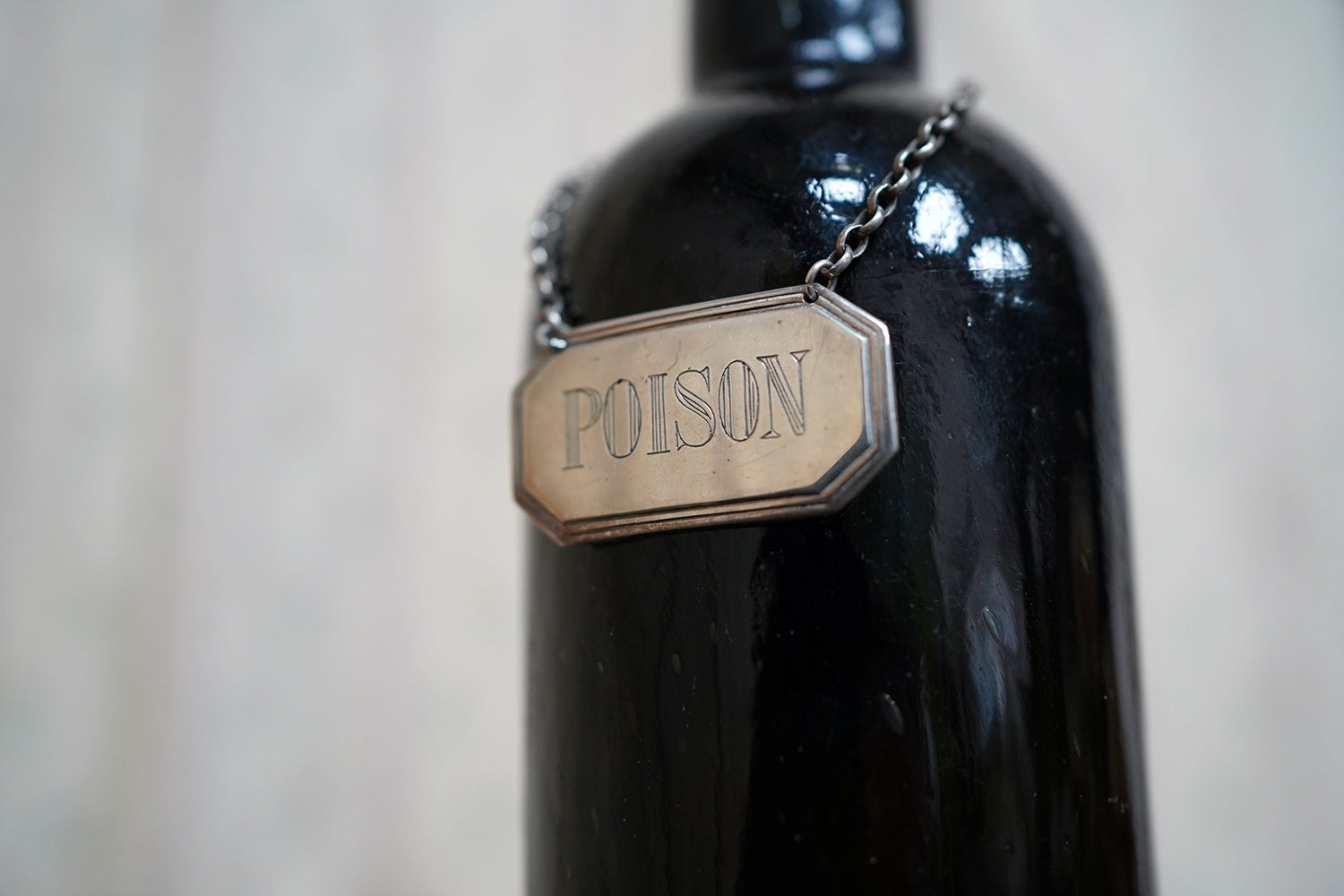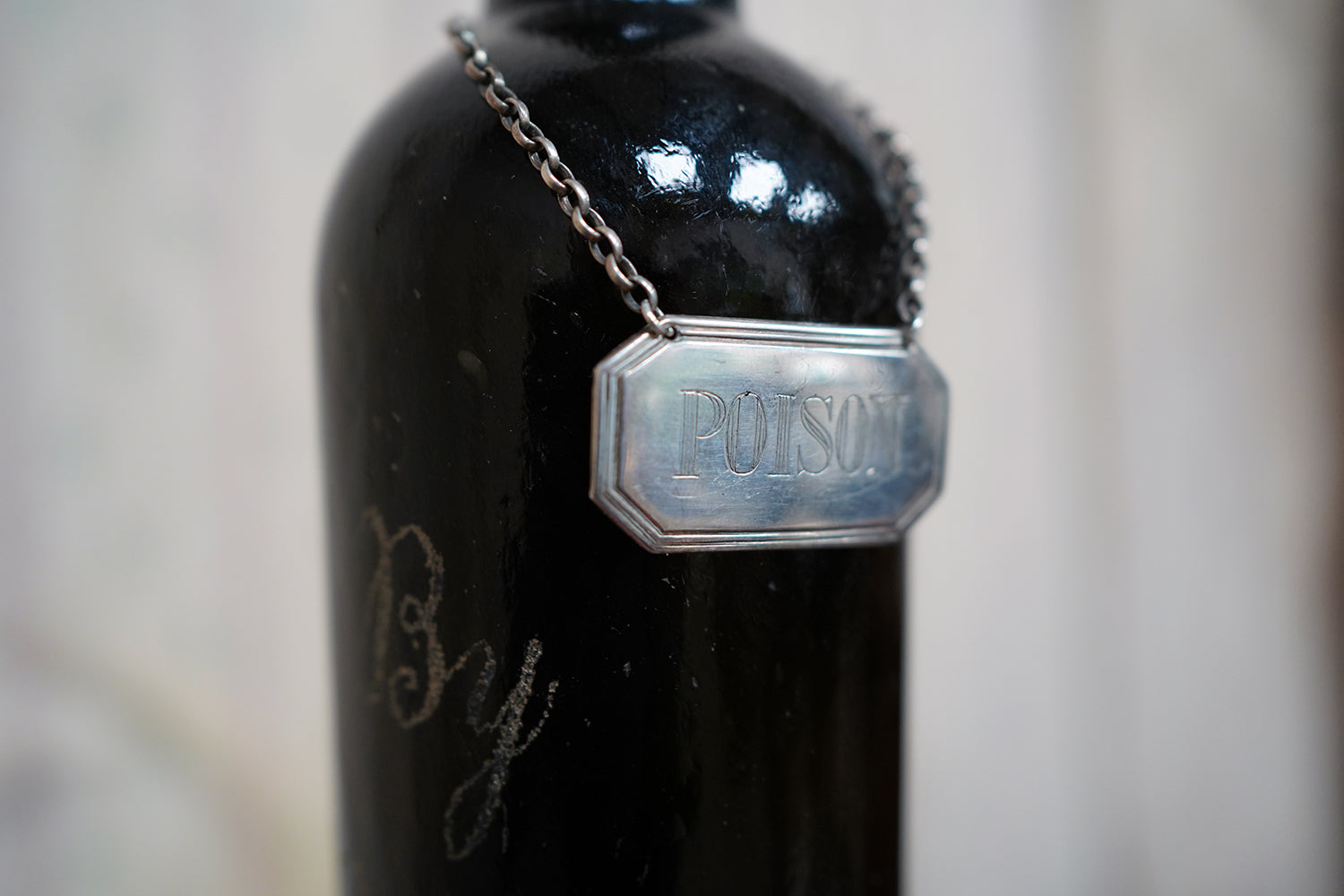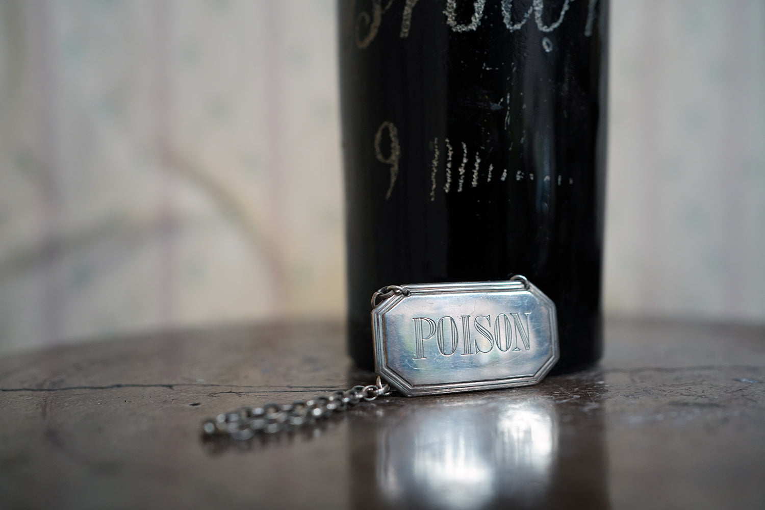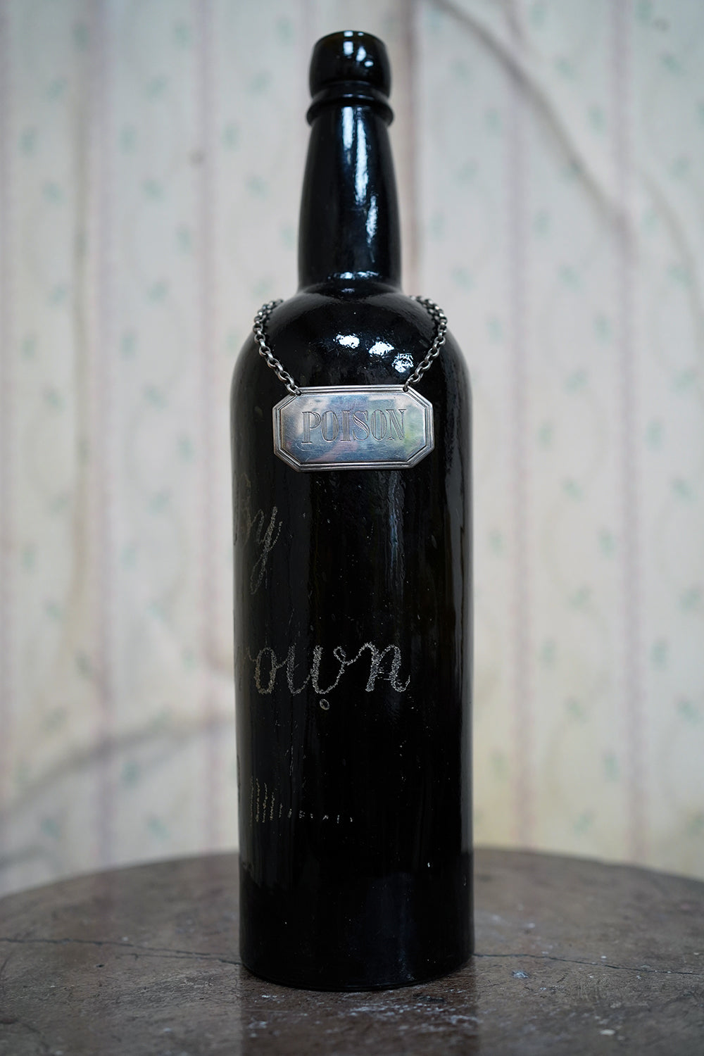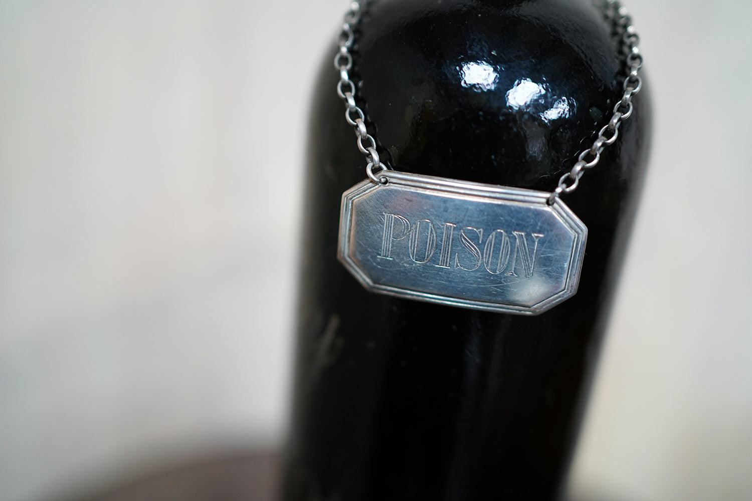 Silver decanter labels, or bottle tickets, emerged in the 18th century as practical identifiers for cut-glass decanters, particularly within grand dining settings. By the later twentieth century they were revived in sterling silver as both functional and novelty pieces. Examples bearing standard spirits are commonplace; however those engraved with more unusual or macabre wording such as “Poison” were produced in far smaller numbers and have a distinctly decorative rather than practical intent. The choice of word nods to apothecary traditions, gothic interiors, and the long-standing aesthetic fascination with danger and the forbidden. Though modest in scale, it carries undeniable theatrical presence; a small object with disproportionate impact.