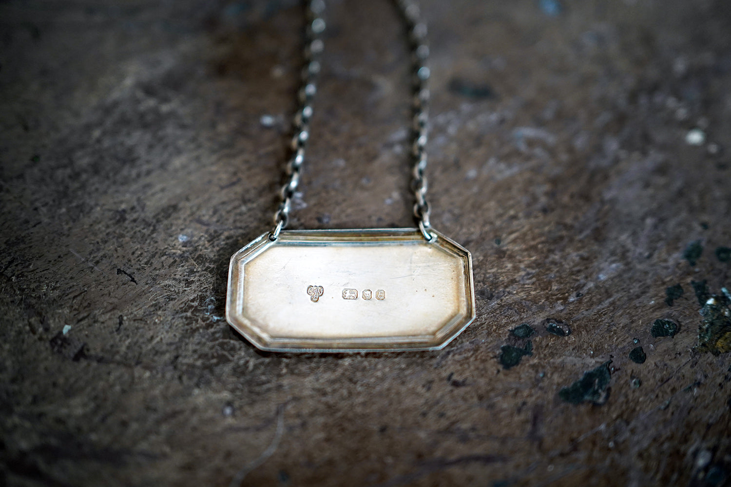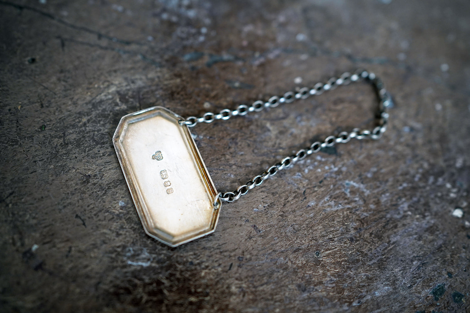 The finely crafted sterling silver decanter label of traditional octagonal form, crisply engraved in bold serif capitals with the single, arresting word “POISON”, the plate chamfered to the corners with a reeded border and suspended from its original silver chain and fully hallmarked for London 1979 and maker’s mark C.J.V Ltd.