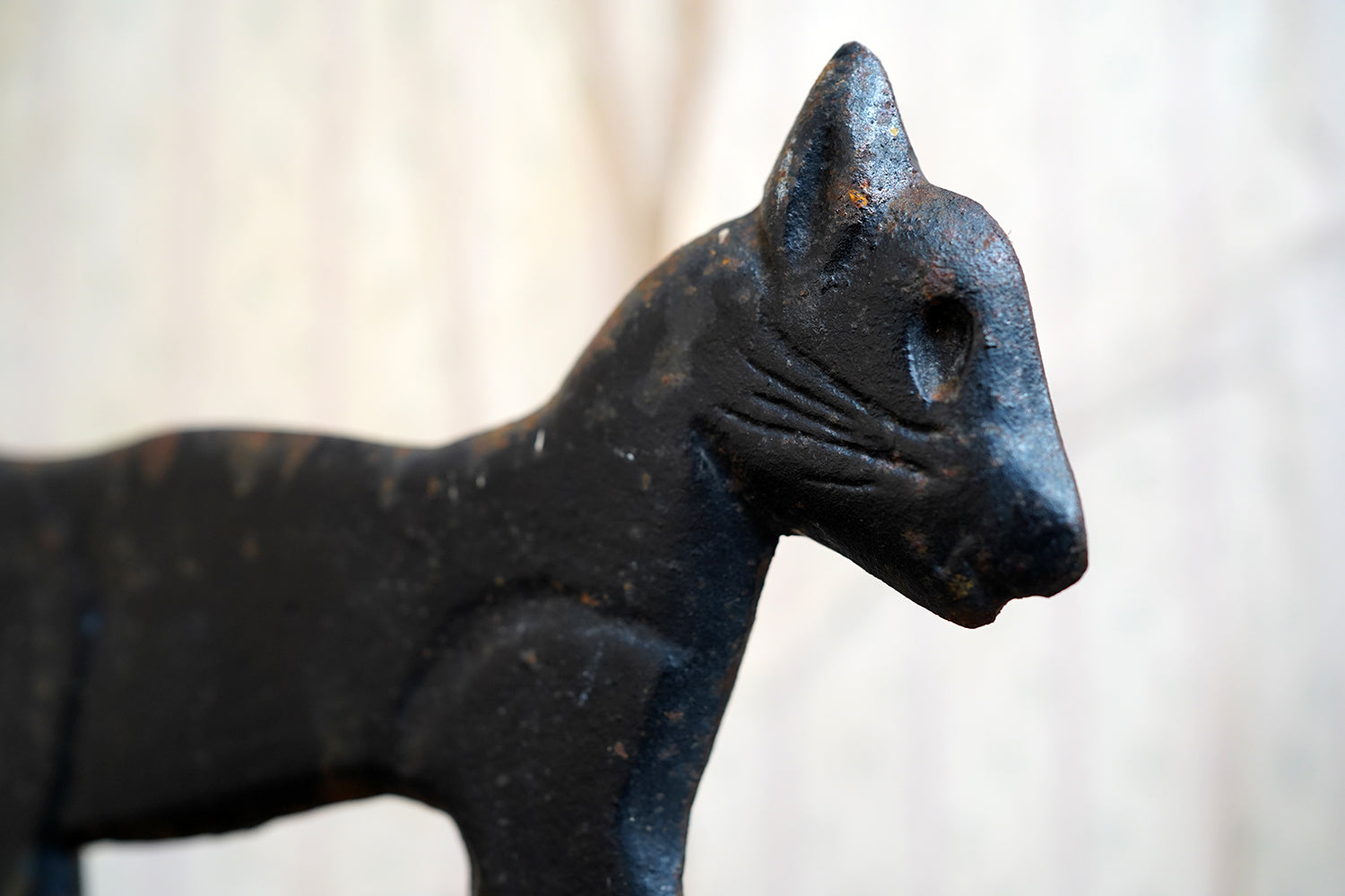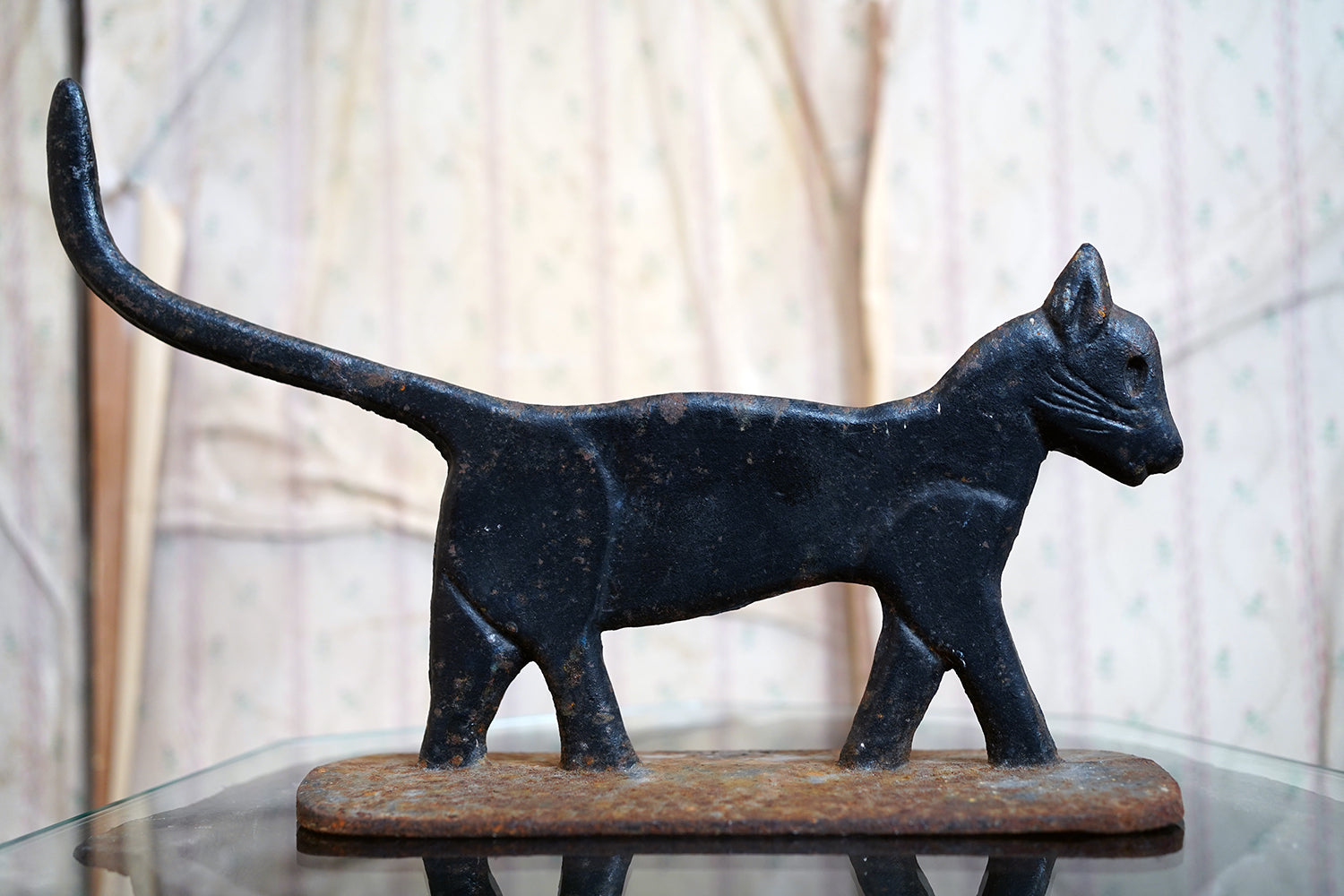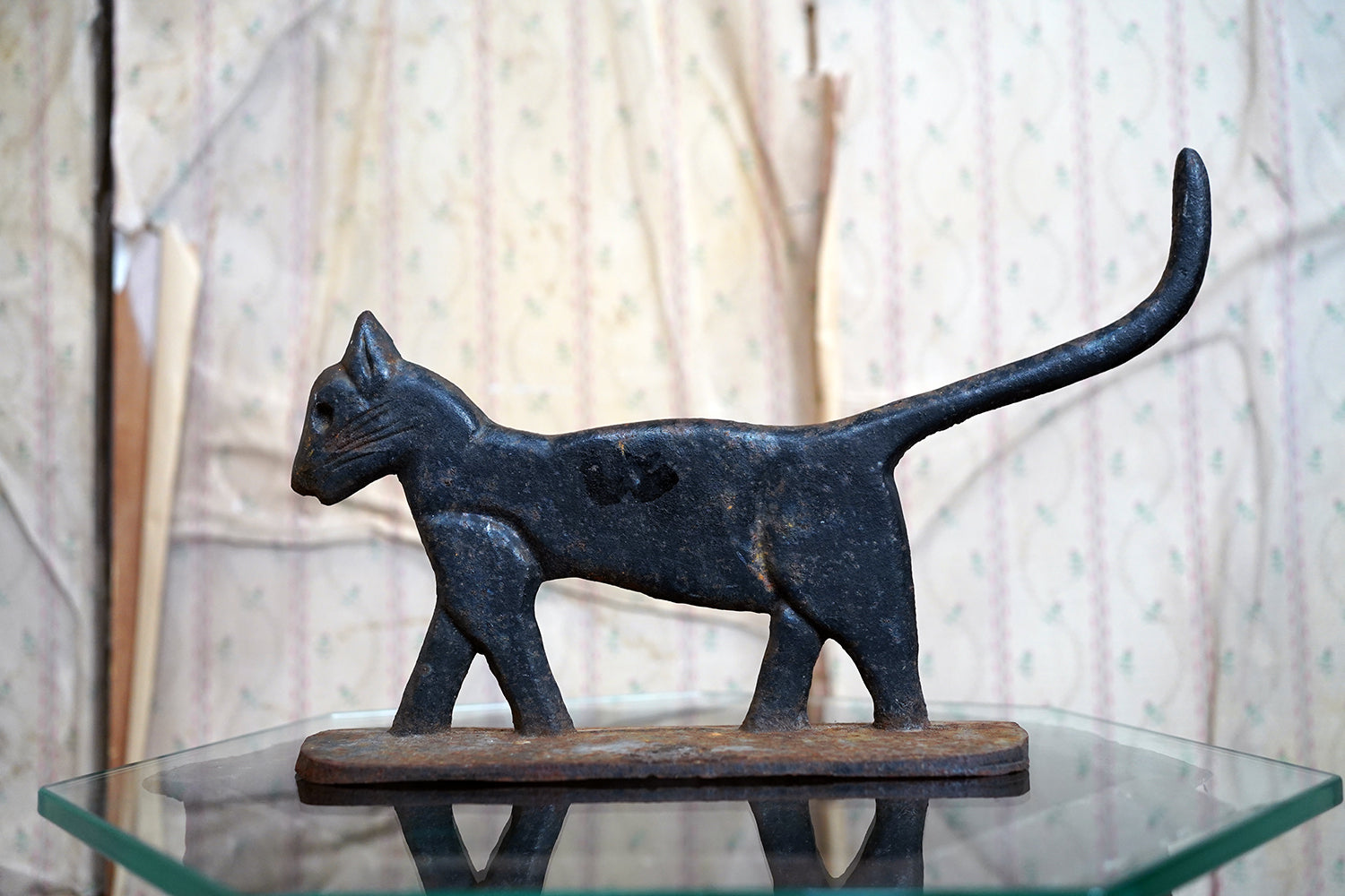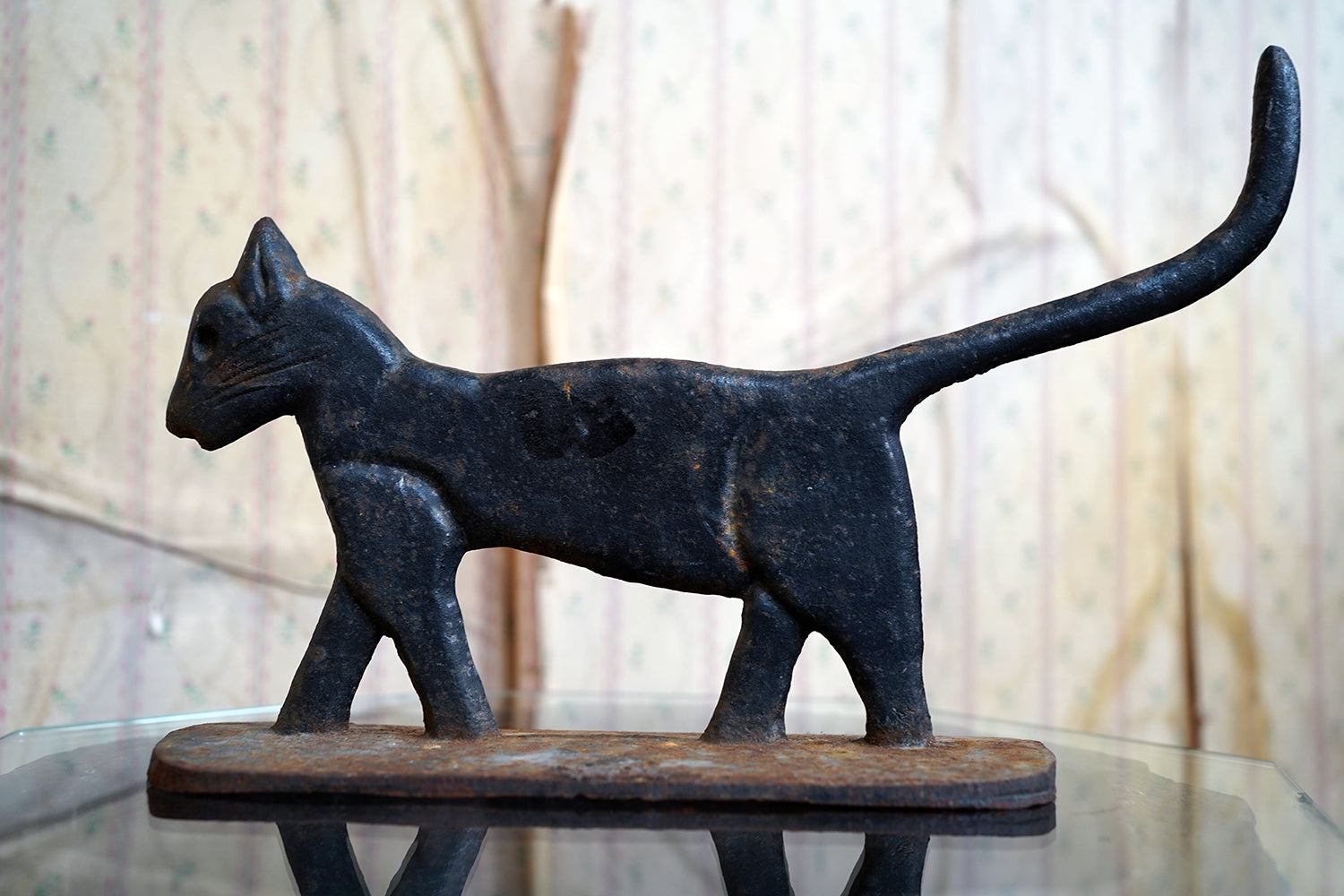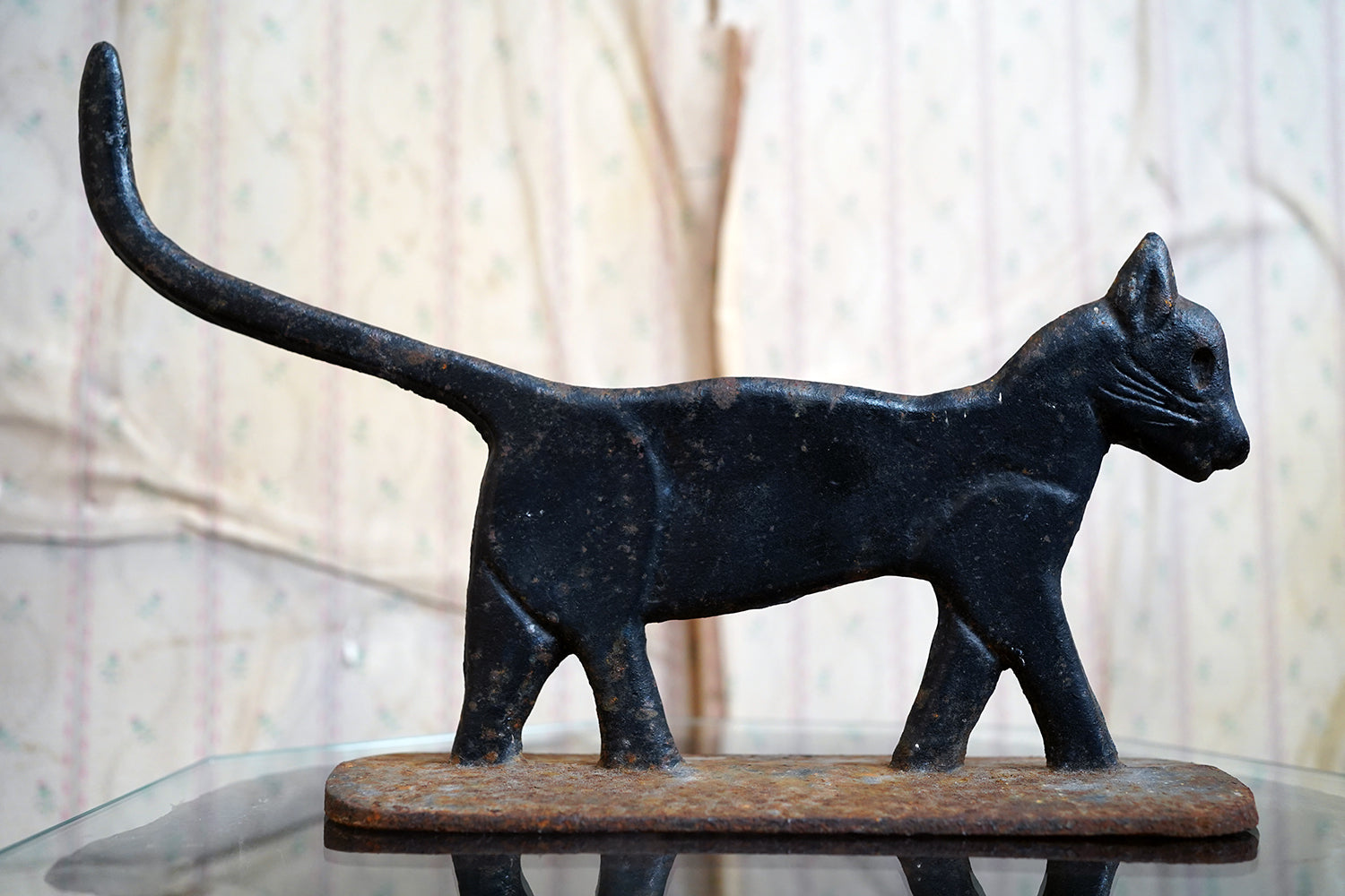 Boot scrapers of this type were a familiar feature on American porches and stoops in the late 19th and early 20th century, particularly in rural and small-town settings where cast iron architectural fittings were both practical and decorative. Animal-form scrapers, especially cats, are considerably scarcer than the more common foliate or geometric examples, and they sit comfortably within the broader vernacular tradition of American folk casting, where utility and whimsy meet without self-consciousness.