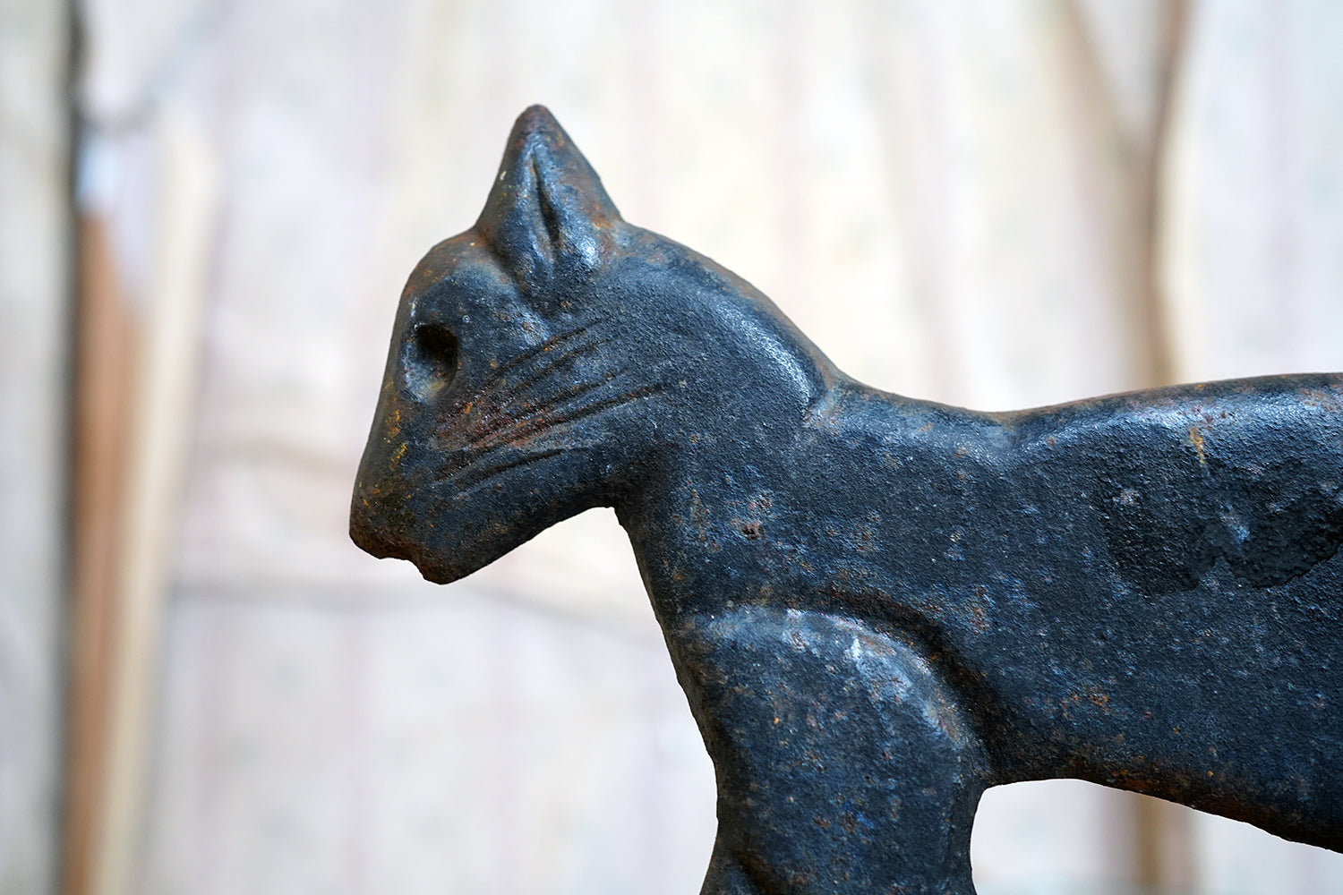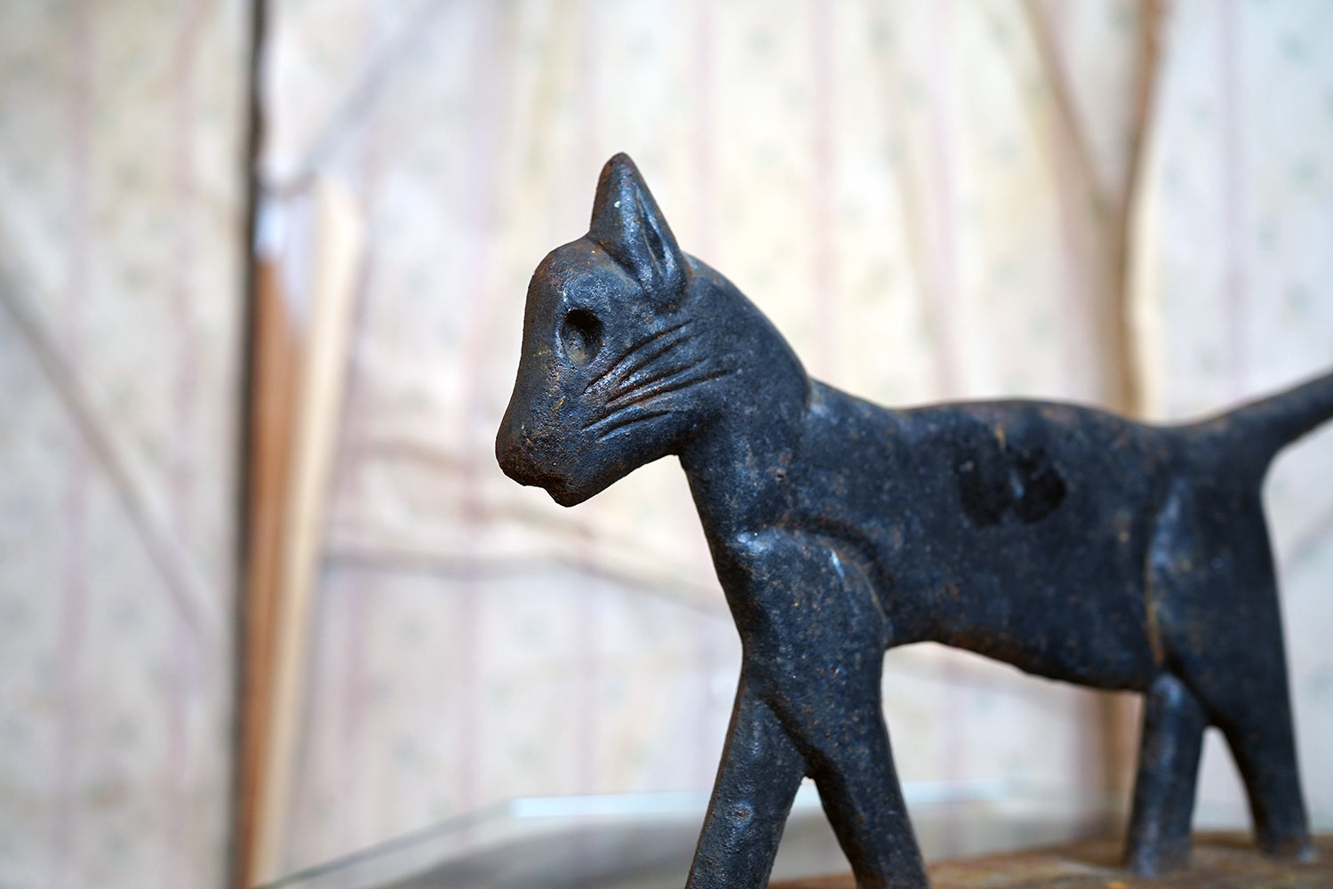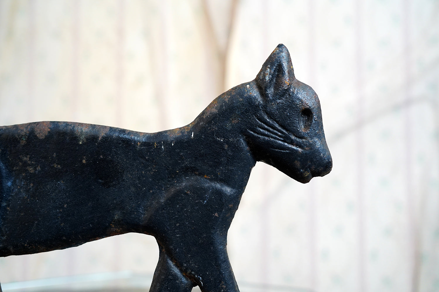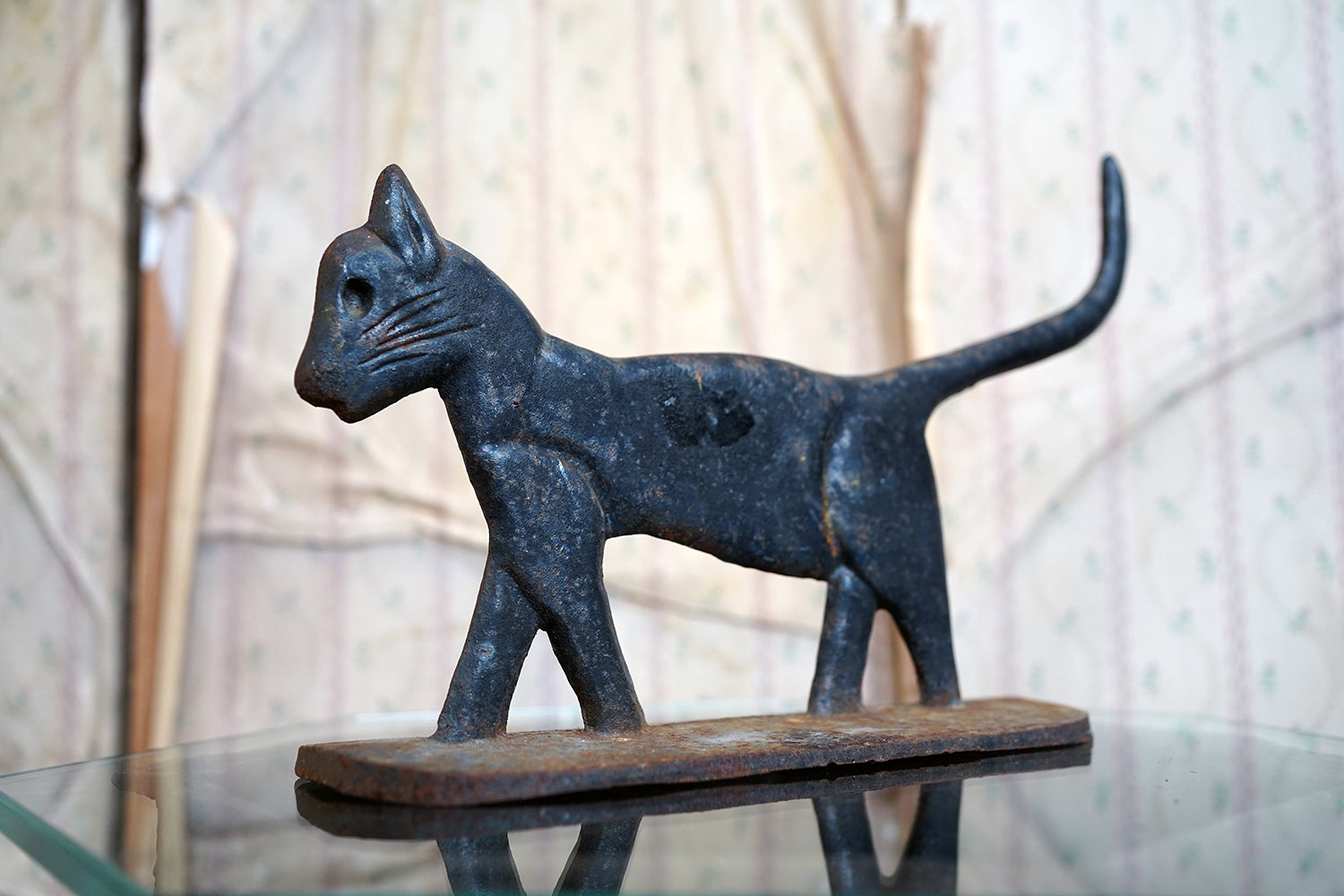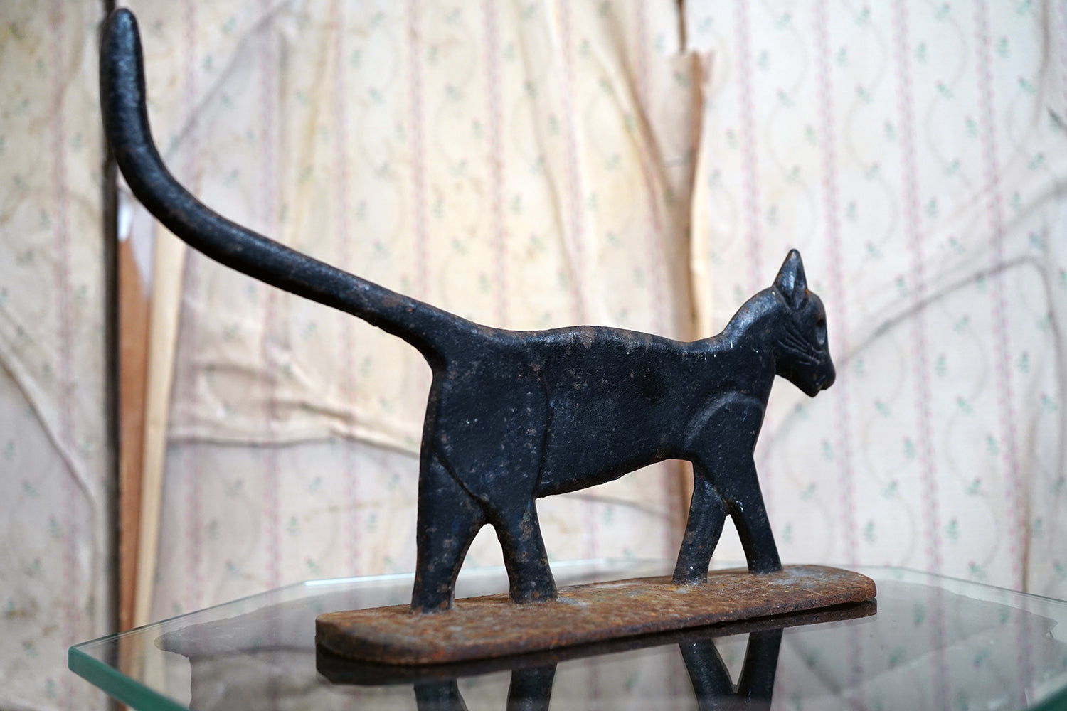 Boot scrapers of this type were a familiar feature on American porches and stoops in the late 19th and early 20th century, particularly in rural and small-town settings where cast iron architectural fittings were both practical and decorative. Animal-form scrapers, especially cats, are considerably scarcer than the more common foliate or geometric examples, and they sit comfortably within the broader vernacular tradition of American folk casting, where utility and whimsy meet without self-consciousness.