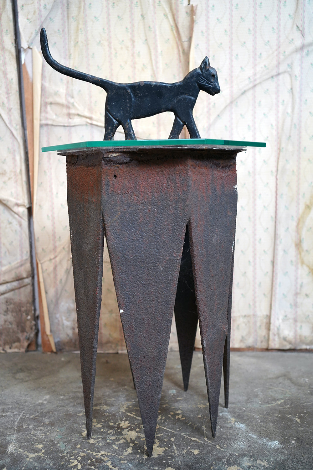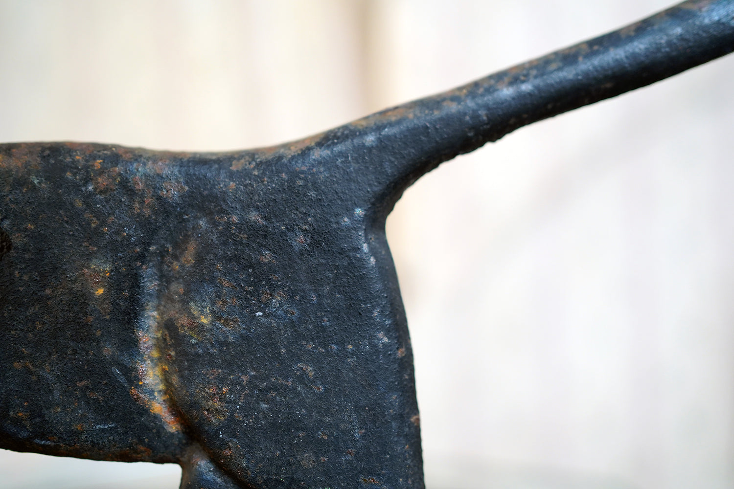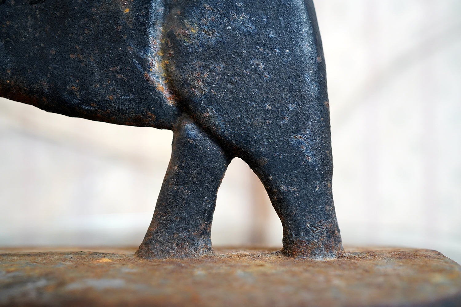 The surface retains its original black paint, now beautifully time-worn with mottled oxidation and gentle surface pitting consistent with age and outdoor use. There is honest wear throughout, particularly to the base and along the upper planes, but no structural damage. The patina is dry and untouched, exactly as one would hope to find it.
