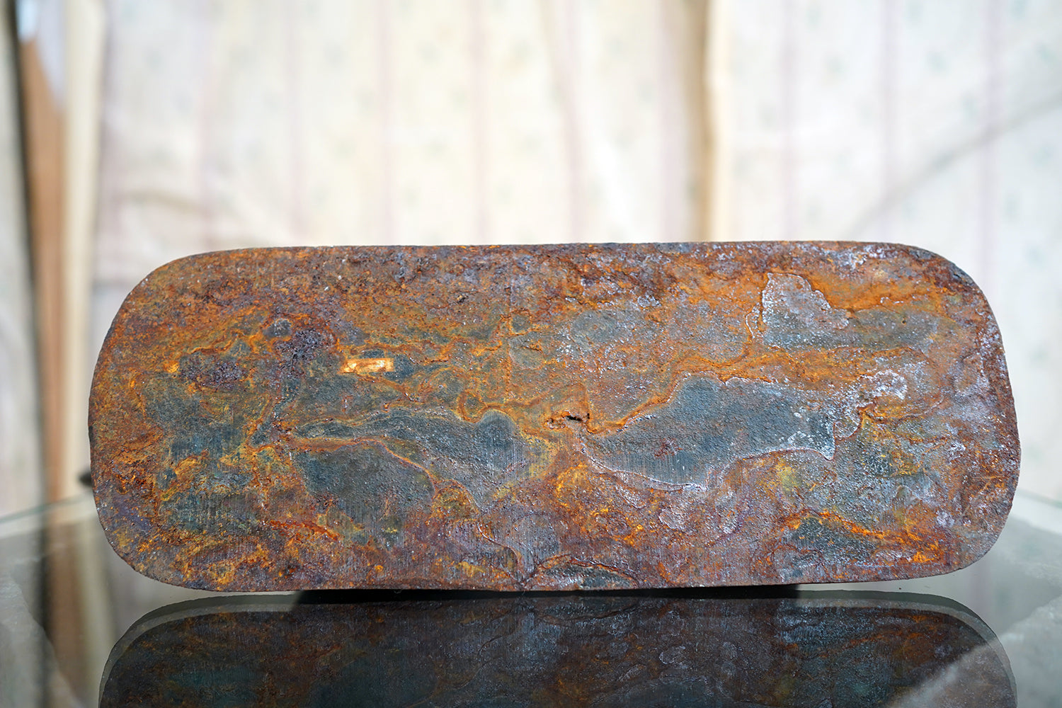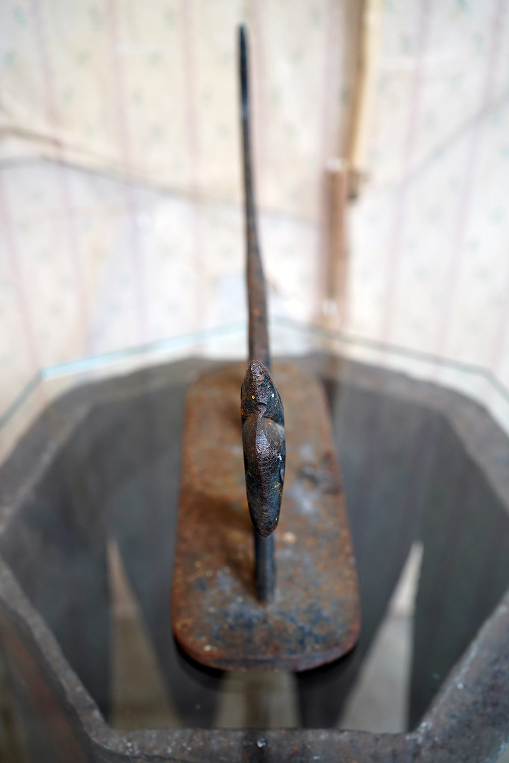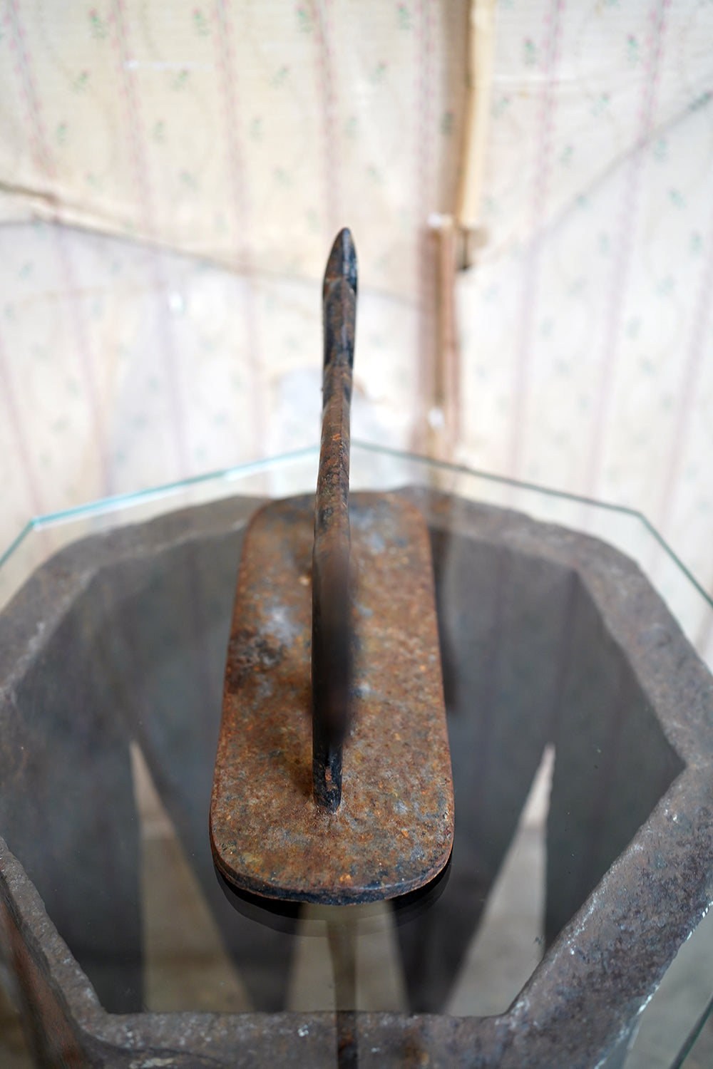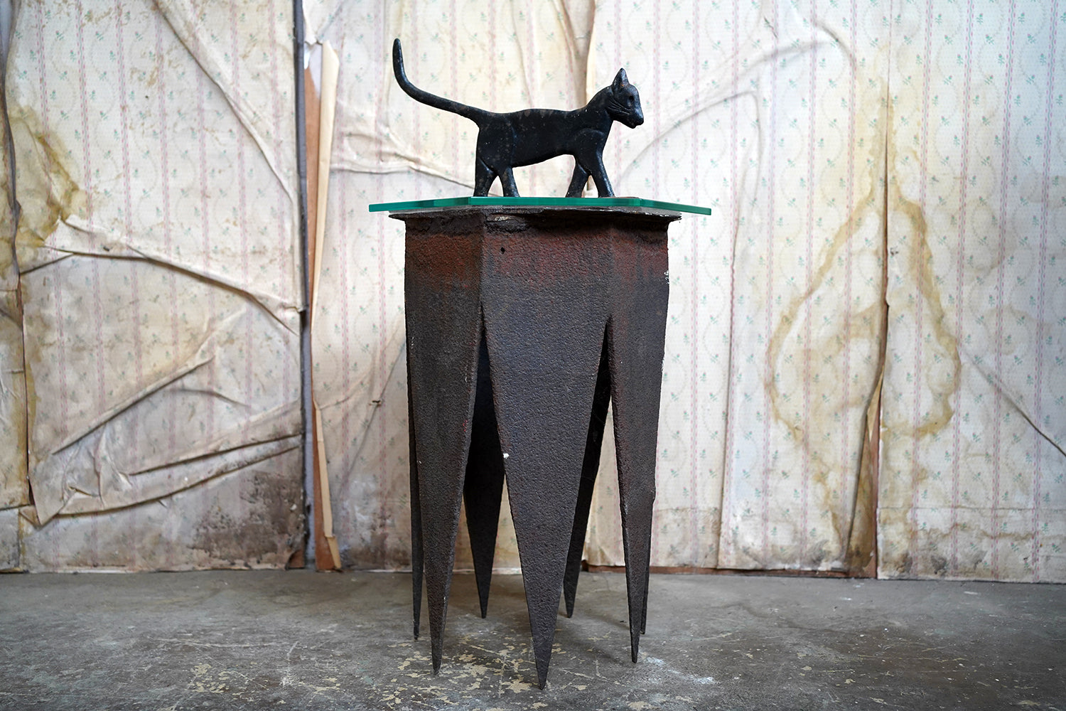 The surface retains its original black paint, now beautifully time-worn with mottled oxidation and gentle surface pitting consistent with age and outdoor use. There is honest wear throughout, particularly to the base and along the upper planes, but no structural damage. The patina is dry and untouched, exactly as one would hope to find it.