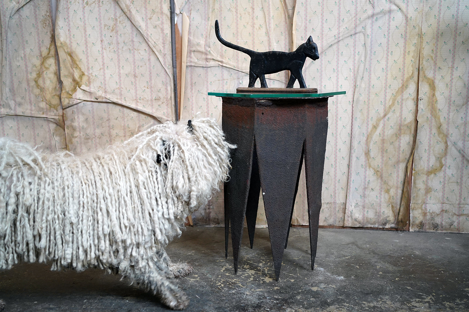 The sculptural American folk art cast iron boot scraper, cast in one piece, formed as a striding cat, its body rendered in a flattened silhouette with tail arched high and head lowered in purposeful motion, being primitively modelled, giving a remarkable strength of outline, the elongated back, lightly defined haunches and incised whisker lines lending just enough detail without disturbing its bold graphic quality, the whole raised on an integral oval base and surviving from the first quarter of twentieth century America.