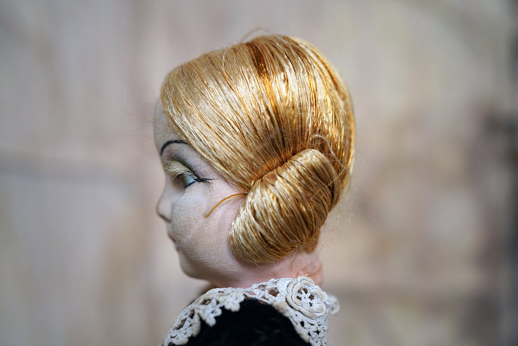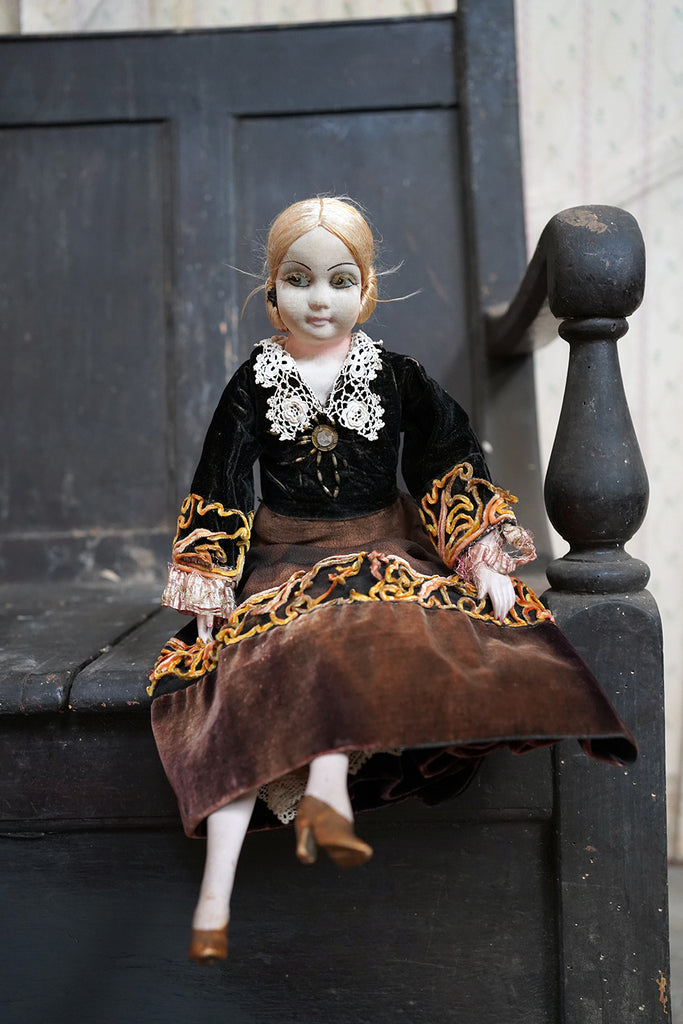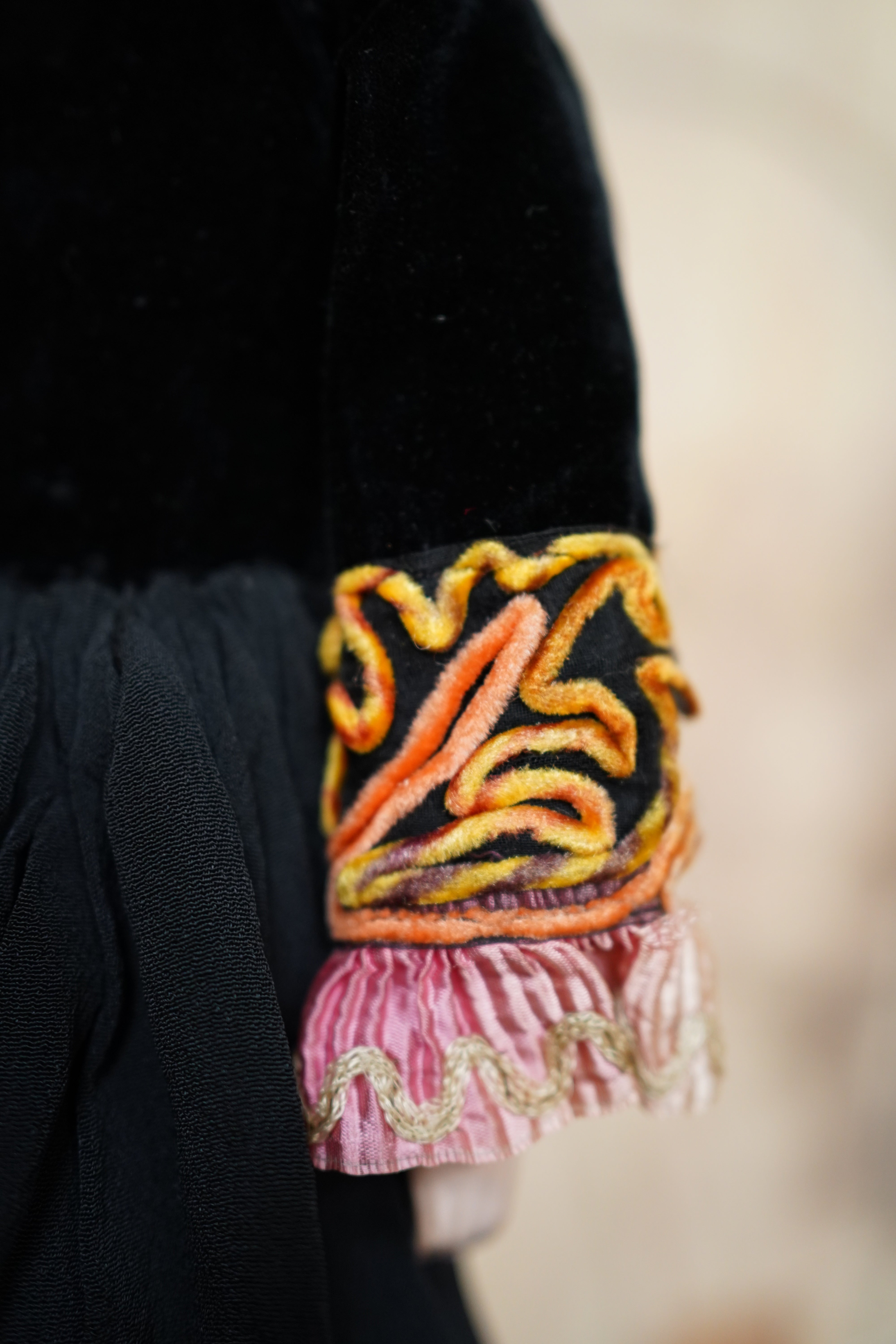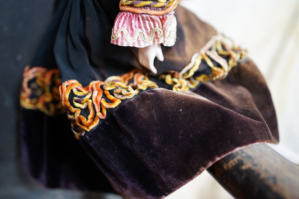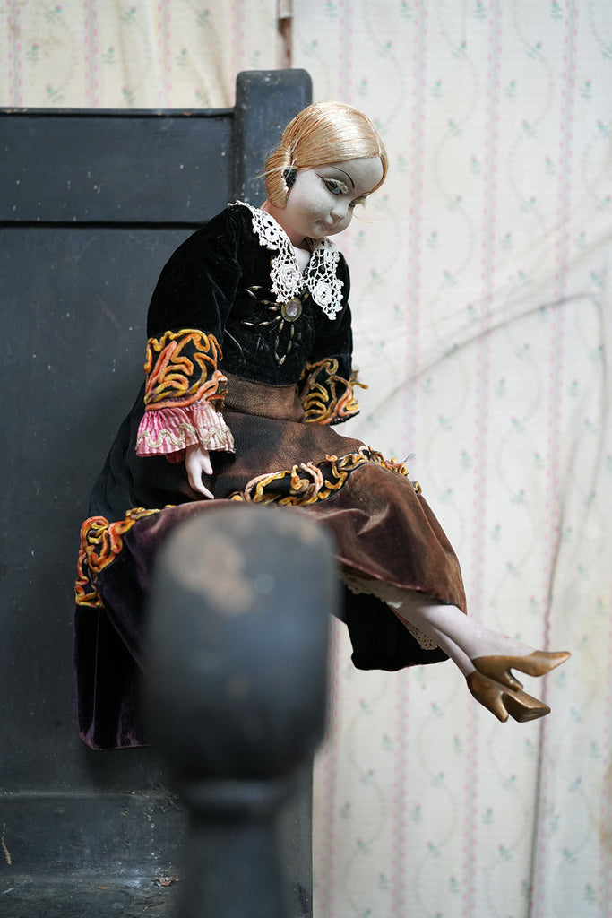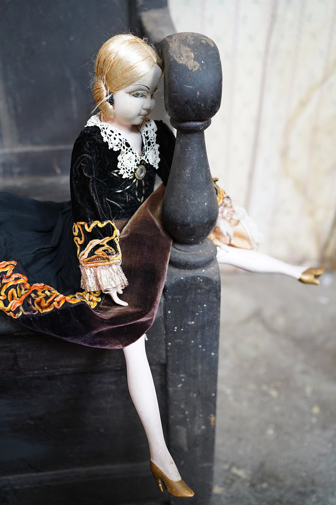 The early twentieth century boudoir doll having a pressed stockinette head with painted green eyes and strawberry blond hair dressed in a bun, to a period black & chocolate brown velvet dress with gold piping and central sequinned flower burst with taffeta adornments to gold painted shoes and surviving from the first quarter of twentieth century France.