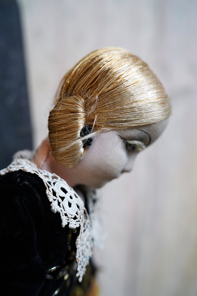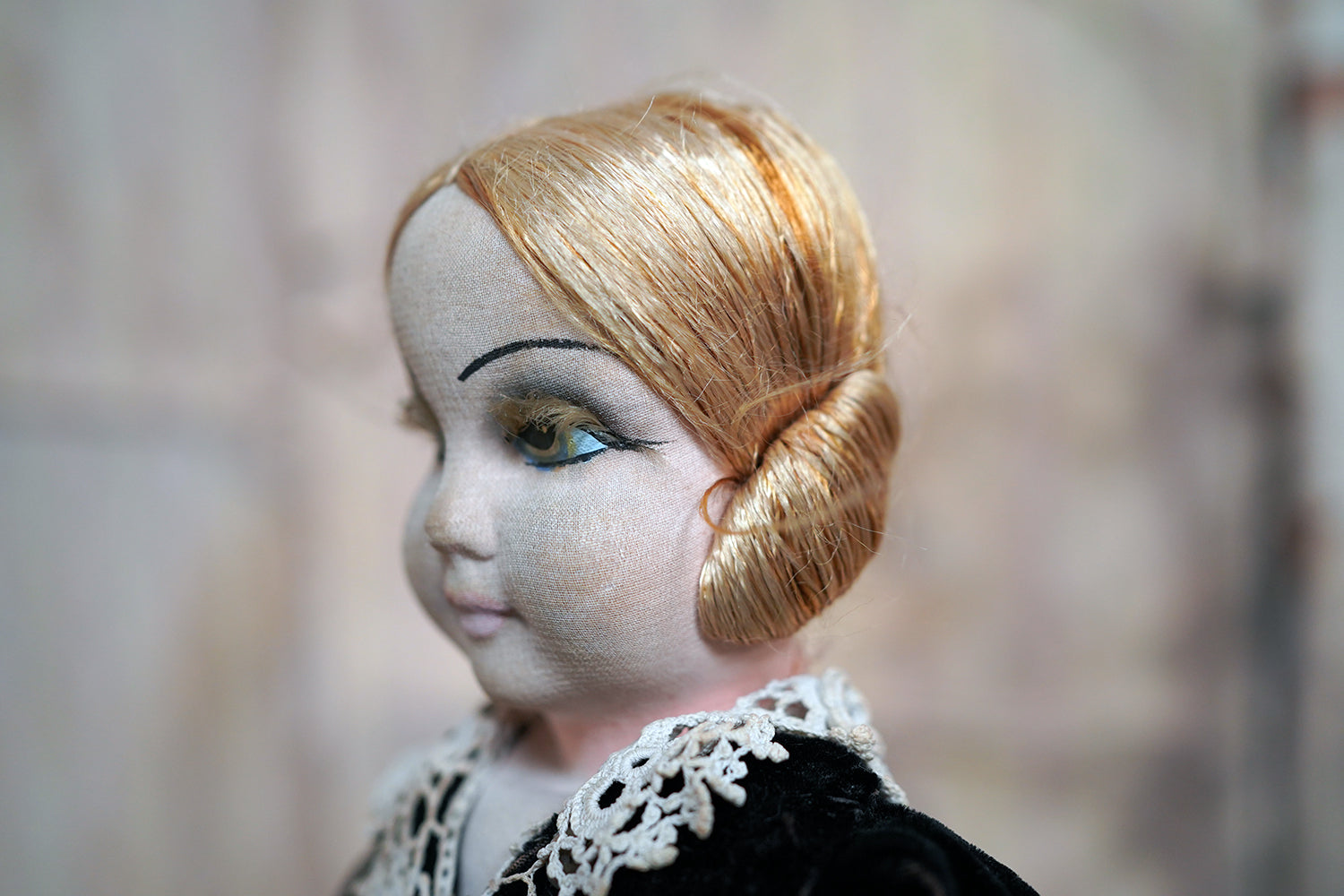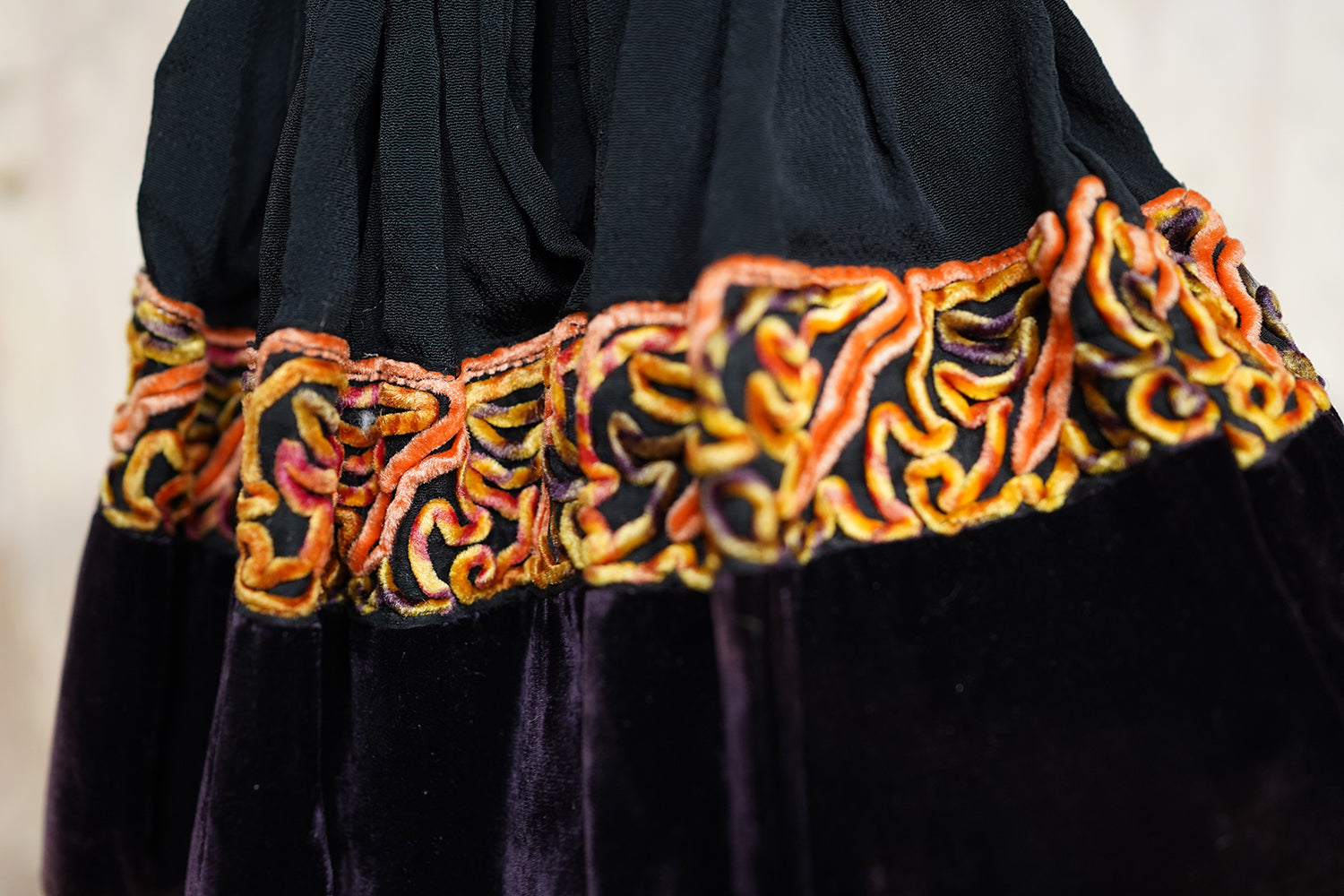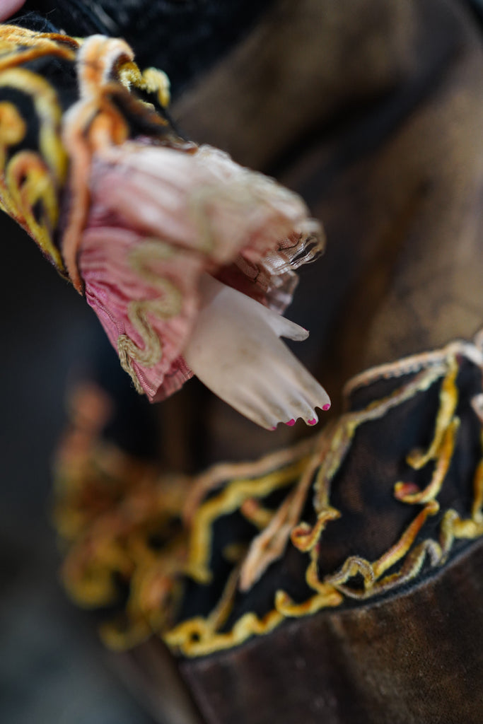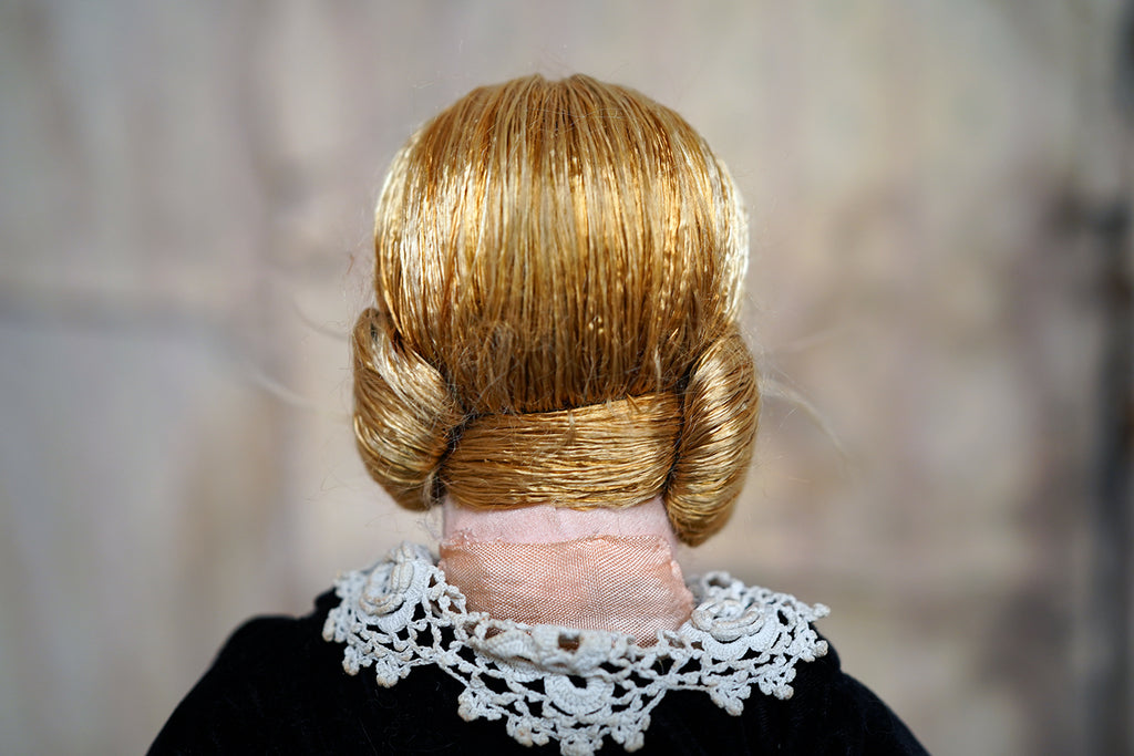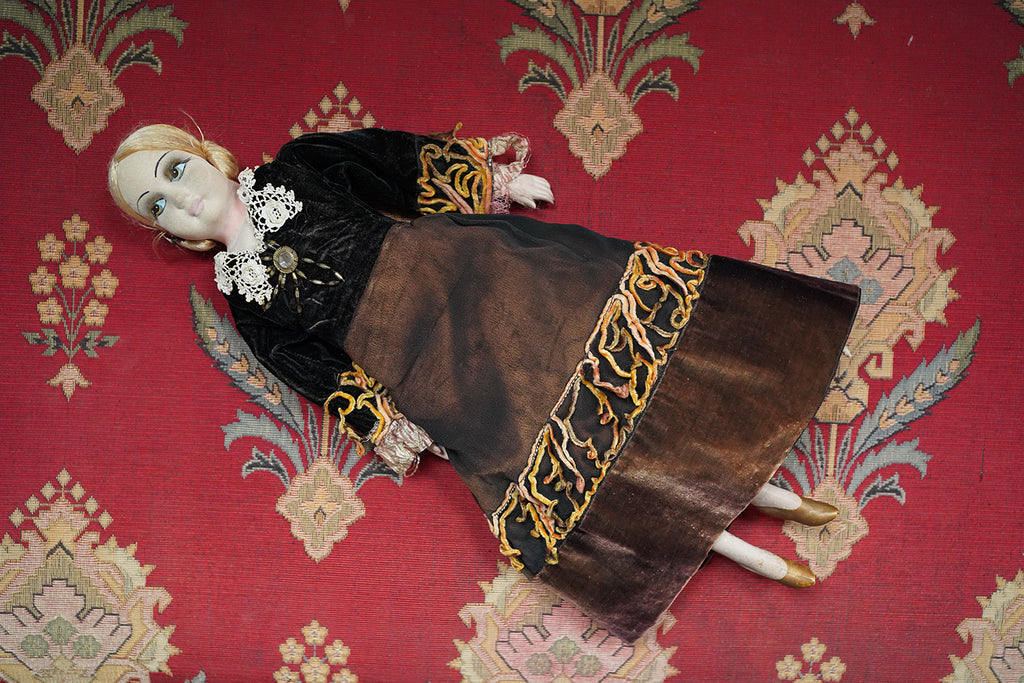 The early twentieth century boudoir doll having a pressed stockinette head with painted green eyes and strawberry blond hair dressed in a bun, to a period black & chocolate brown velvet dress with gold piping and central sequinned flower burst with taffeta adornments to gold painted shoes and surviving from the first quarter of twentieth century France.