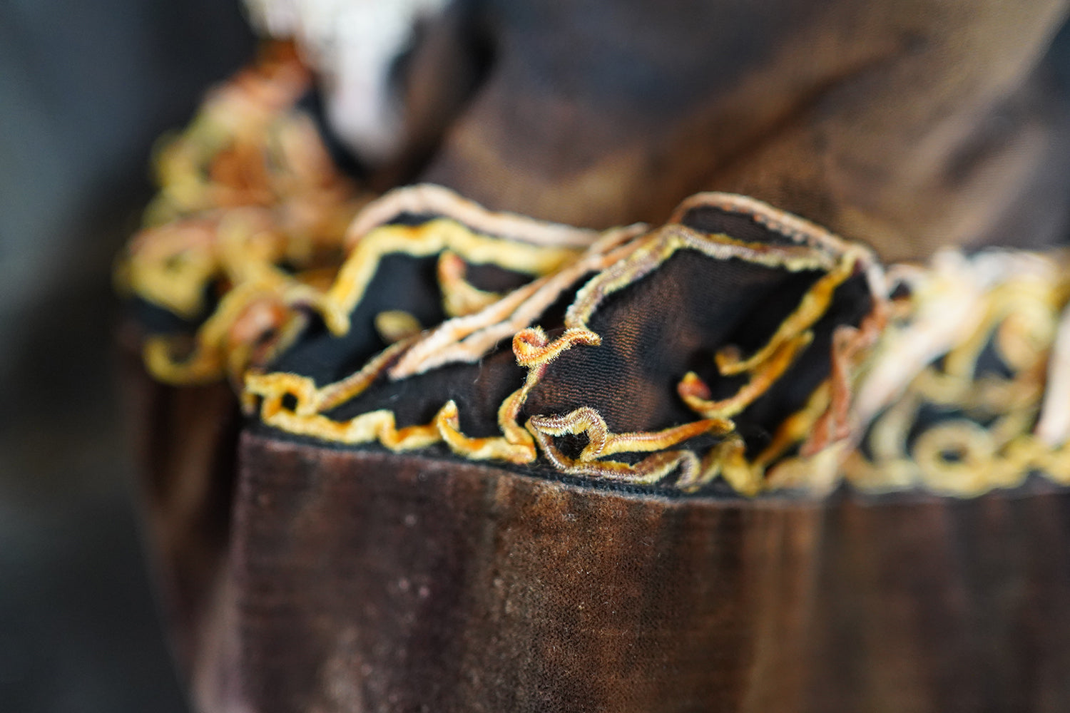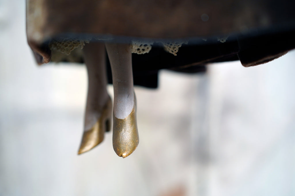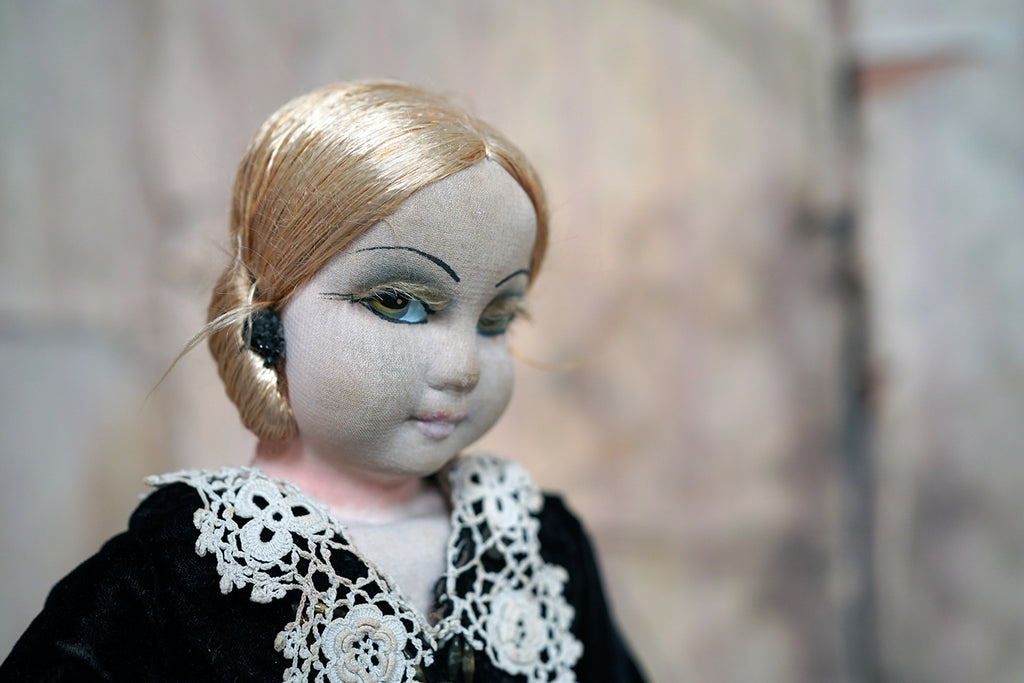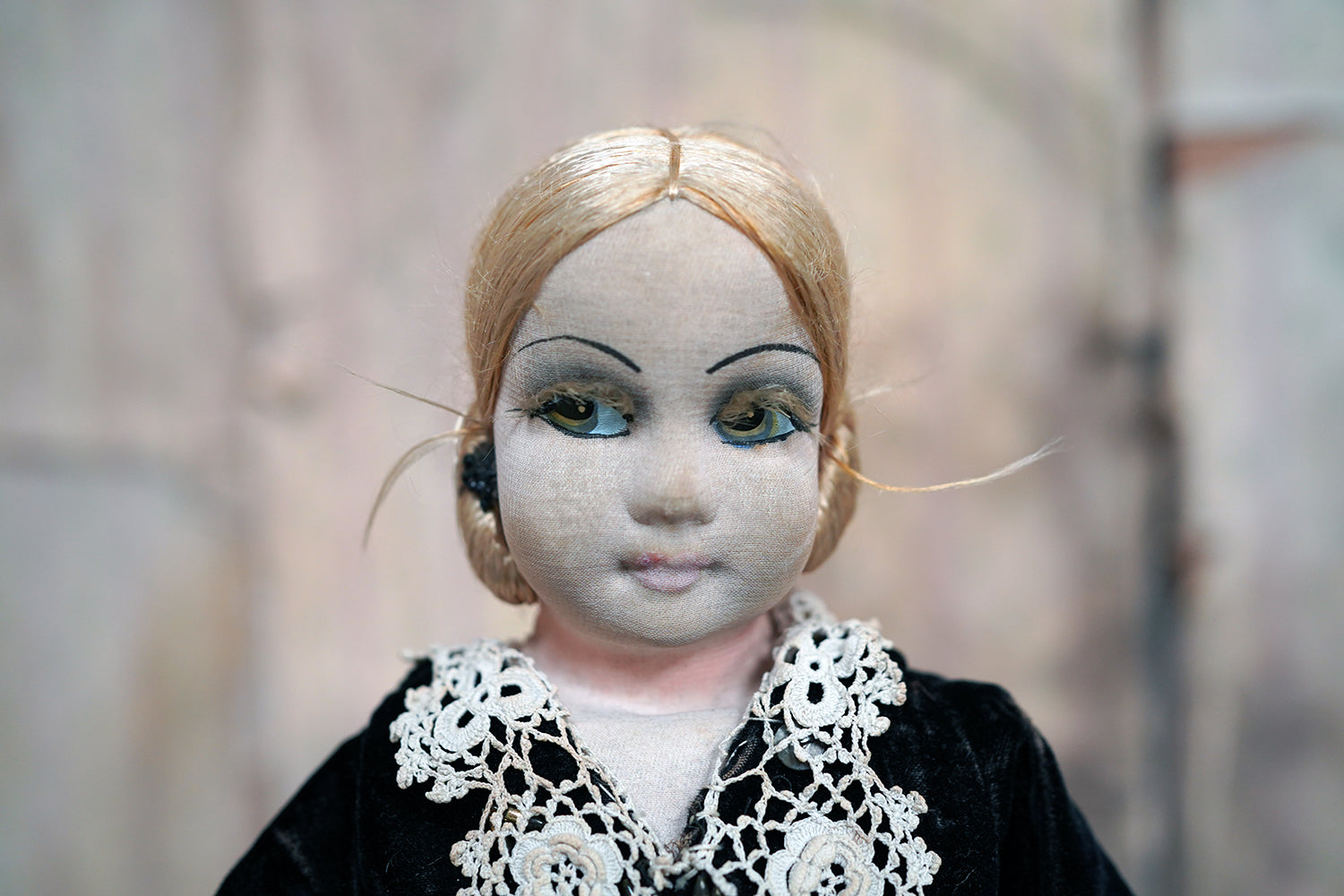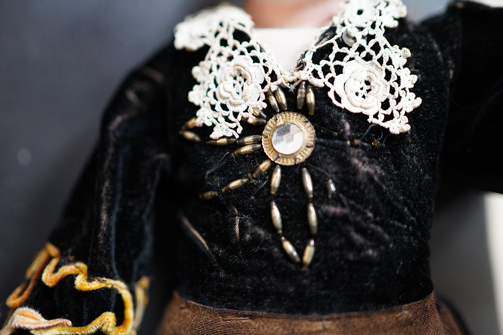 The early twentieth century boudoir doll having a pressed stockinette head with painted green eyes and strawberry blond hair dressed in a bun, to a period black & chocolate brown velvet dress with gold piping and central sequinned flower burst with taffeta adornments to gold painted shoes and surviving from the first quarter of twentieth century France.
