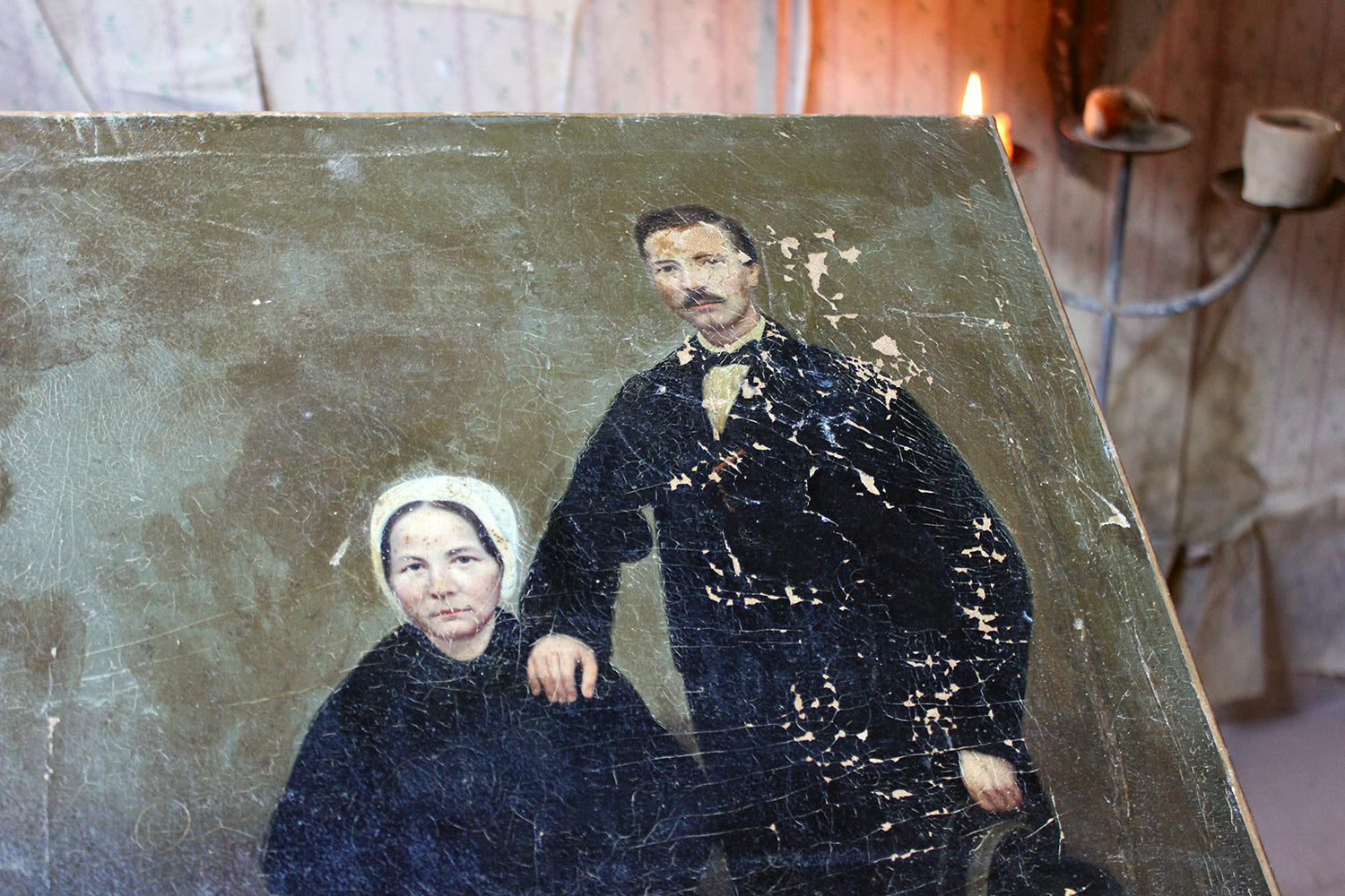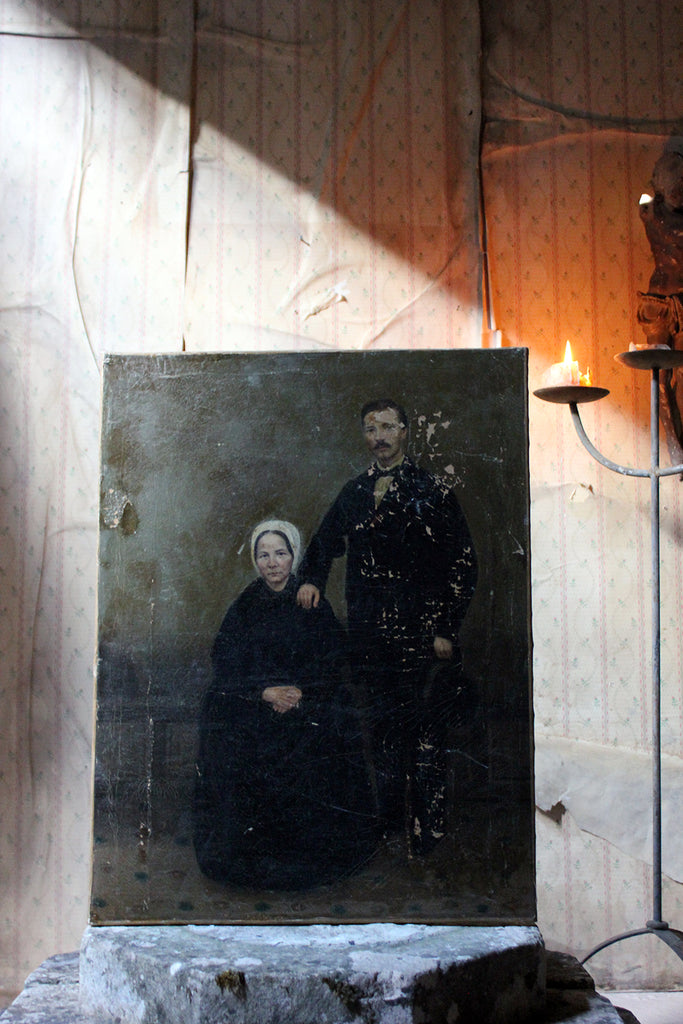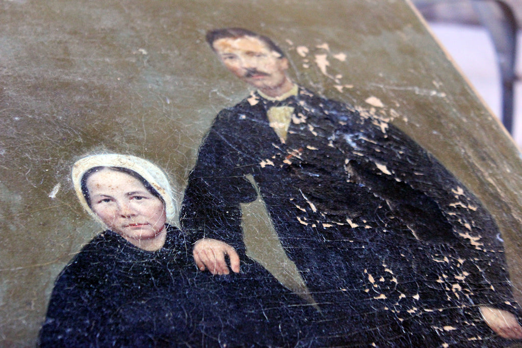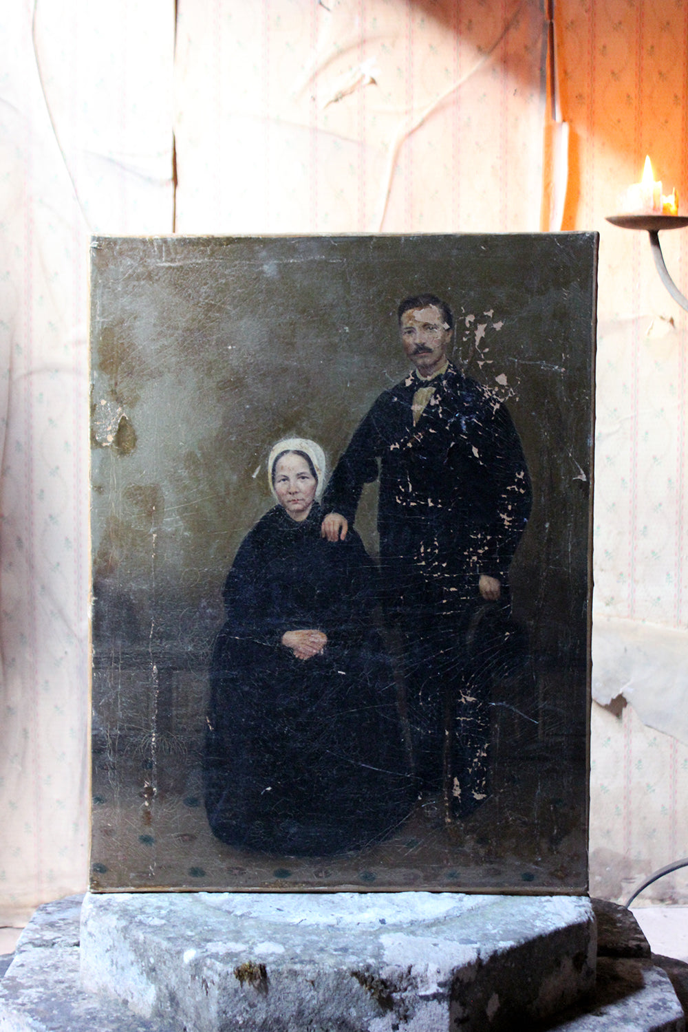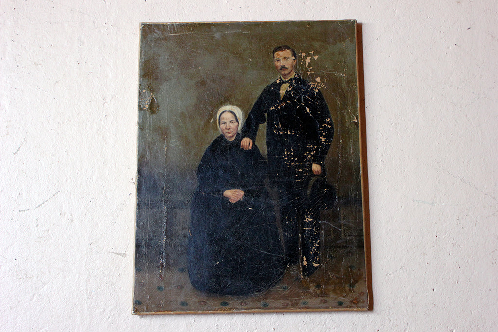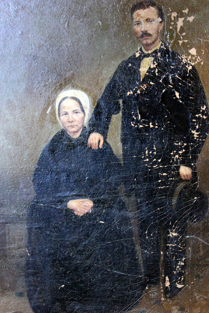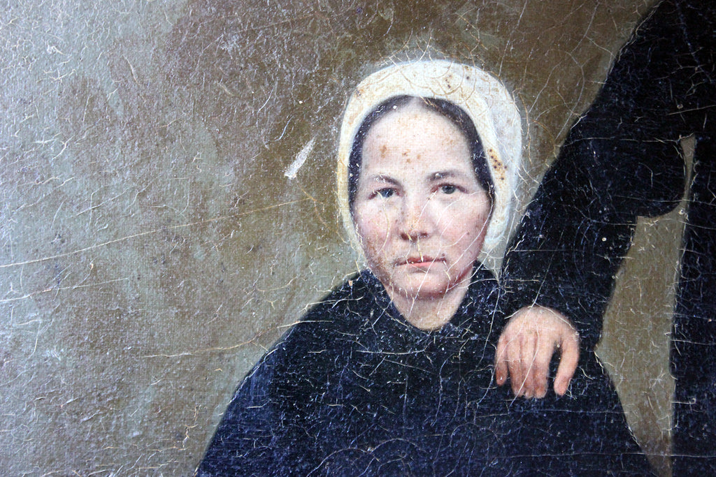 The unframed oil on canvas English school depiction of a gentleman and lady, shown full-length amidst a high Victorian interior setting, with patterned carpet and panelled walls, the lady seated wearing a bonnet and the gentleman standing, one arm resting upon her shoulder, the other holding his top hat, each dressed prominently in black, possibly in mourning, amidst a sea green ground, surviving in unrestored and uncleaned condition.