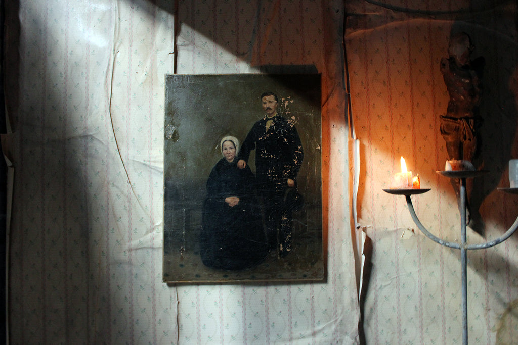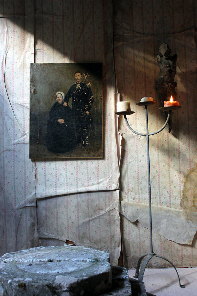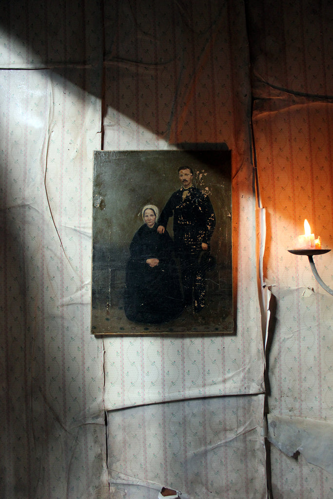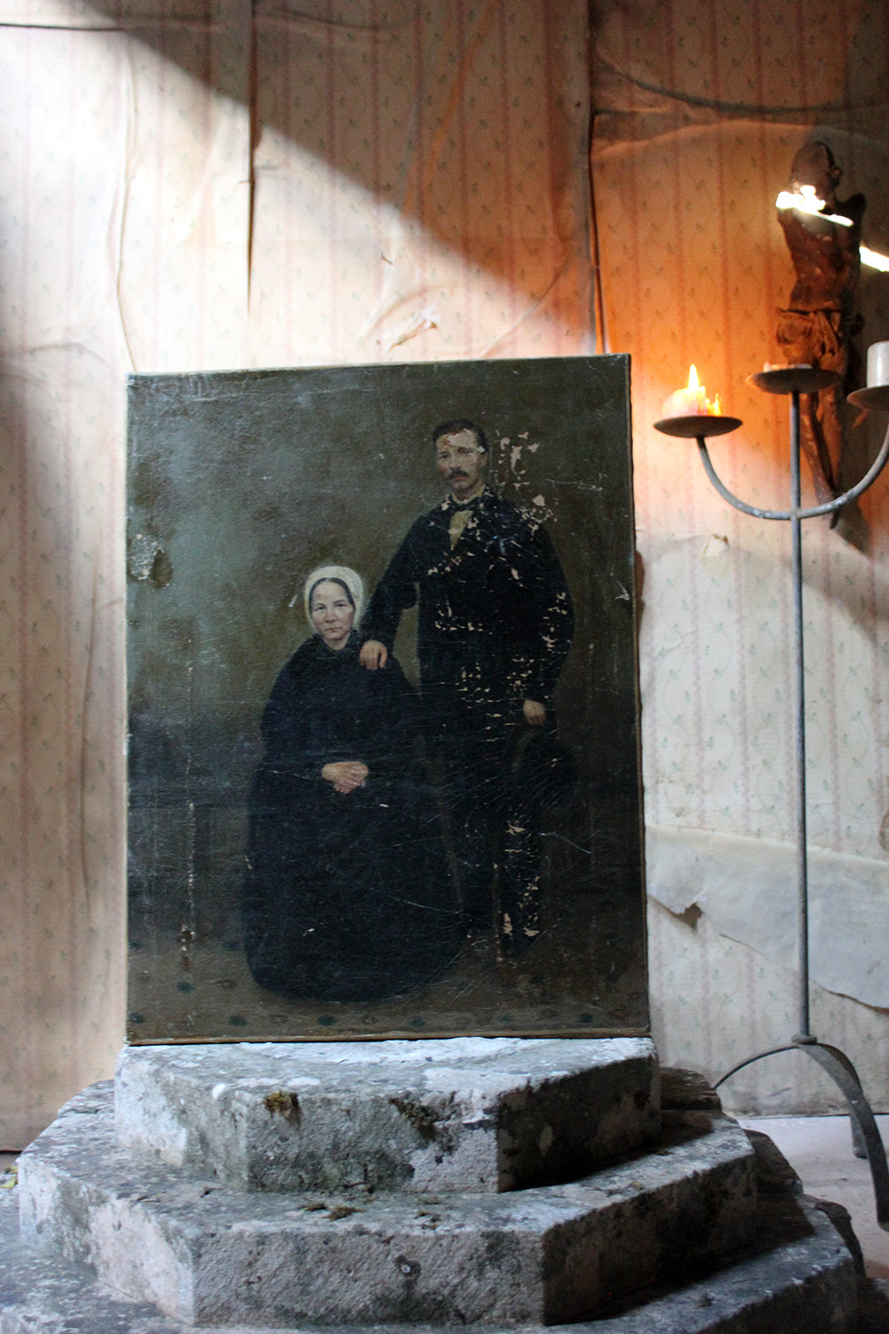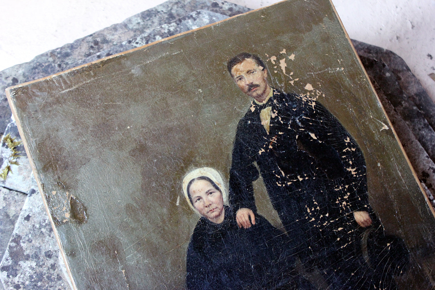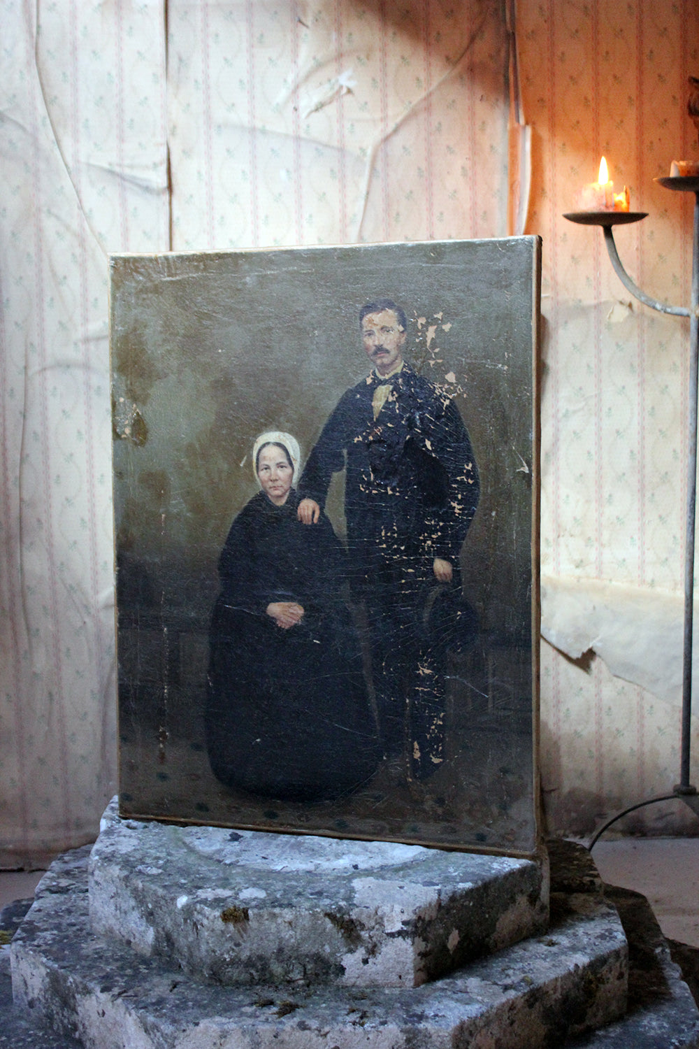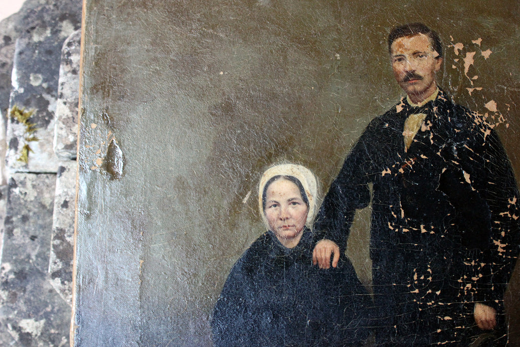 The unframed oil on canvas English school depiction of a gentleman and lady, shown full-length amidst a high Victorian interior setting, with patterned carpet and panelled walls, the lady seated wearing a bonnet and the gentleman standing, one arm resting upon her shoulder, the other holding his top hat, each dressed prominently in black, possibly in mourning, amidst a sea green ground, surviving in unrestored and uncleaned condition.