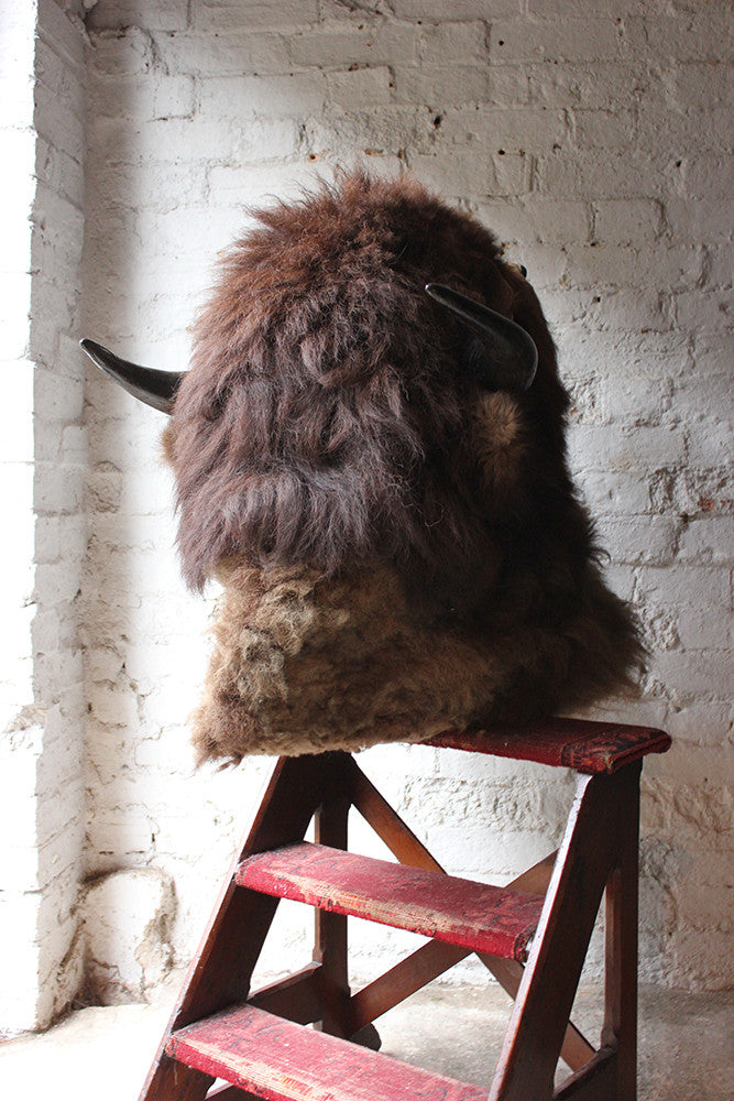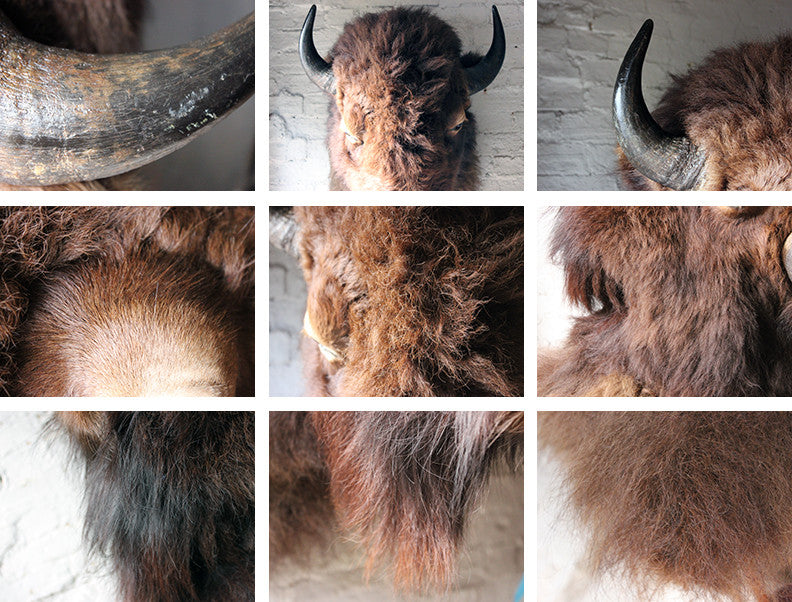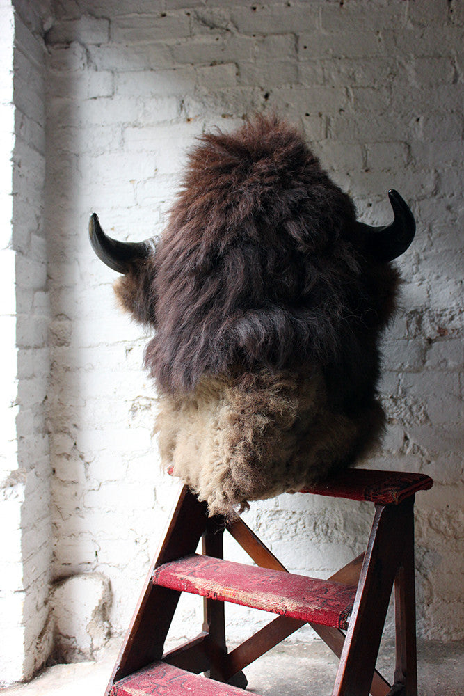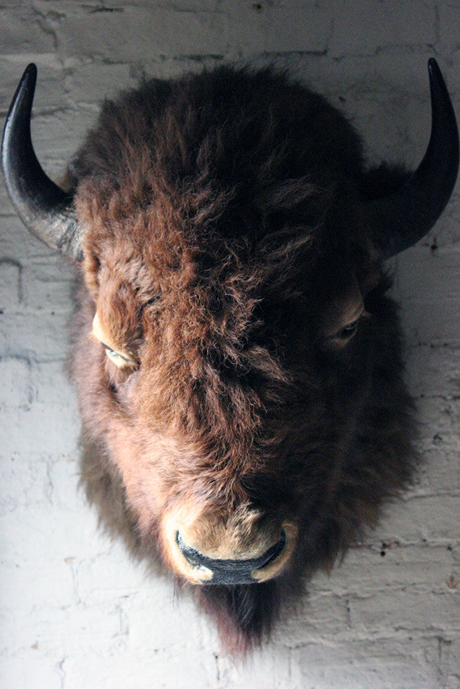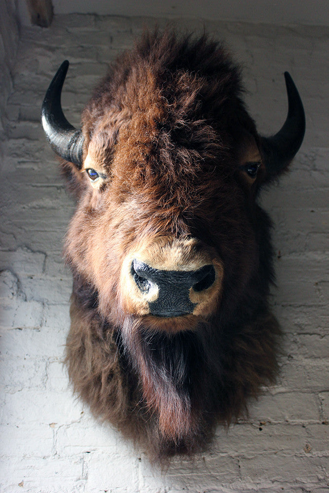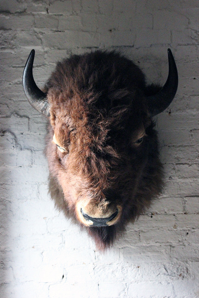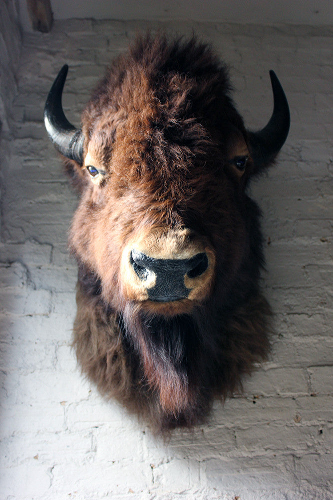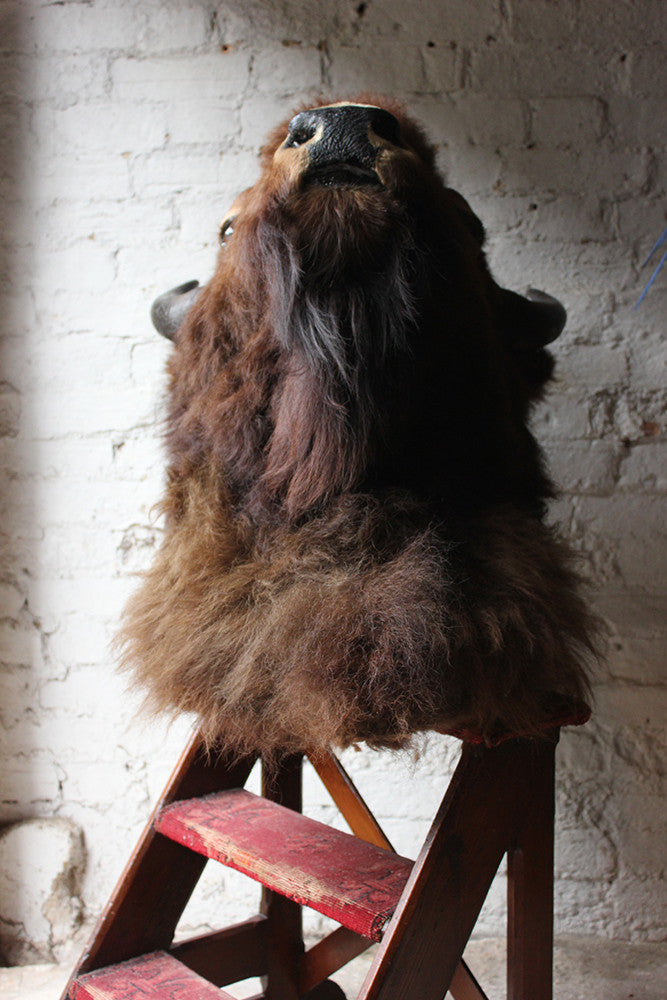 The massive American bison (Bison bison) head and neck mount, also commonly known as the American buffalo, having a shaggy, long, dark brown winter coat and short curved horns, the whole preserved in excellent all round condition from the middle part of the twentieth century.