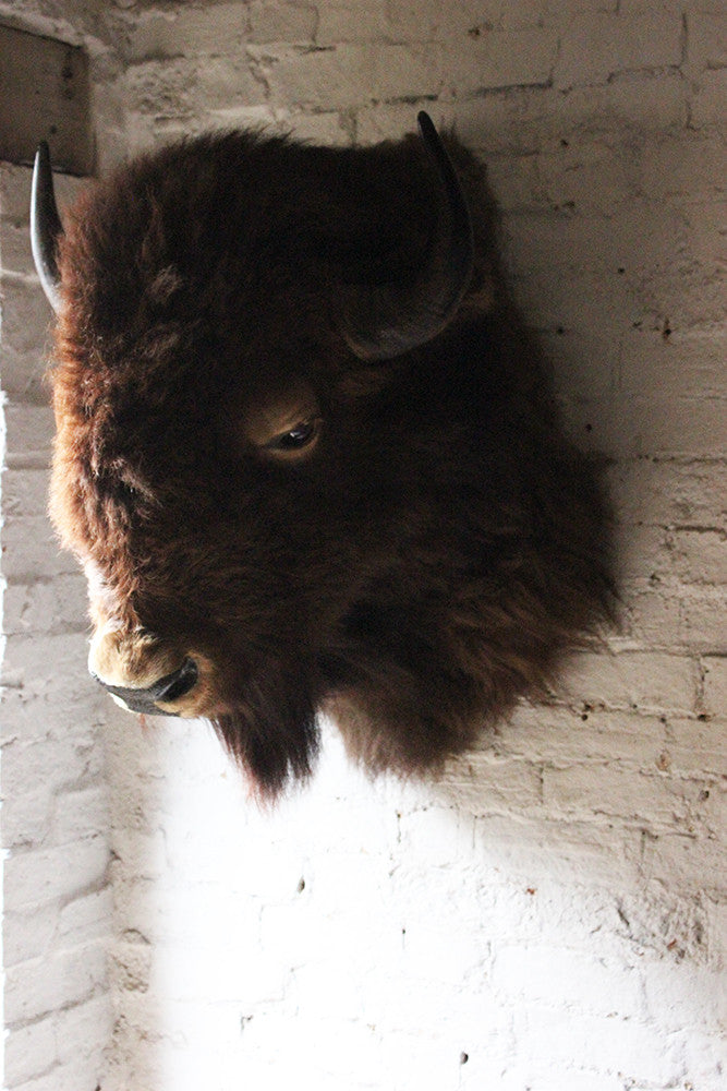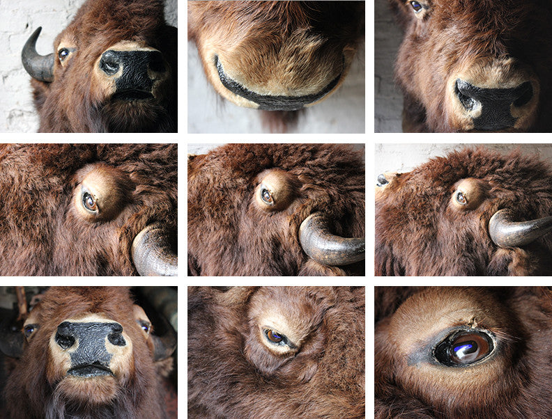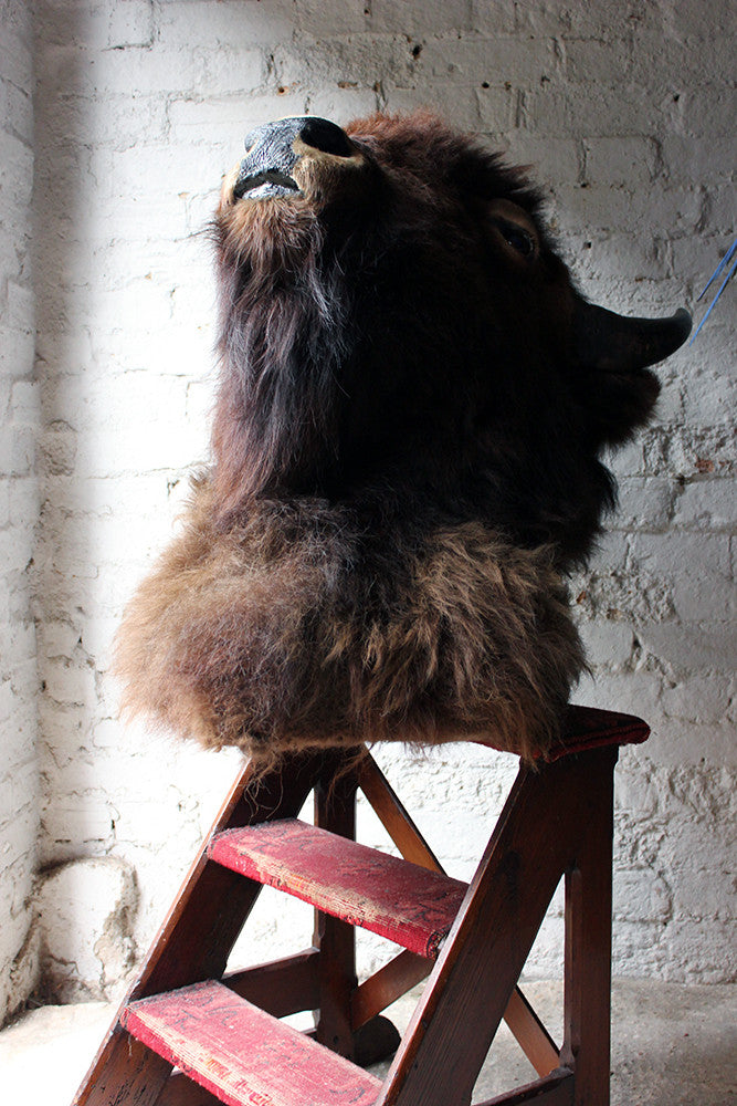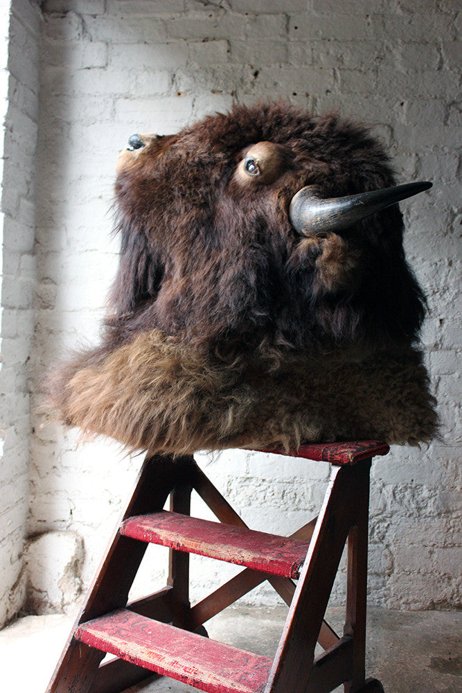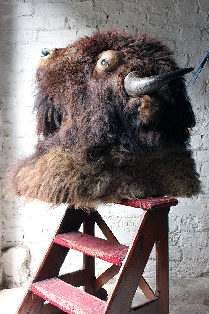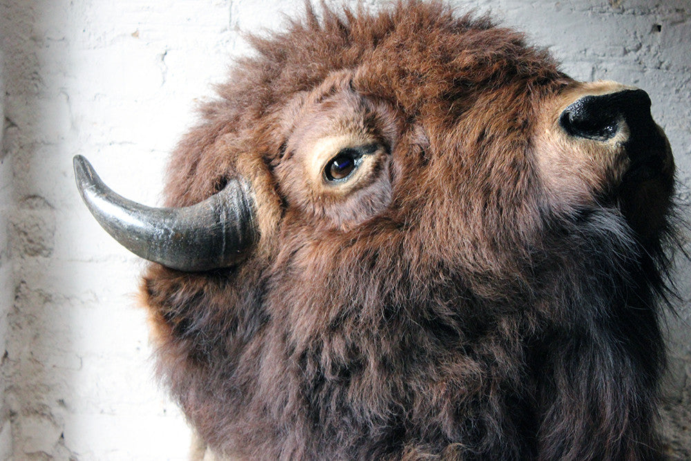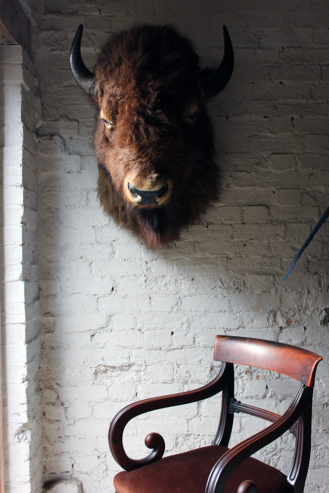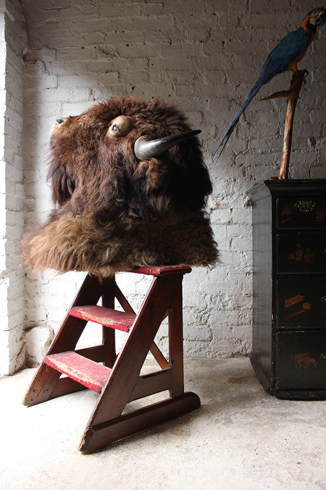 The massive American bison (Bison bison) head and neck mount, also commonly known as the American buffalo, having a shaggy, long, dark brown winter coat and short curved horns, the whole preserved in excellent all round condition from the middle part of the twentieth century.