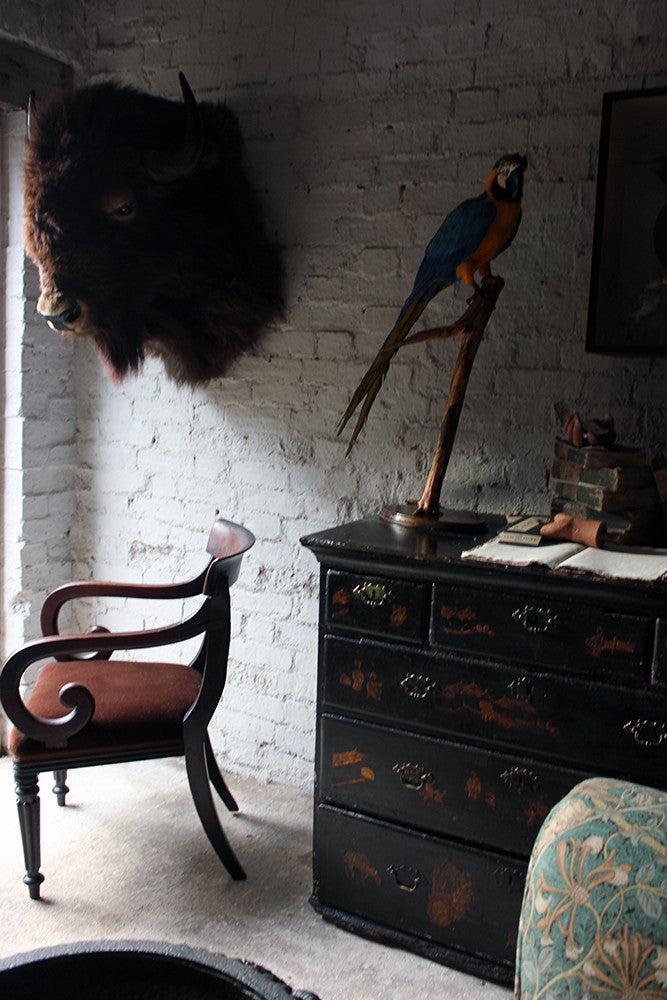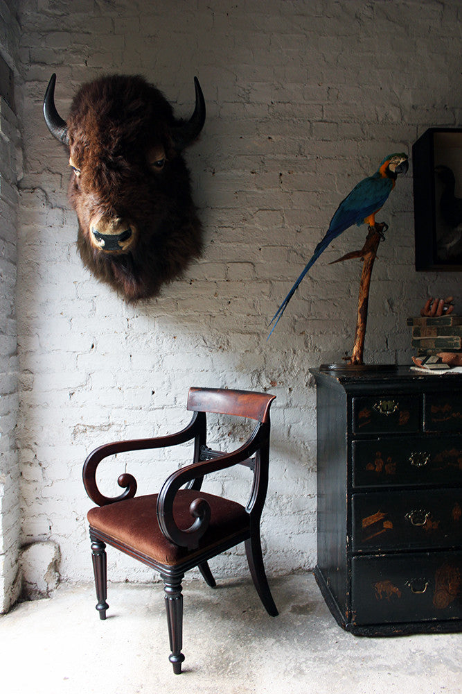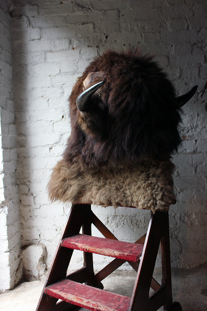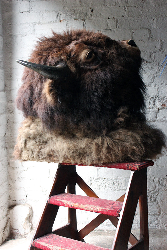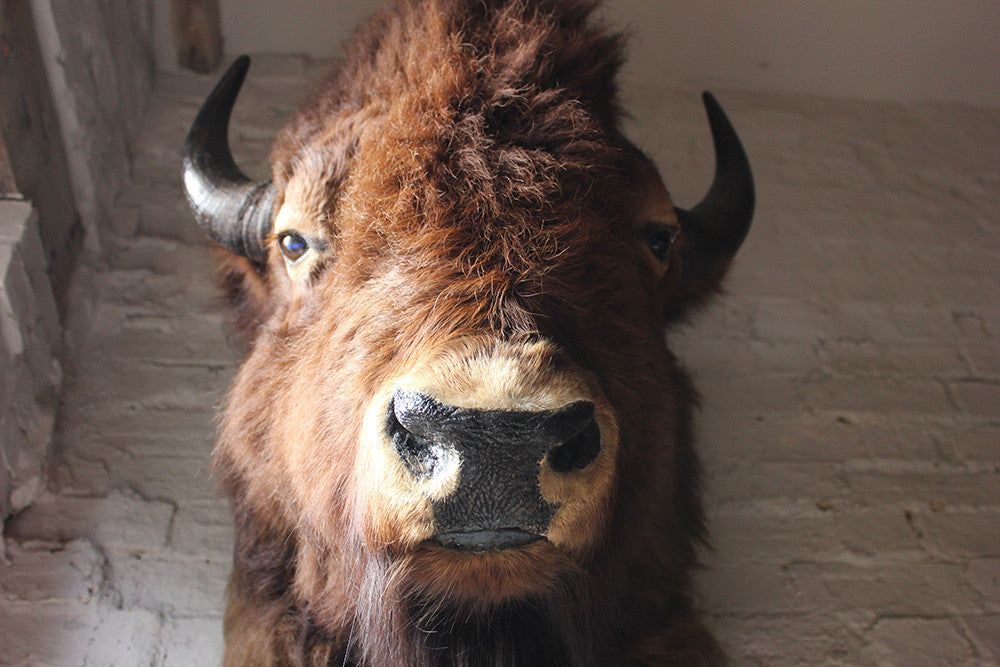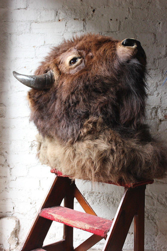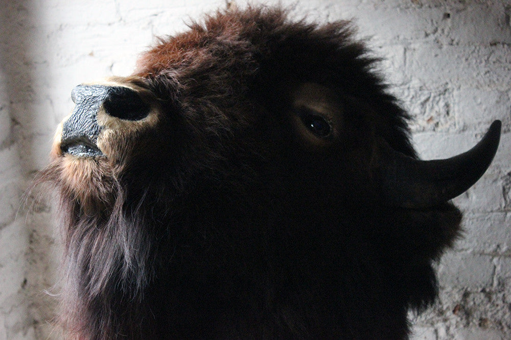 The massive American bison (Bison bison) head and neck mount, also commonly known as the American buffalo, having a shaggy, long, dark brown winter coat and short curved horns, the whole preserved in excellent all round condition from the middle part of the twentieth century.