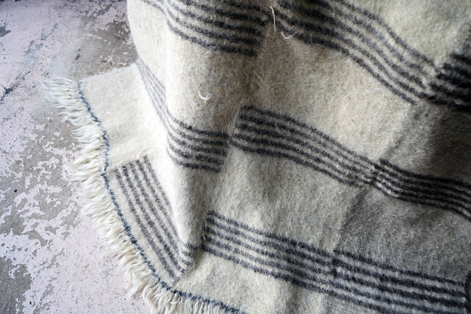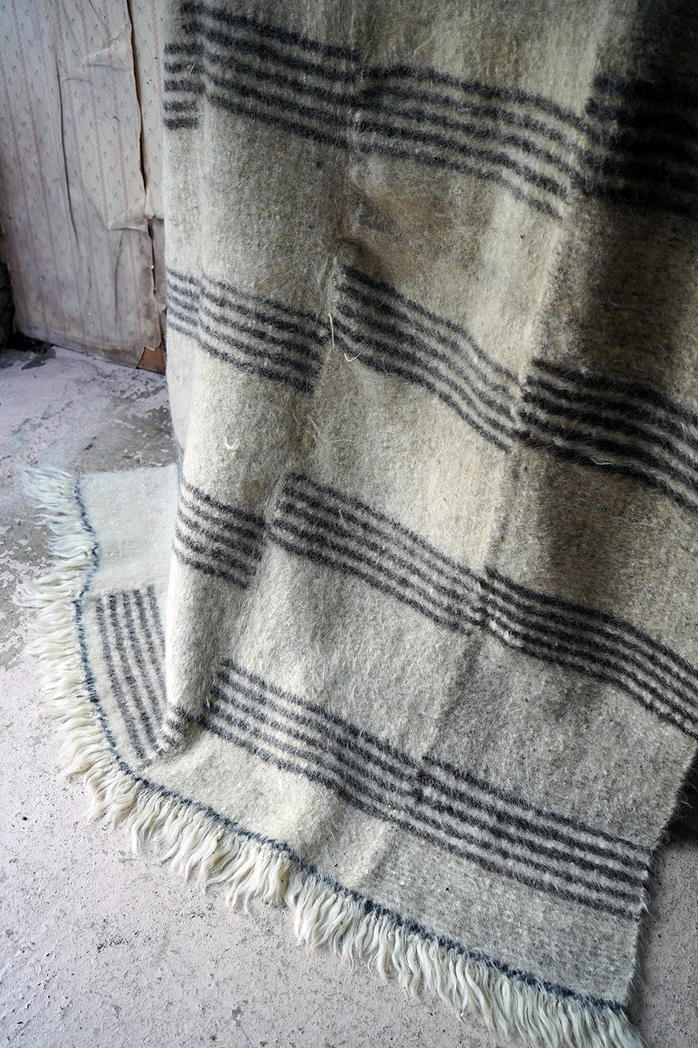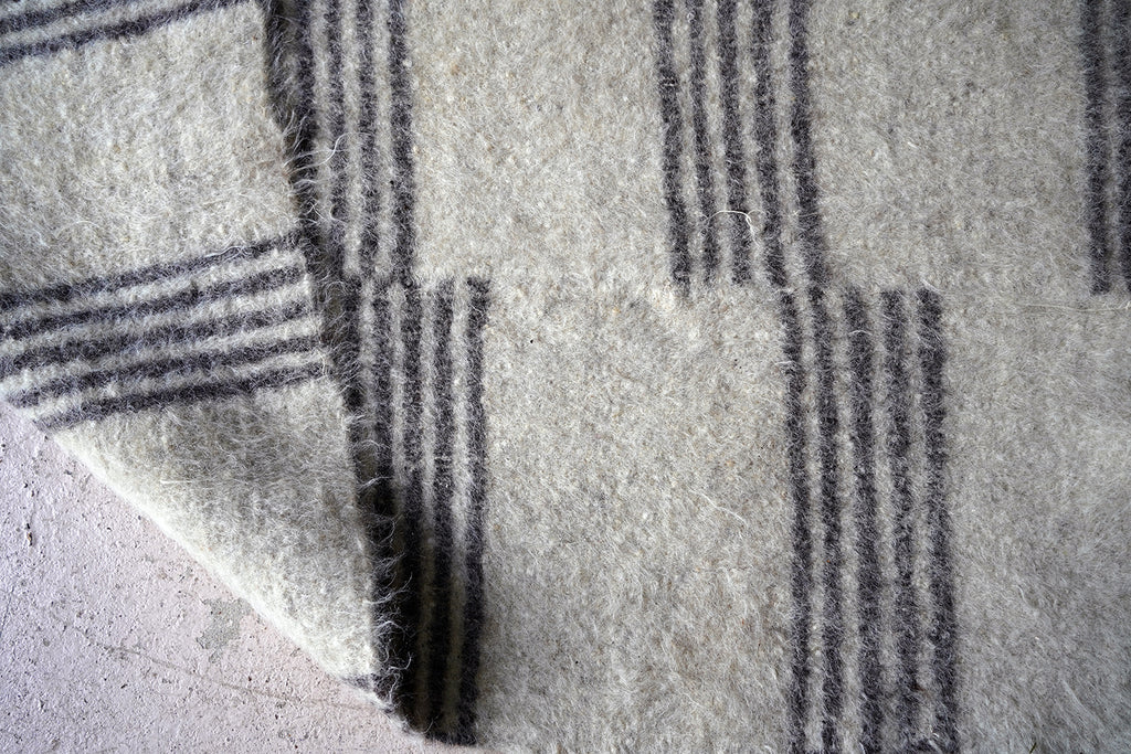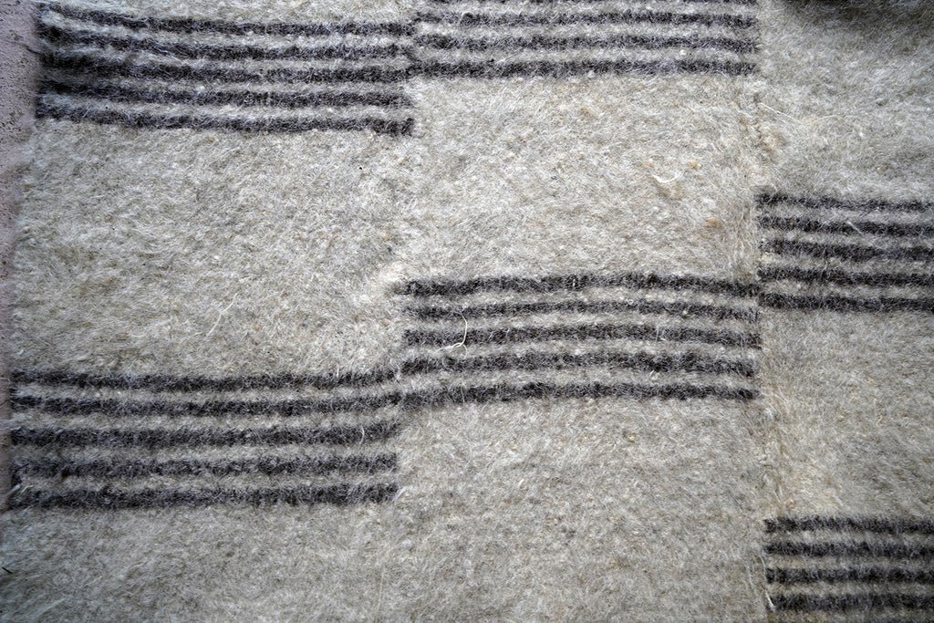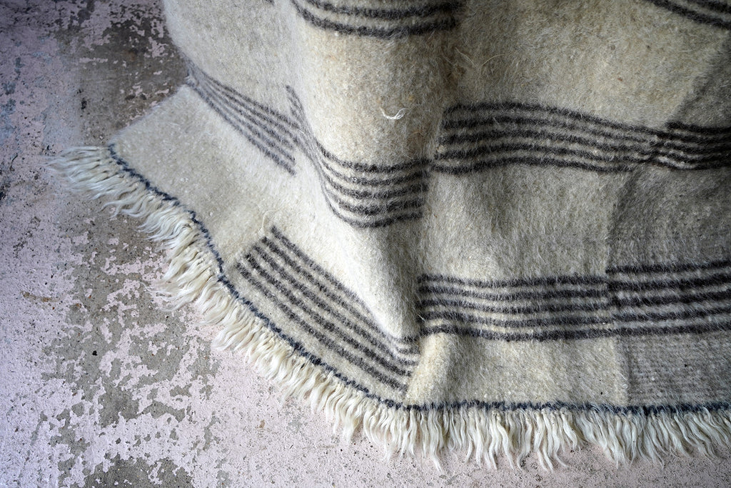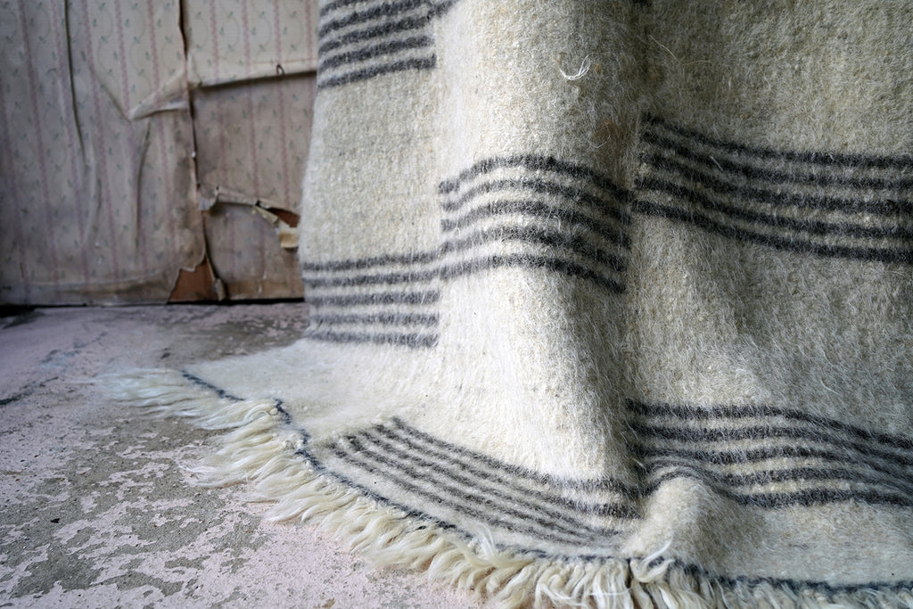 The dense weave heavy woollen blanket in soft muted colours, having several sections of five inky blue striped horizontal lines, versatile as either a throw or a carpet, and surviving from the third quarter of the twentieth century.