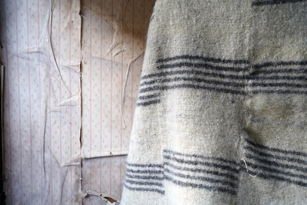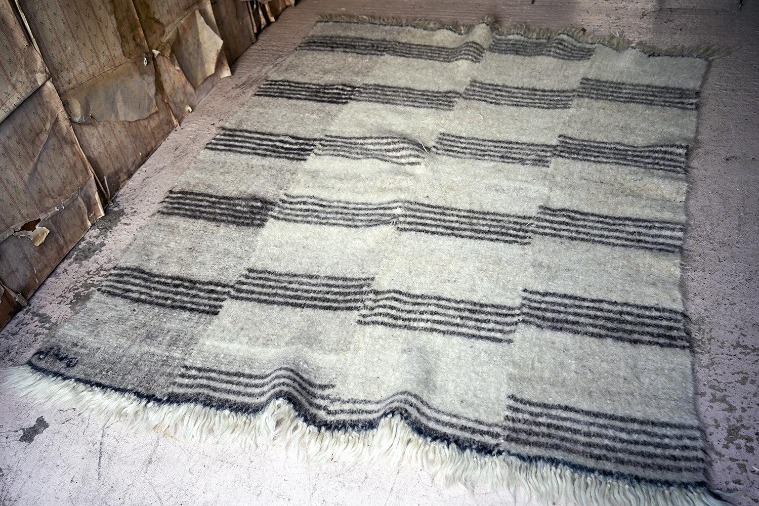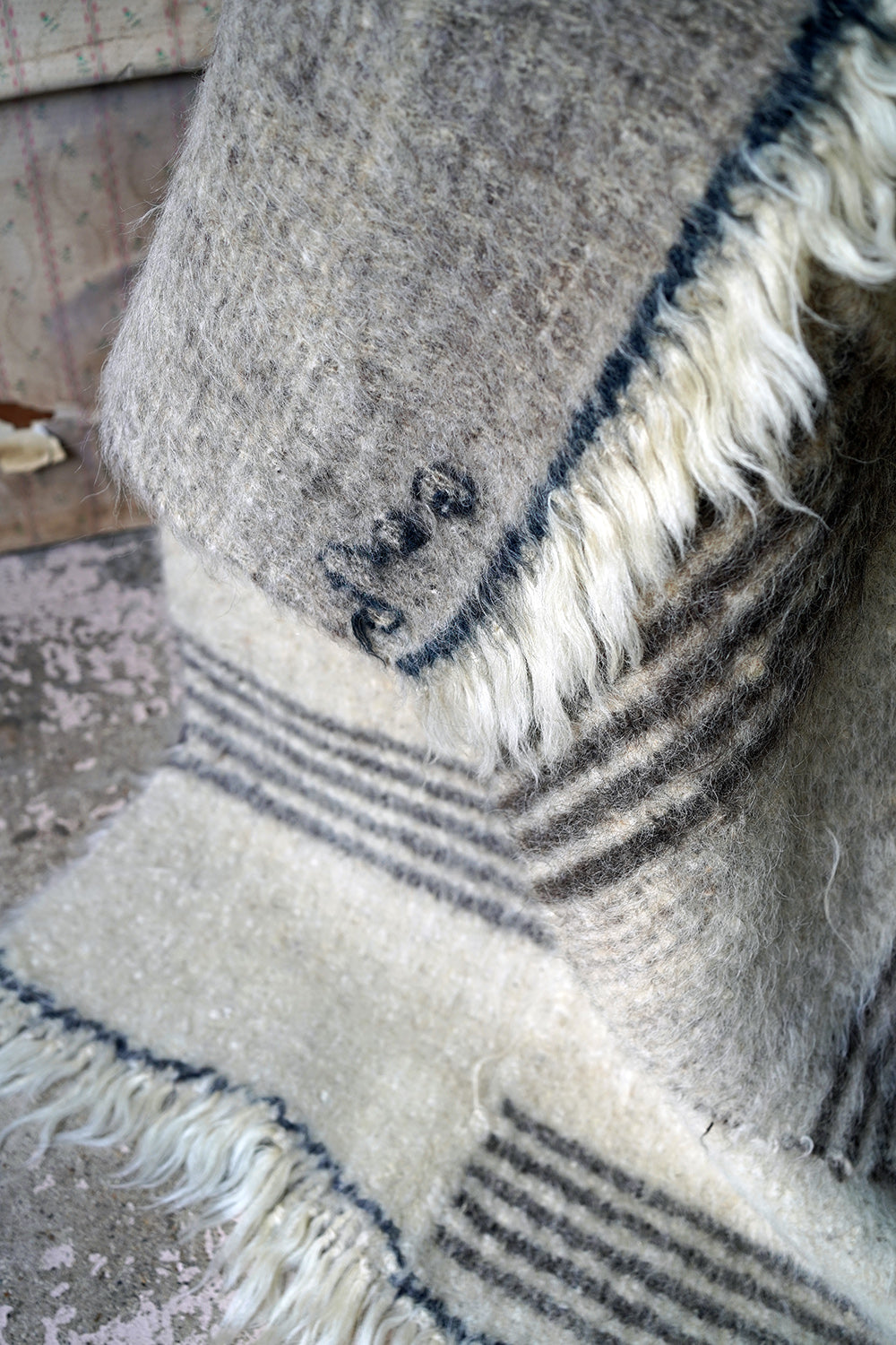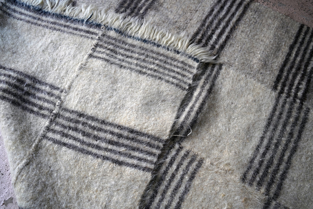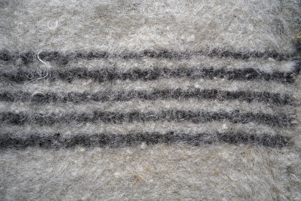 The dense weave heavy woollen blanket in soft muted colours, having several sections of five inky blue striped horizontal lines, versatile as either a throw or a carpet, and surviving from the third quarter of the twentieth century.