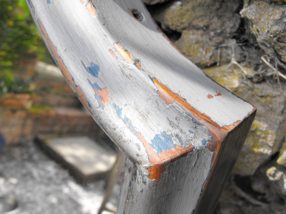 The large solid mahogany dressing mirror, now converted to a wall mirror, the original heavy plate glass is in excellent condition, the shaped mahogany reeded surround painted and distressed in two shades, slate to the top, and underneath, a dutch blue.