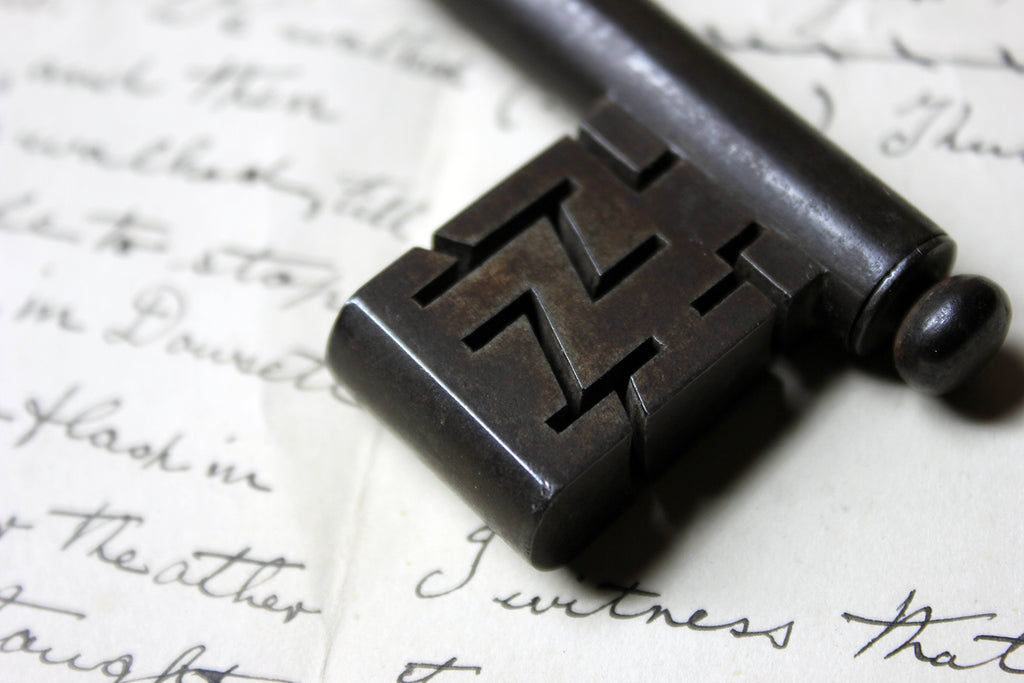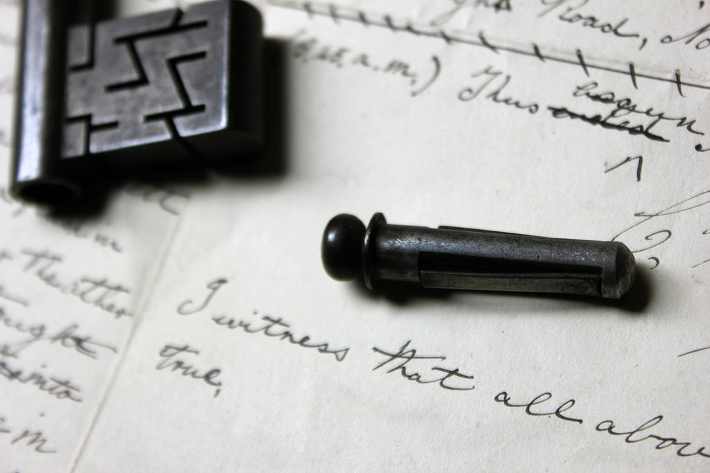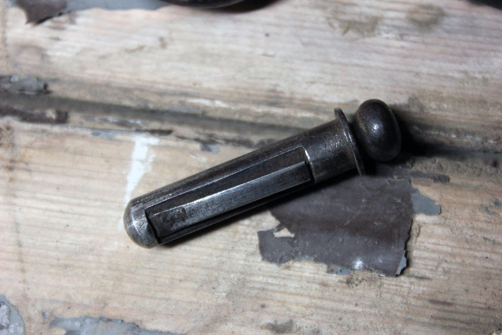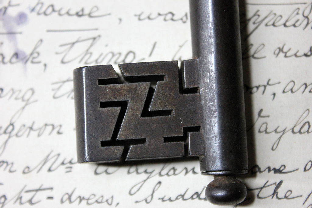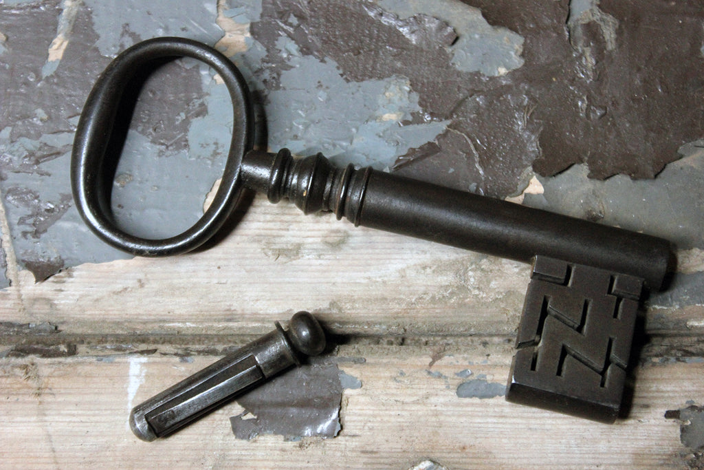 The steel or iron key having a secret compartment for concealing messages or hiding poison, possibly of WWII origin, the barrel tip being flanged and lifting out to a hollow interior.