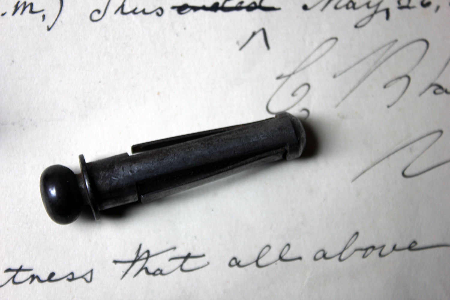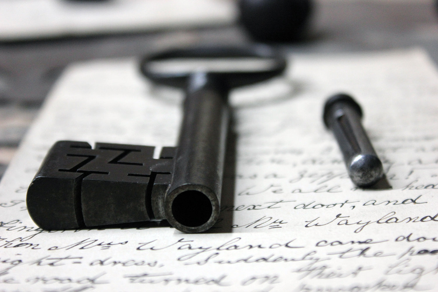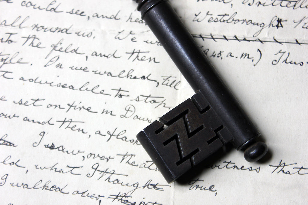 The steel or iron key having a secret compartment for concealing messages or hiding poison, possibly of WWII origin, the barrel tip being flanged and lifting out to a hollow interior.