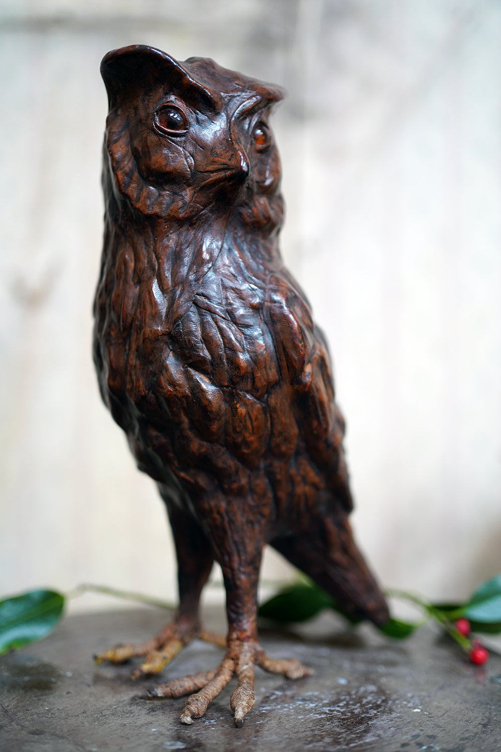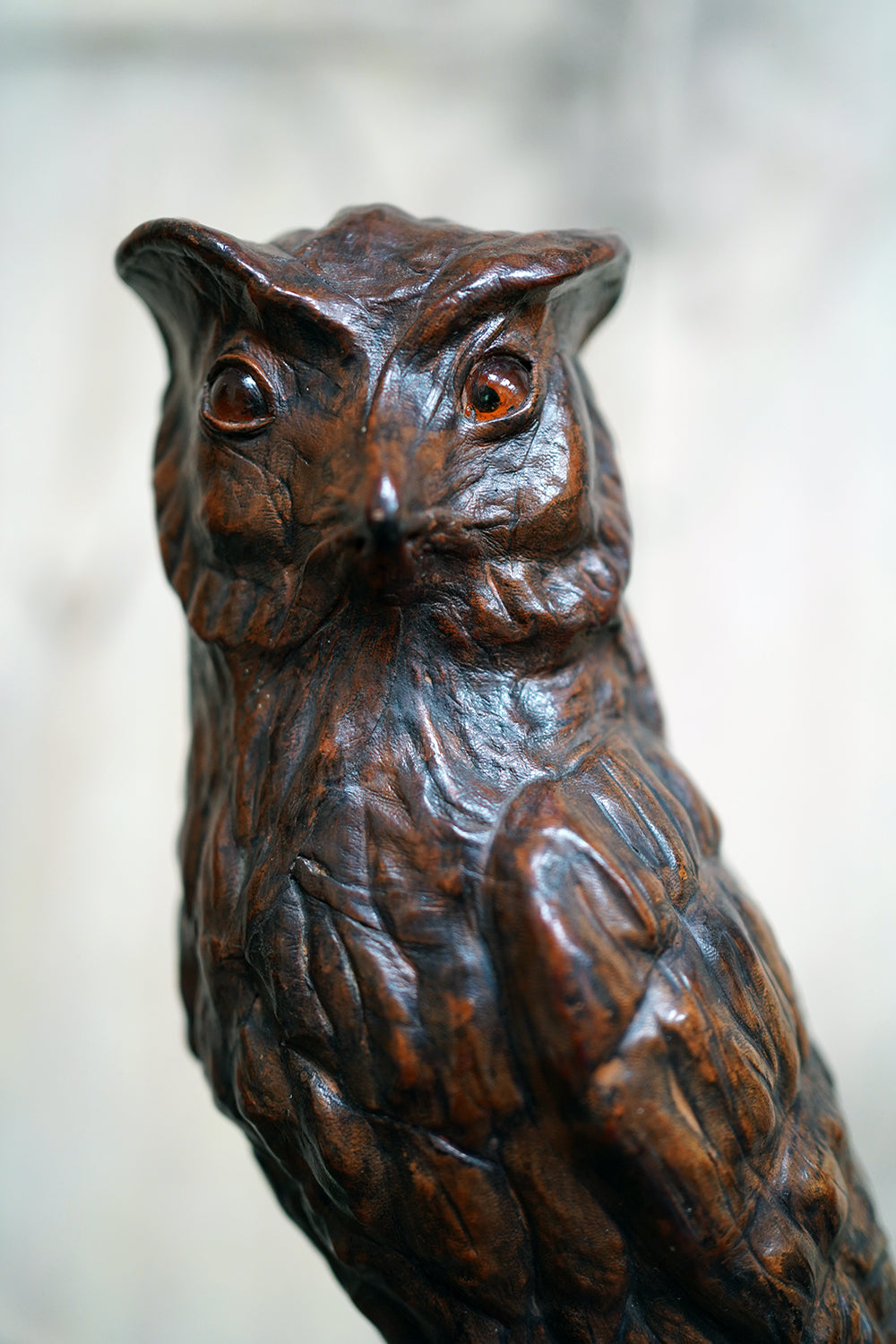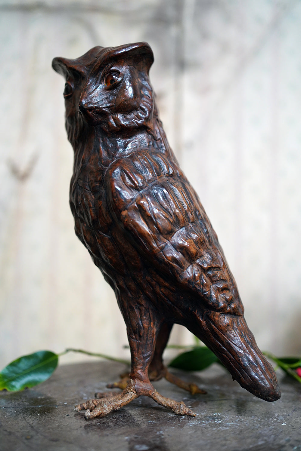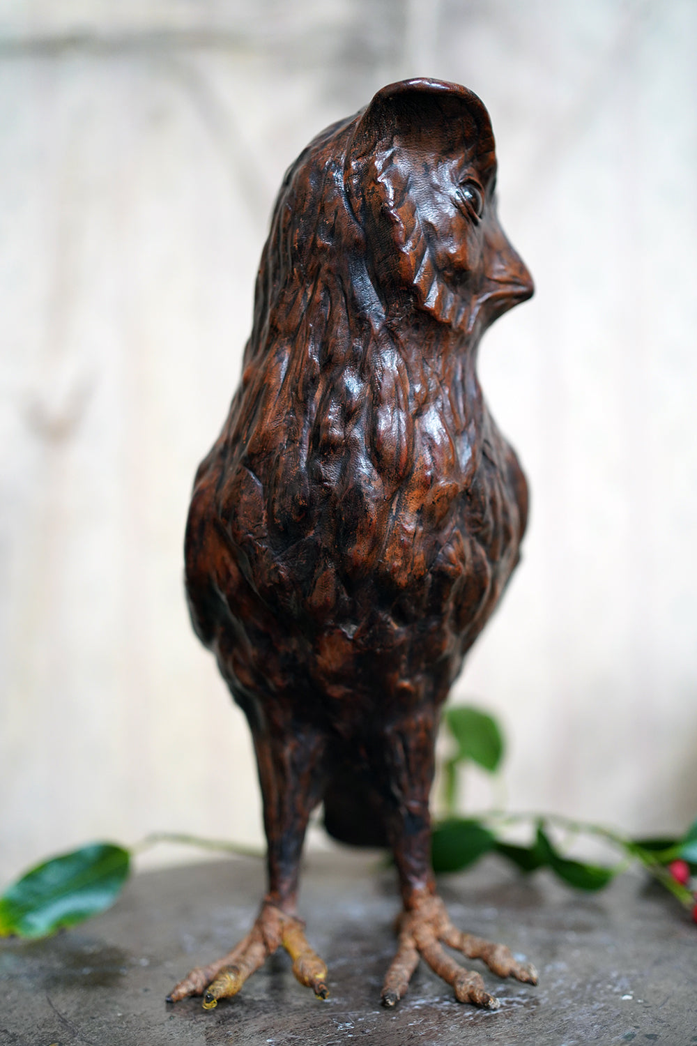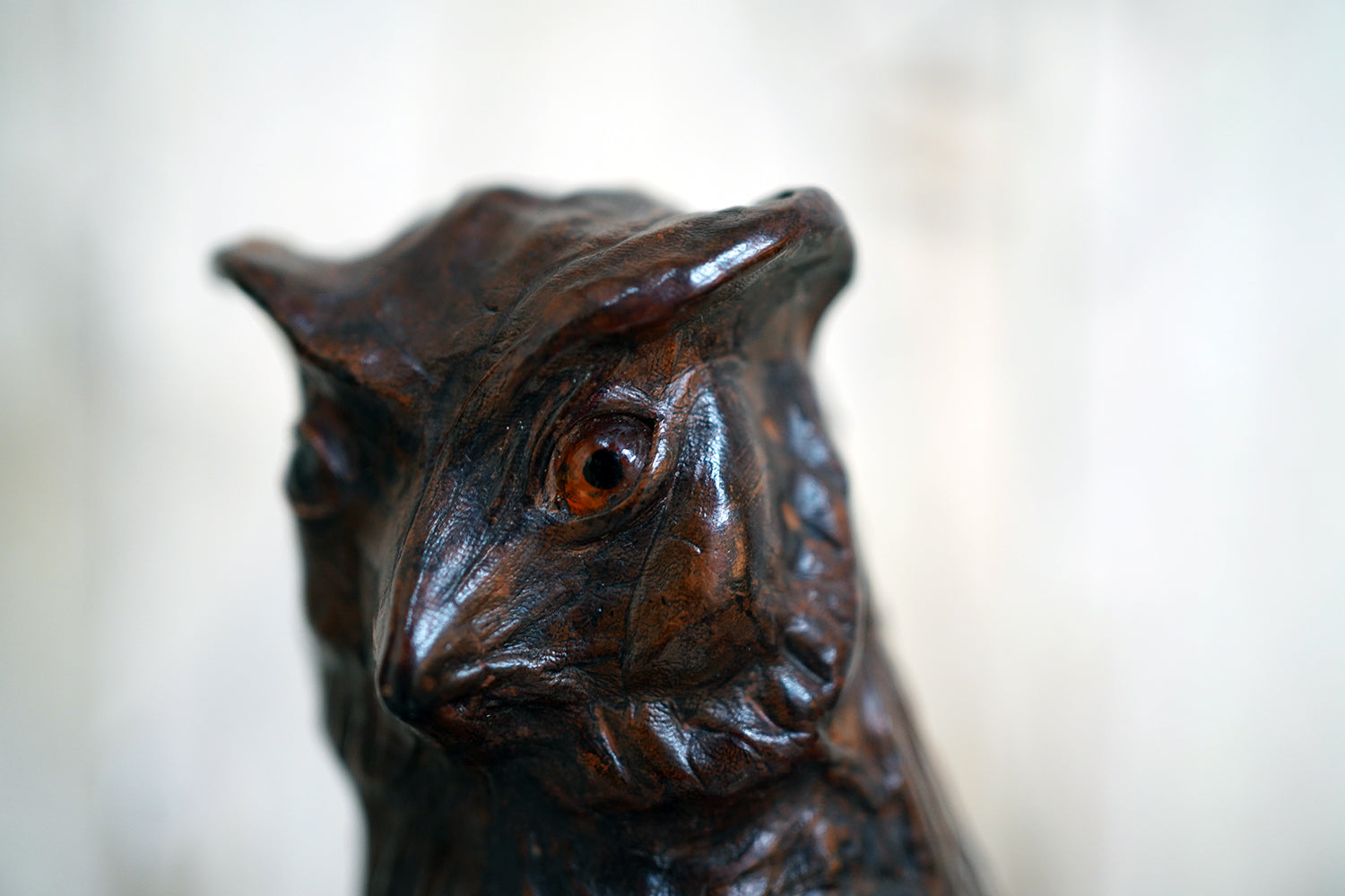 The striking and sculptural leather model of a horned owl, standing upright with head turned slightly to one side, the body worked entirely in richly patinated leather and carefully tooled to suggest layered plumage, the facial features strongly characterised, with a pronounced beak and inset amber-toned glass eyes lending a particularly arresting, almost sentient expression, the whole standing on finely modelled feet allowing the figure to stand freely and surviving from the second quarter of the twentieth century.