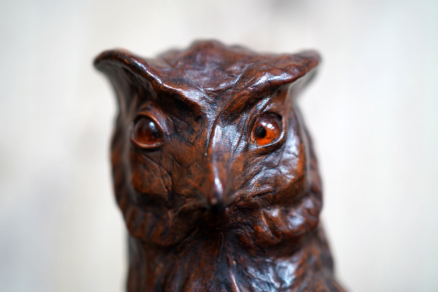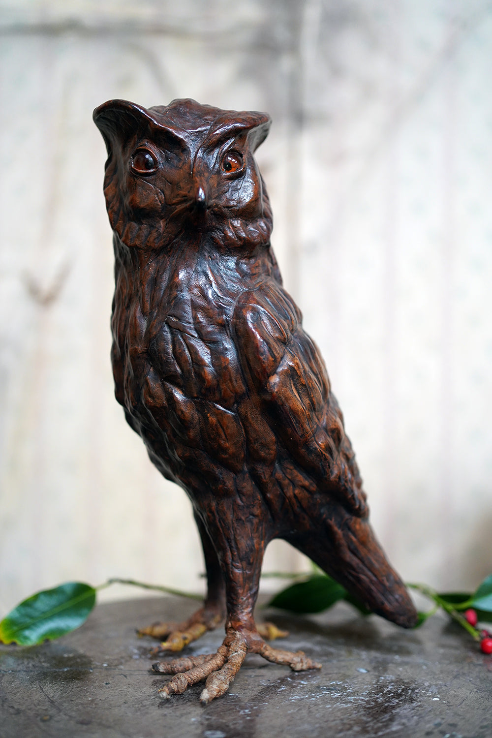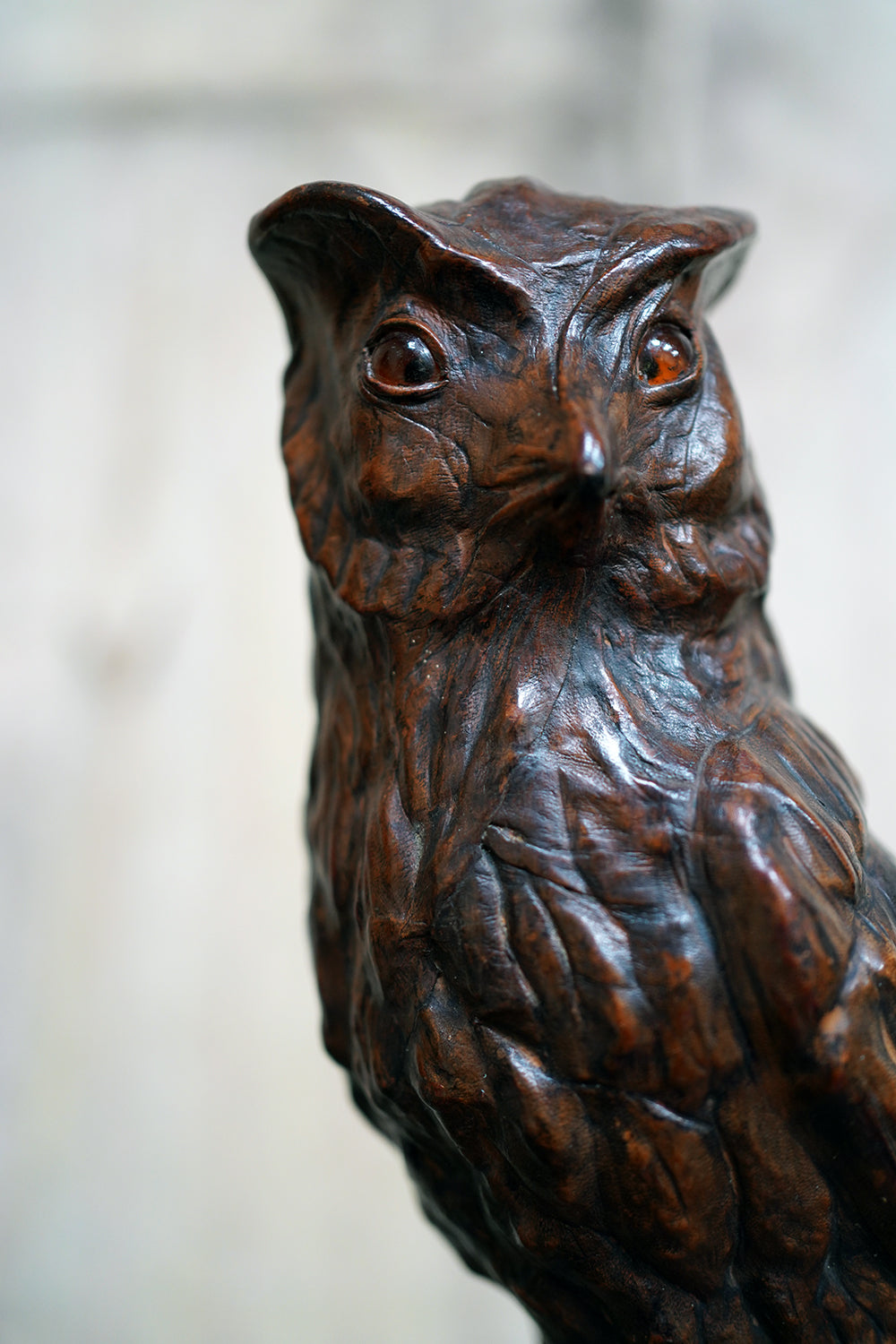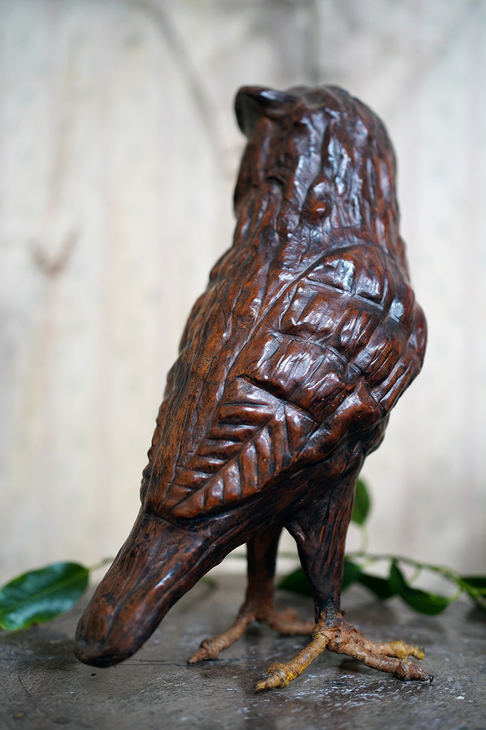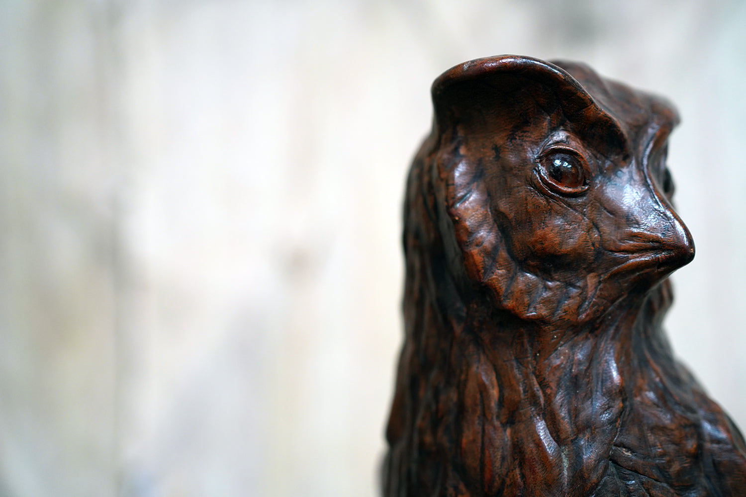 The striking and sculptural leather model of a horned owl, standing upright with head turned slightly to one side, the body worked entirely in richly patinated leather and carefully tooled to suggest layered plumage, the facial features strongly characterised, with a pronounced beak and inset amber-toned glass eyes lending a particularly arresting, almost sentient expression, the whole standing on finely modelled feet allowing the figure to stand freely and surviving from the second quarter of the twentieth century.