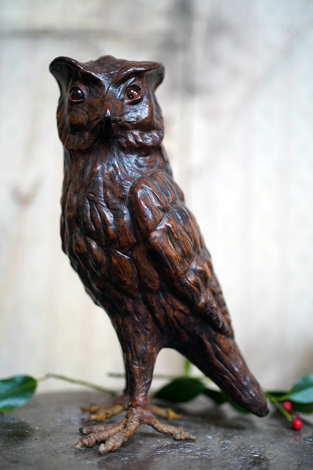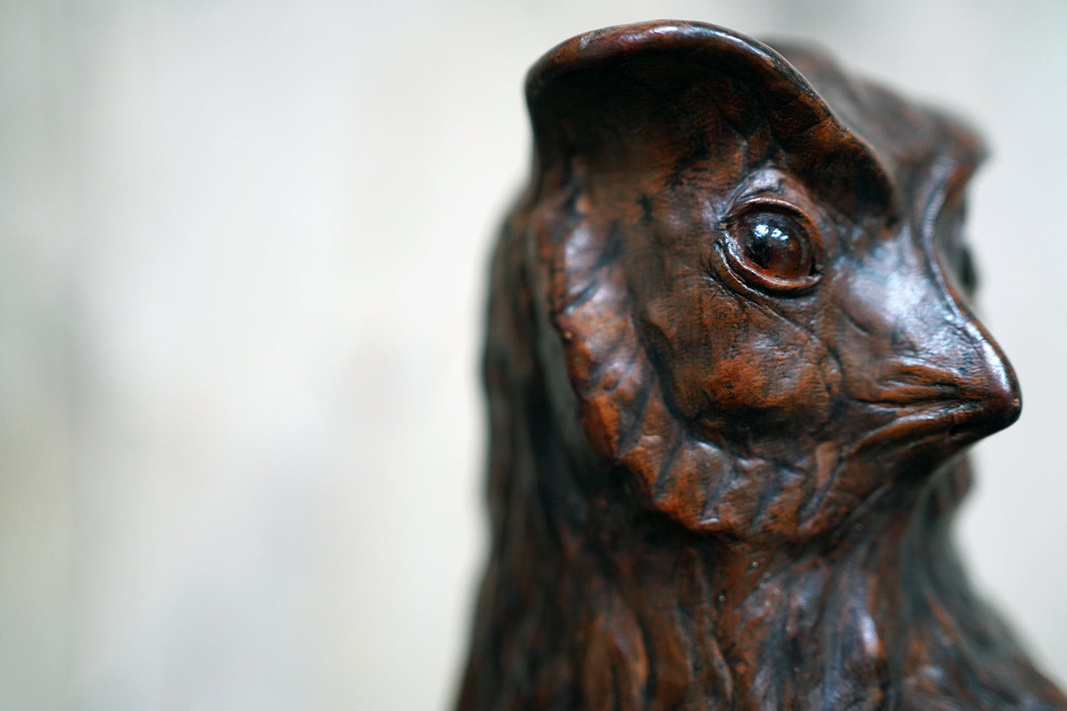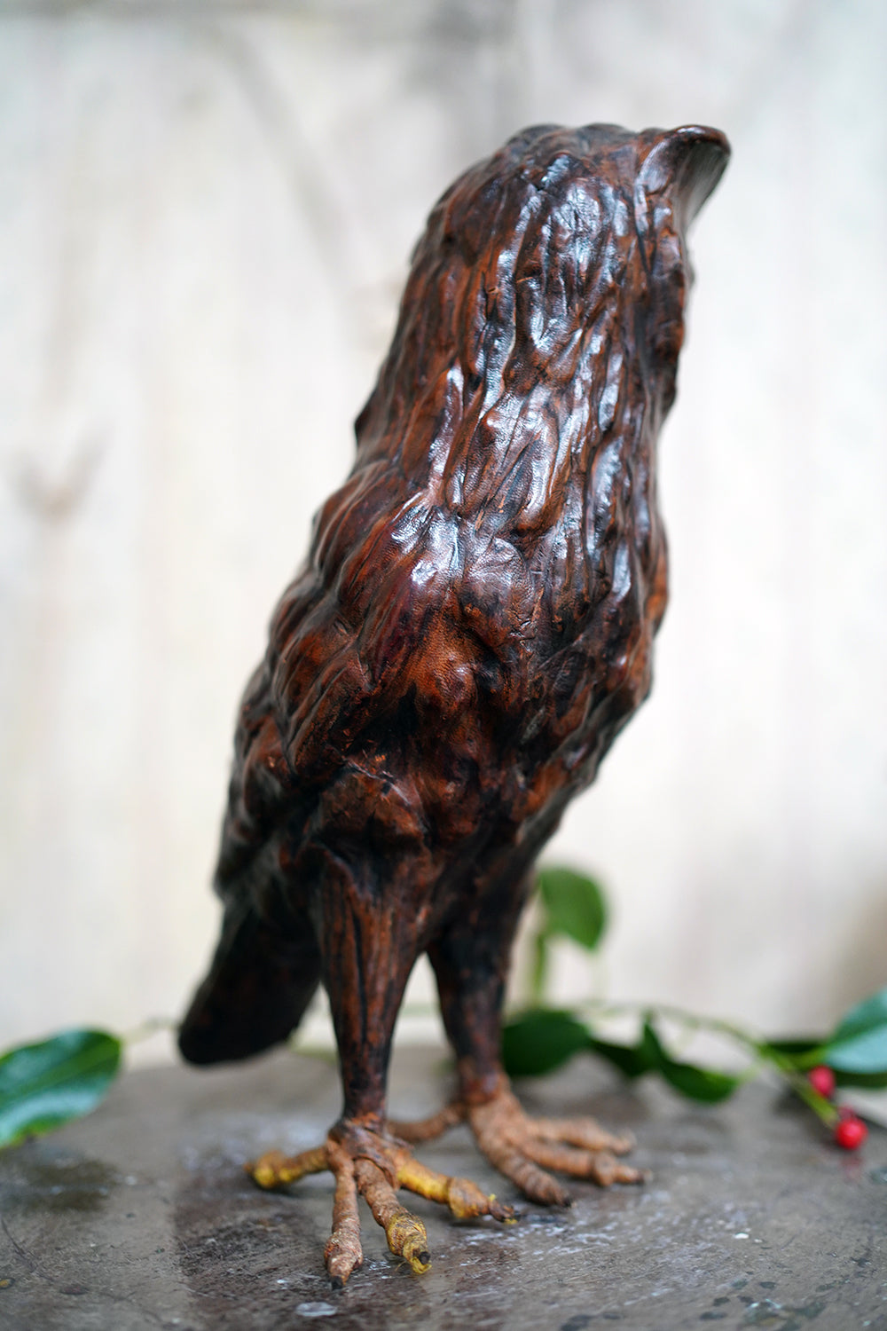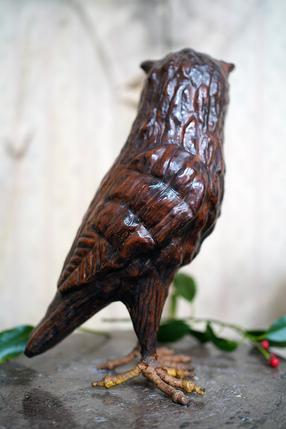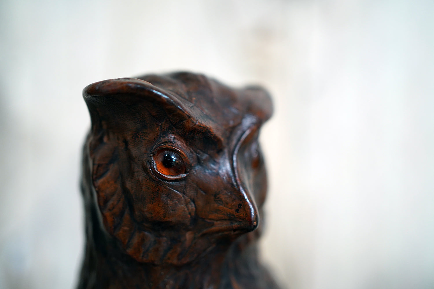 The striking and sculptural leather model of a horned owl, standing upright with head turned slightly to one side, the body worked entirely in richly patinated leather and carefully tooled to suggest layered plumage, the facial features strongly characterised, with a pronounced beak and inset amber-toned glass eyes lending a particularly arresting, almost sentient expression, the whole standing on finely modelled feet allowing the figure to stand freely and surviving from the second quarter of the twentieth century.