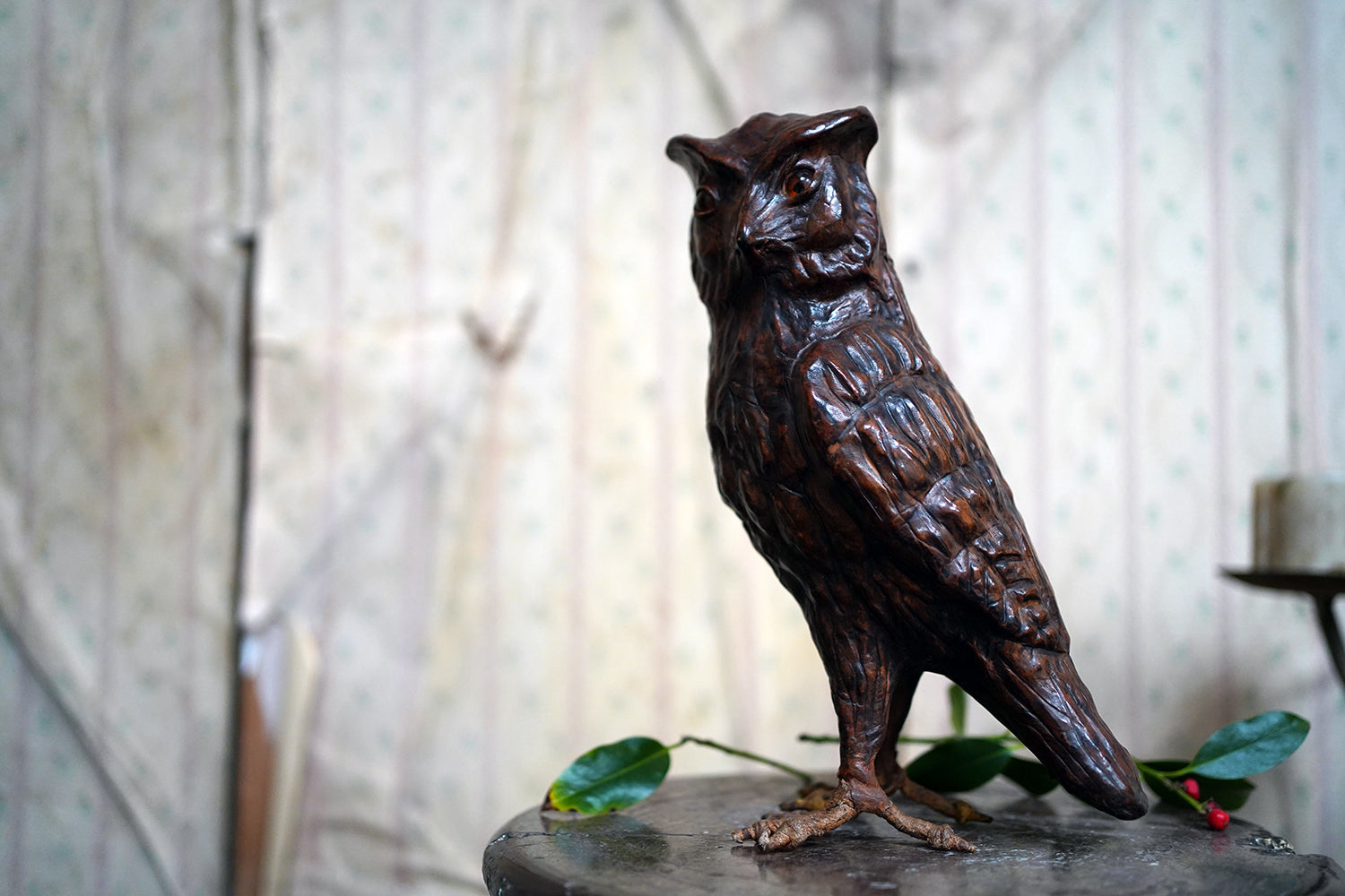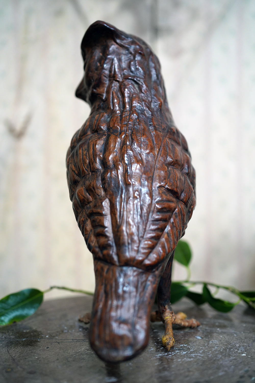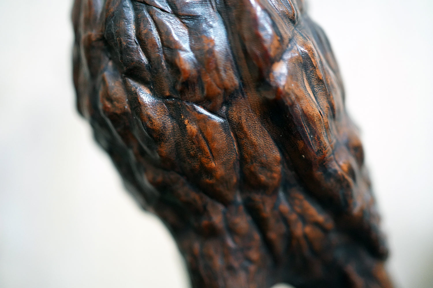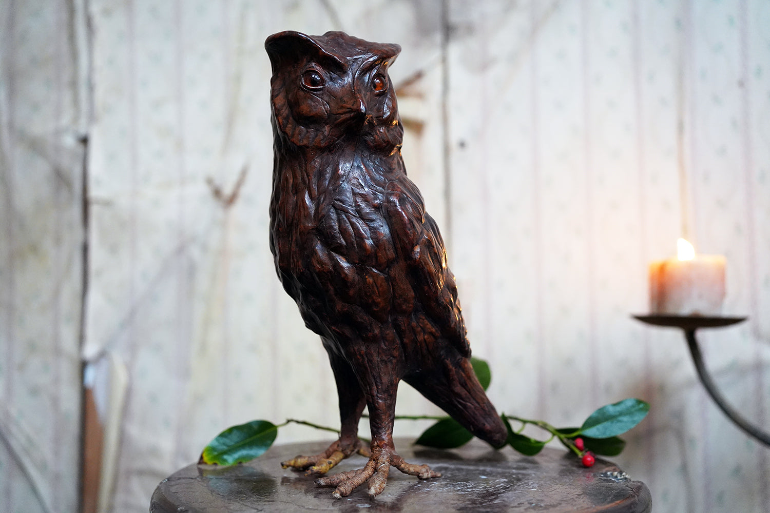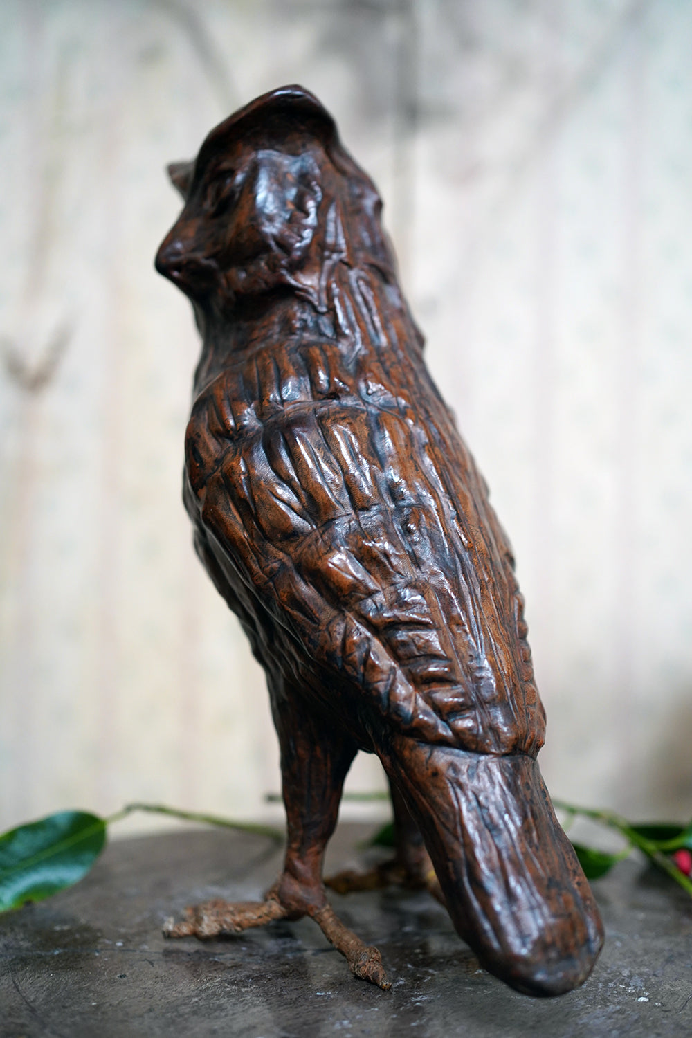 The striking and sculptural leather model of a horned owl, standing upright with head turned slightly to one side, the body worked entirely in richly patinated leather and carefully tooled to suggest layered plumage, the facial features strongly characterised, with a pronounced beak and inset amber-toned glass eyes lending a particularly arresting, almost sentient expression, the whole standing on finely modelled feet allowing the figure to stand freely and surviving from the second quarter of the twentieth century.