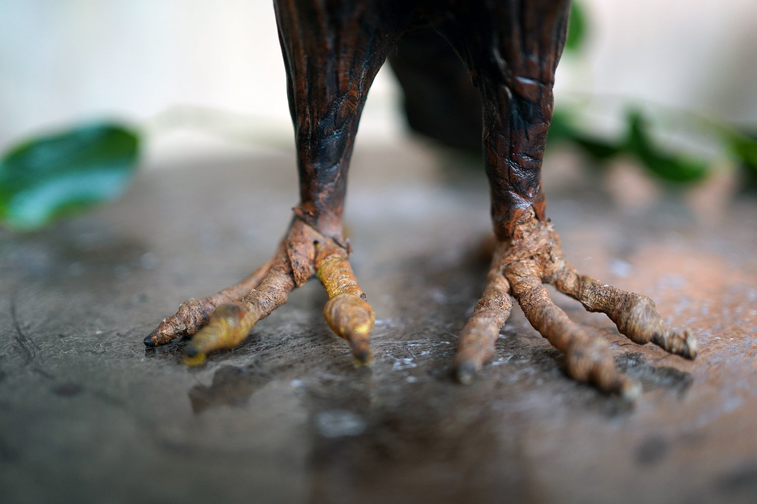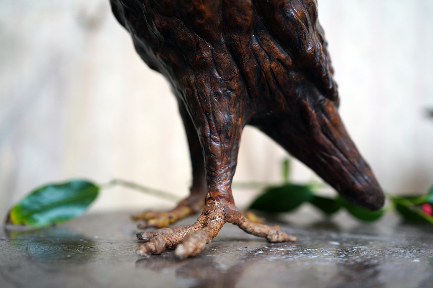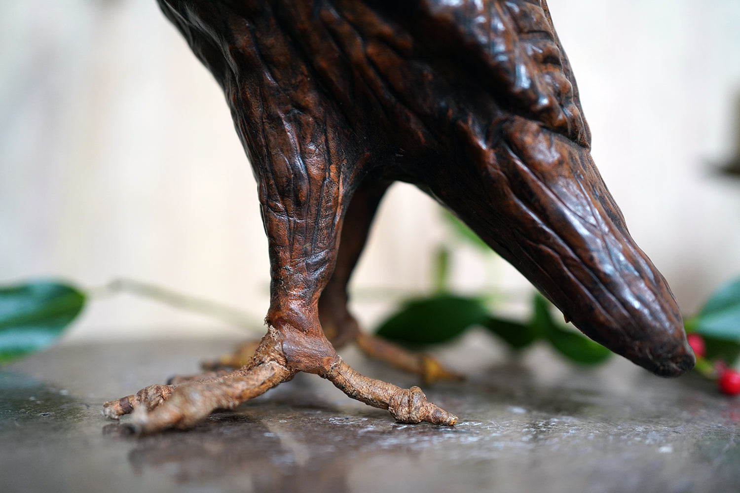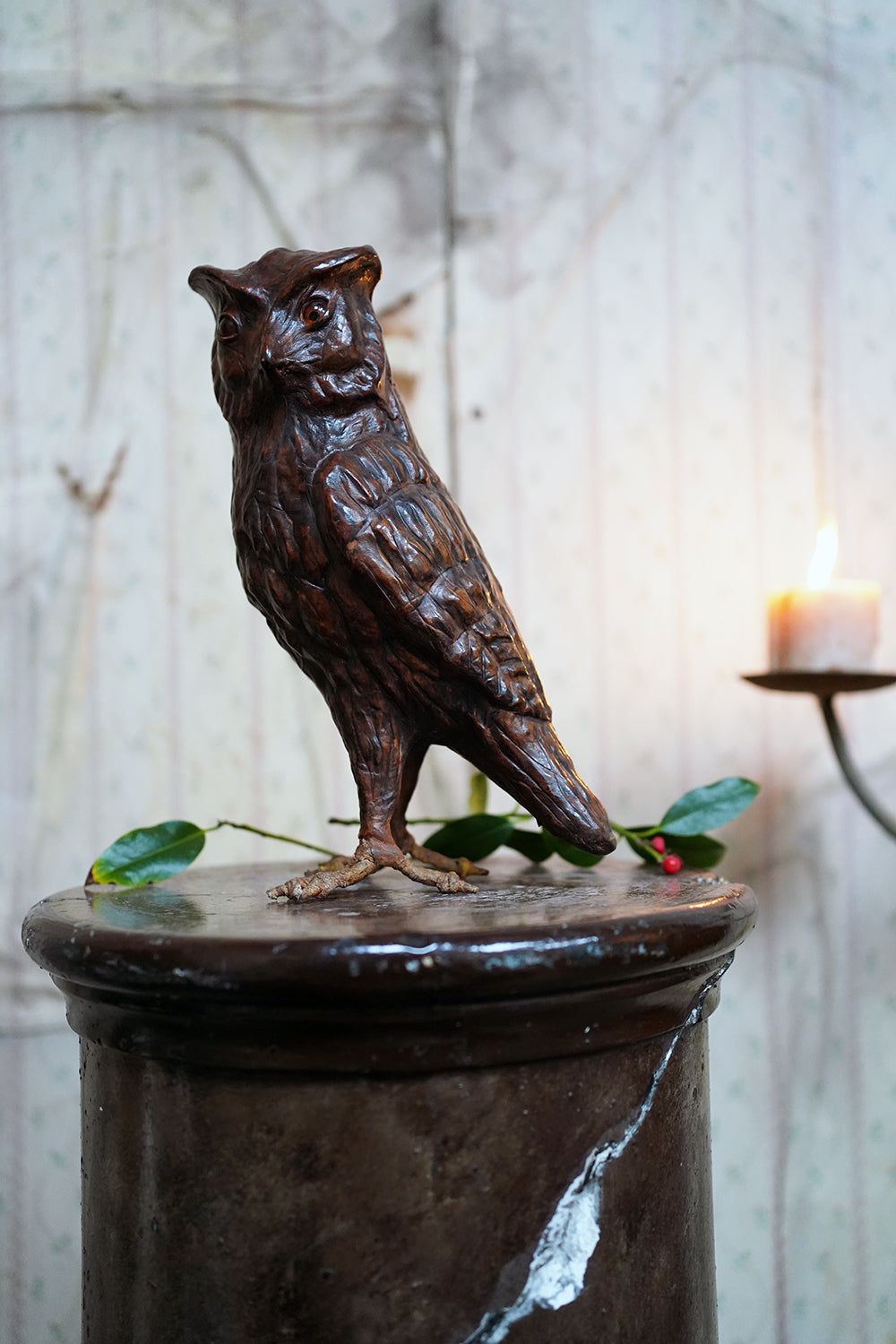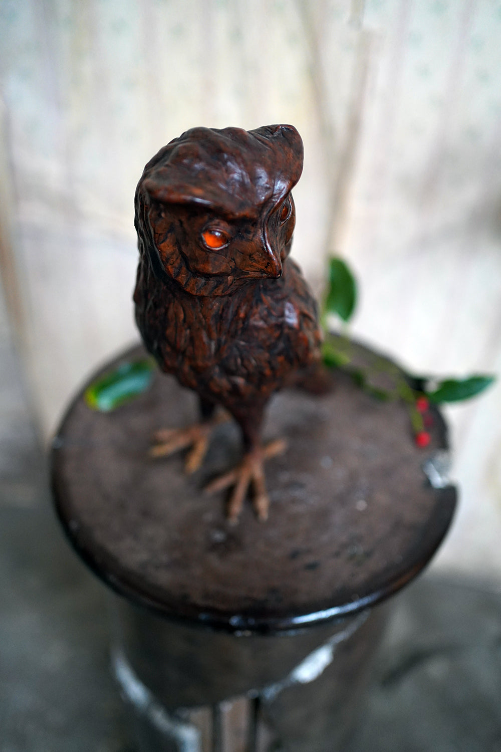 The striking and sculptural leather model of a horned owl, standing upright with head turned slightly to one side, the body worked entirely in richly patinated leather and carefully tooled to suggest layered plumage, the facial features strongly characterised, with a pronounced beak and inset amber-toned glass eyes lending a particularly arresting, almost sentient expression, the whole standing on finely modelled feet allowing the figure to stand freely and surviving from the second quarter of the twentieth century.