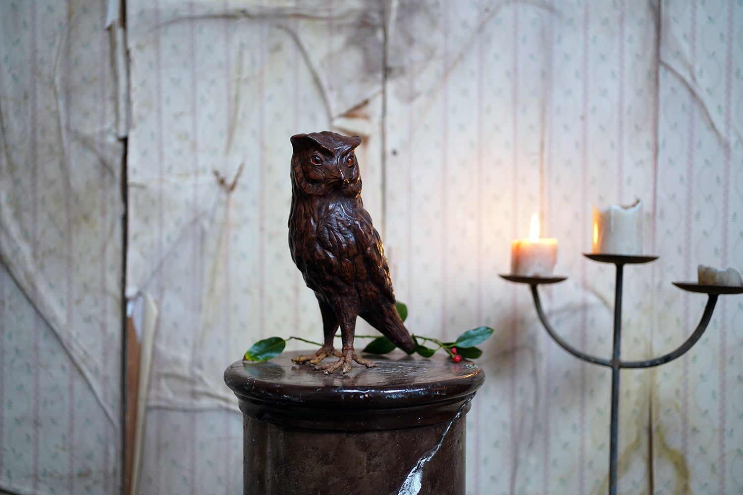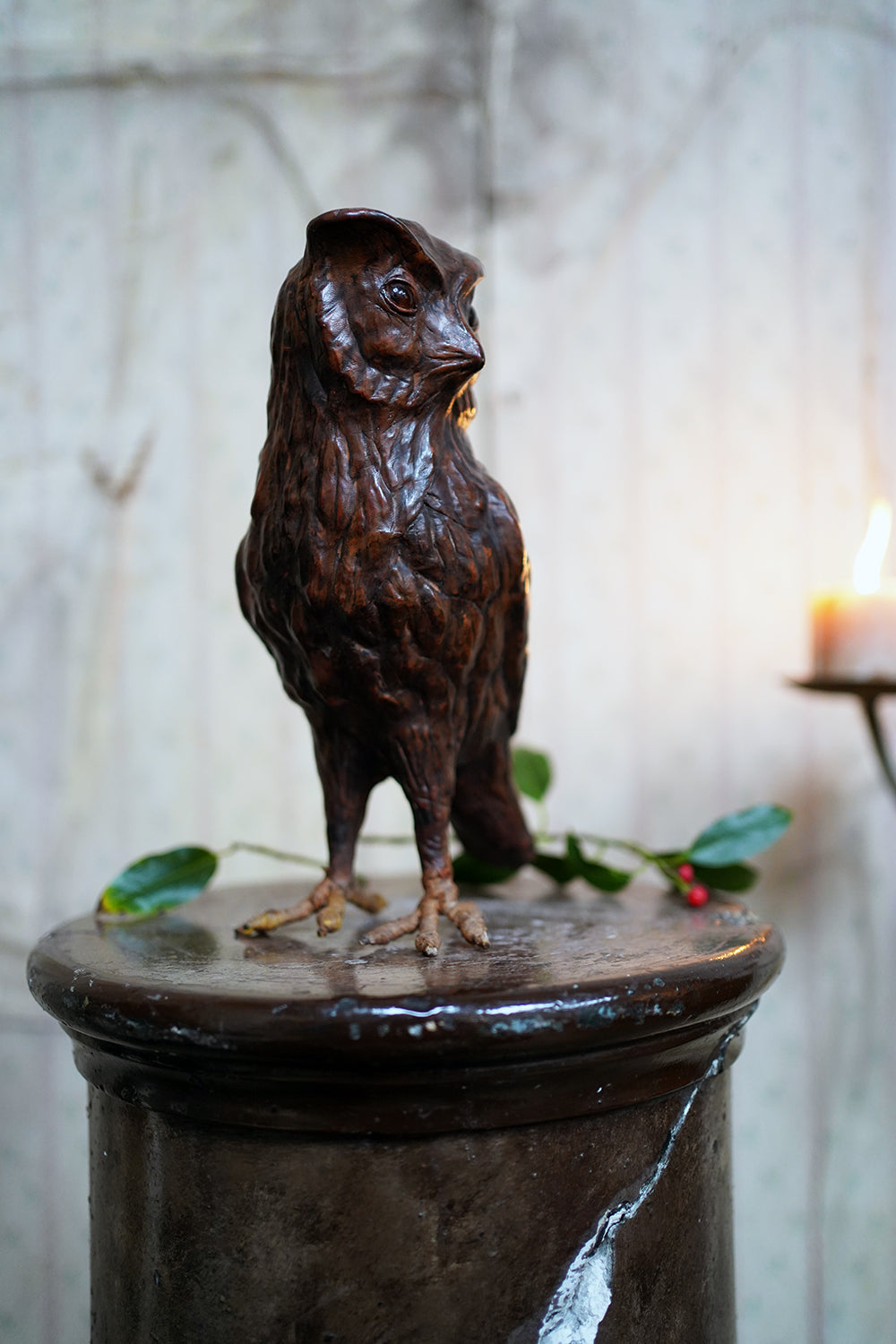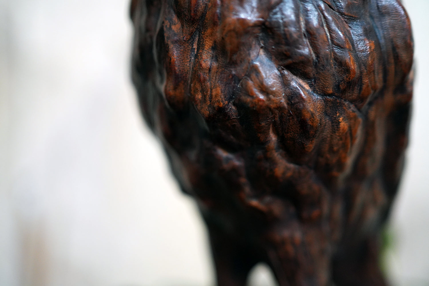 Leather animal figures of this type are most closely associated with the Arts & Crafts and Art Nouveau periods and are often linked to the decorative output of Liberty & Co. of London in the late nineteenth and early twentieth centuries. Liberty retailed a range of exotic and whimsical objects made from unconventional materials, including repoussé metal, carved wood, and leather, with Omersa creating their first leather pig in 1927, and frequently drew inspiration from nature and folklore. Owls, symbols of wisdom and nocturnal mystery, were particularly favoured motifs during this period with the likes of William Morris et al. Whilst appearing to be unsigned, the quality of modelling, choice of material, and sculptural confidence place this example firmly within that tradition.
