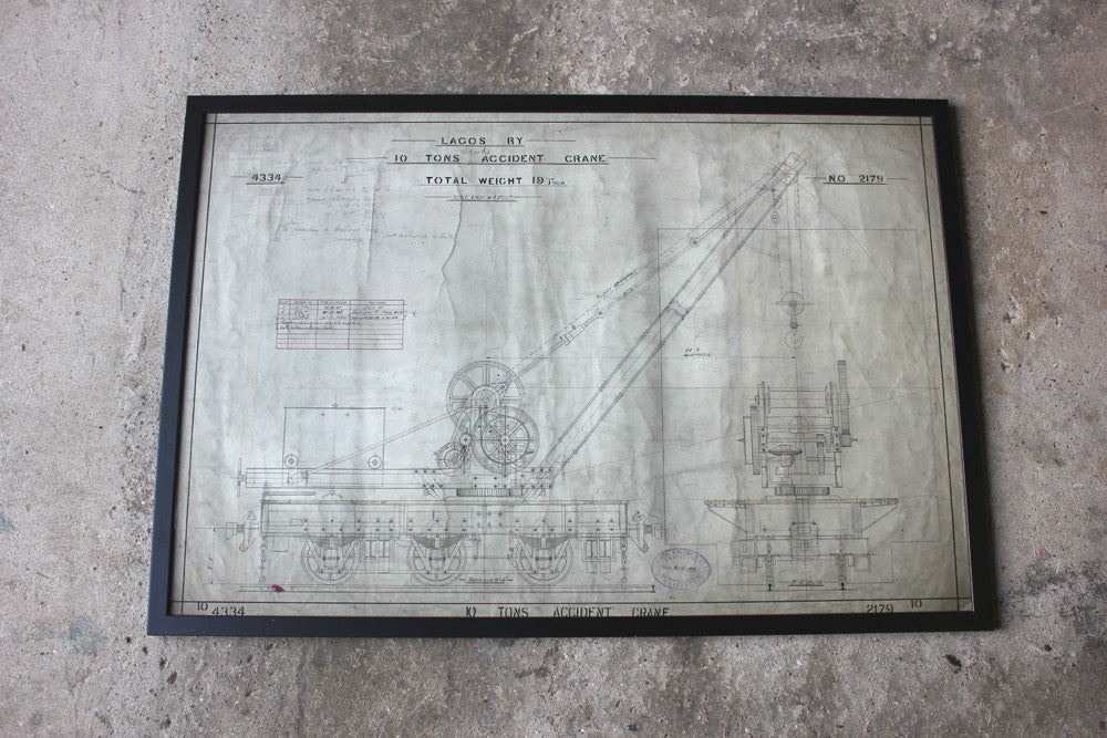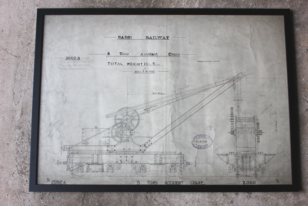 The group of five large framed and glazed pencil and ink intricately hand drawn illustration plans on linen to include ‘5 Tons Accident Crane, Barsi Railway’, ‘35 Cwt Steam Travelling Coal Whipping Crane’, ‘10 Tons Hand Accident Crane, Lagos Railway’, ‘7 Tons Hand Accident Crane Caledonian Railway’ and ‘20 Tons Hand Breakdown Crane, San Paulo Railway’, all dated to 1896 through to 1903 and prepared by Cowans Sheldon & Co Ltd Engineering, St. Nicholas Works, Carlisle.