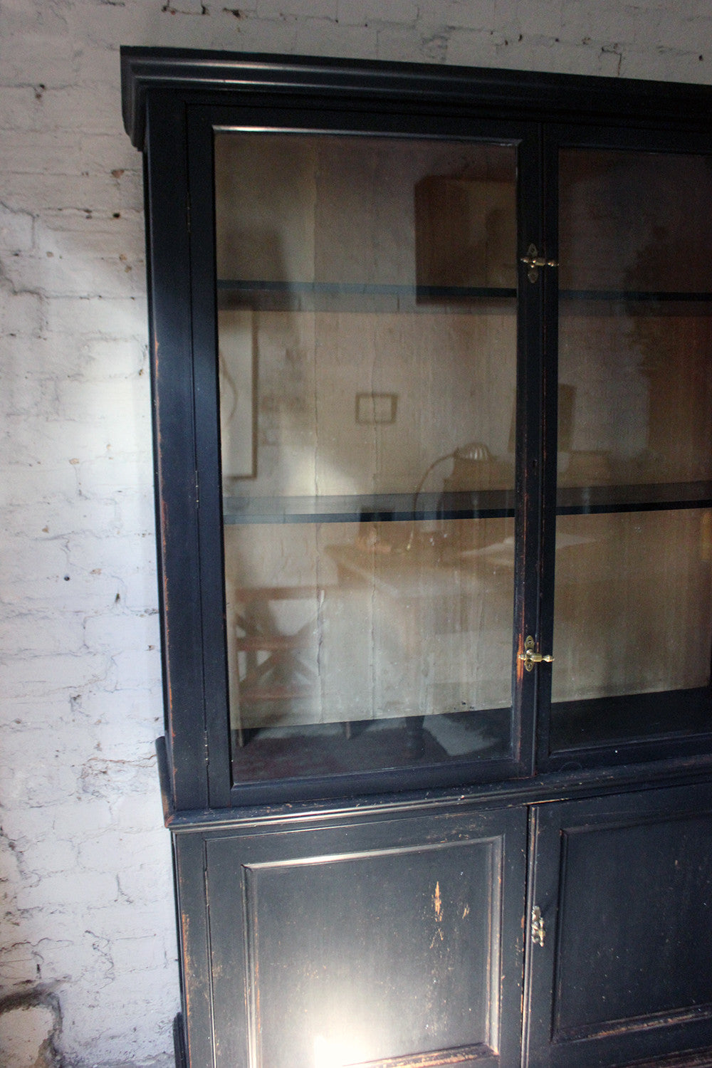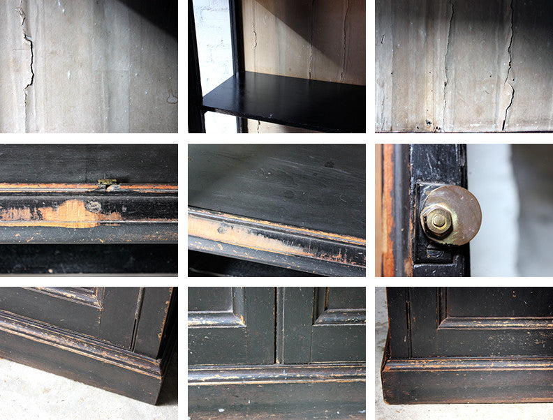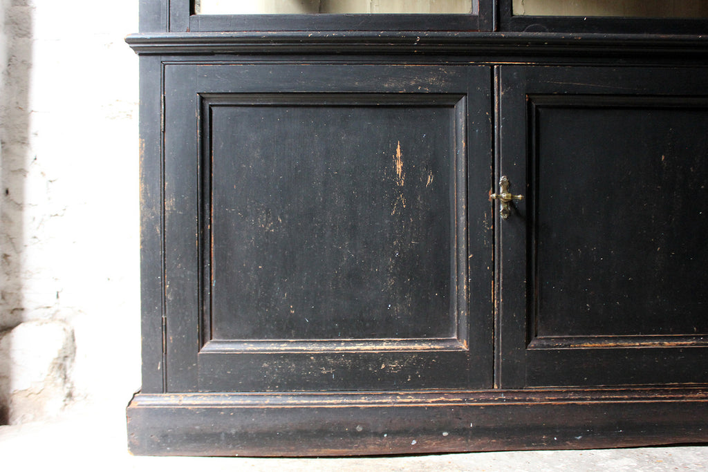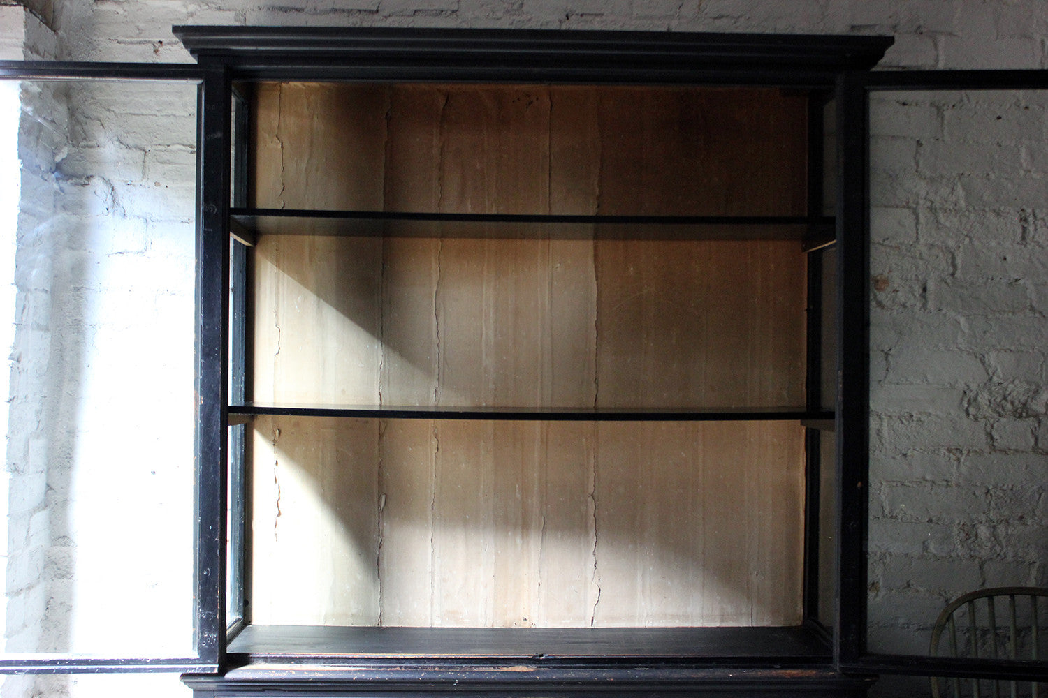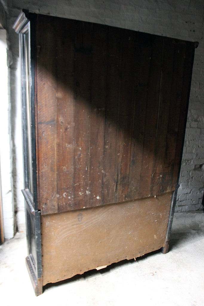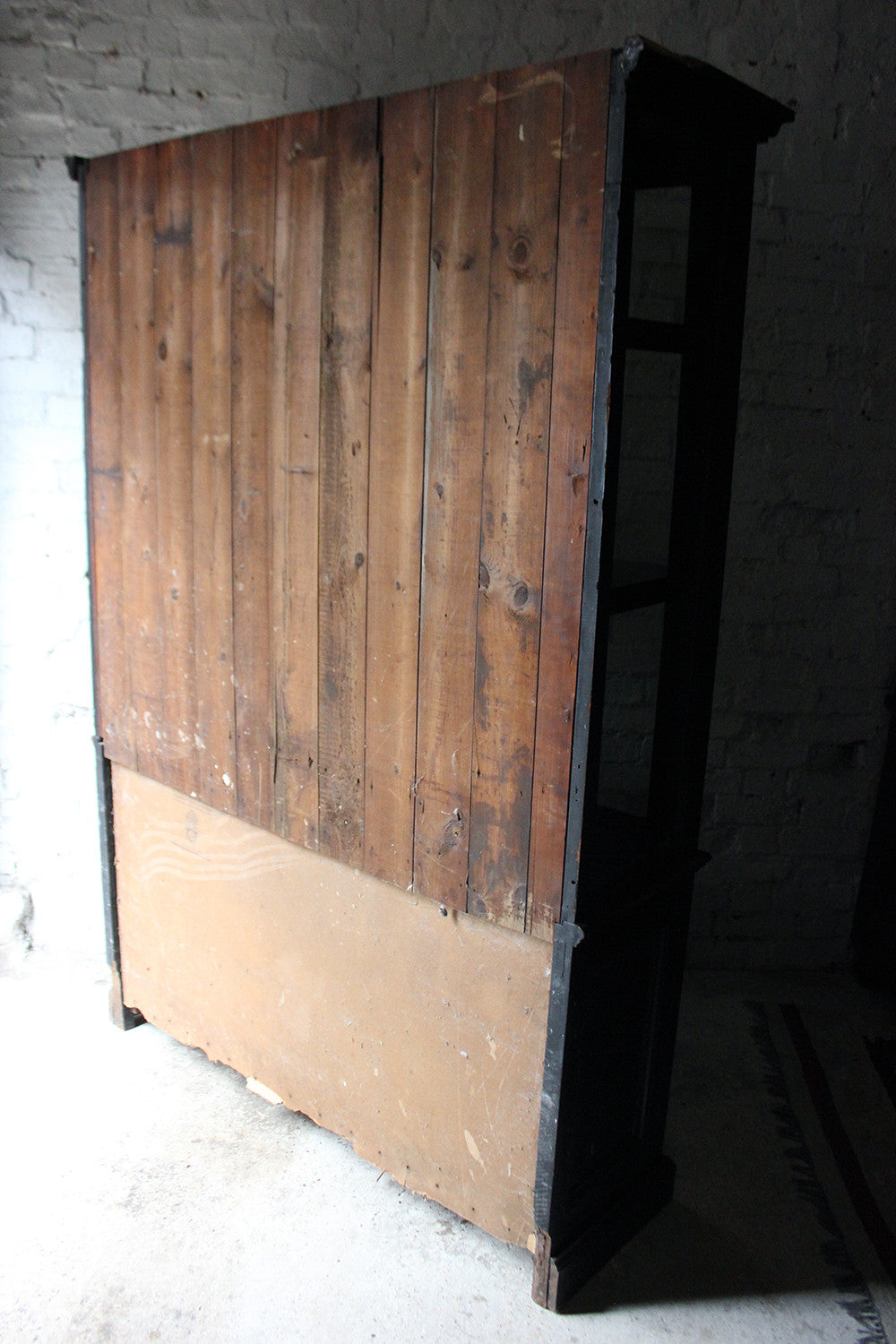 The cabinet is in good overall condition with all components being original aside from the shelves, which are later replacements. The surface has the expected signs of wear to the ebonised finish to the extremities, for example to the top, with some light surface marks making for a decorative piece. The cornice has a small section of loss to one corner. She remains sturdy and we have given the piece a light polish to the ebonised finish. The lower section to the rear of the cabinet has had a replacement mdf backing added.