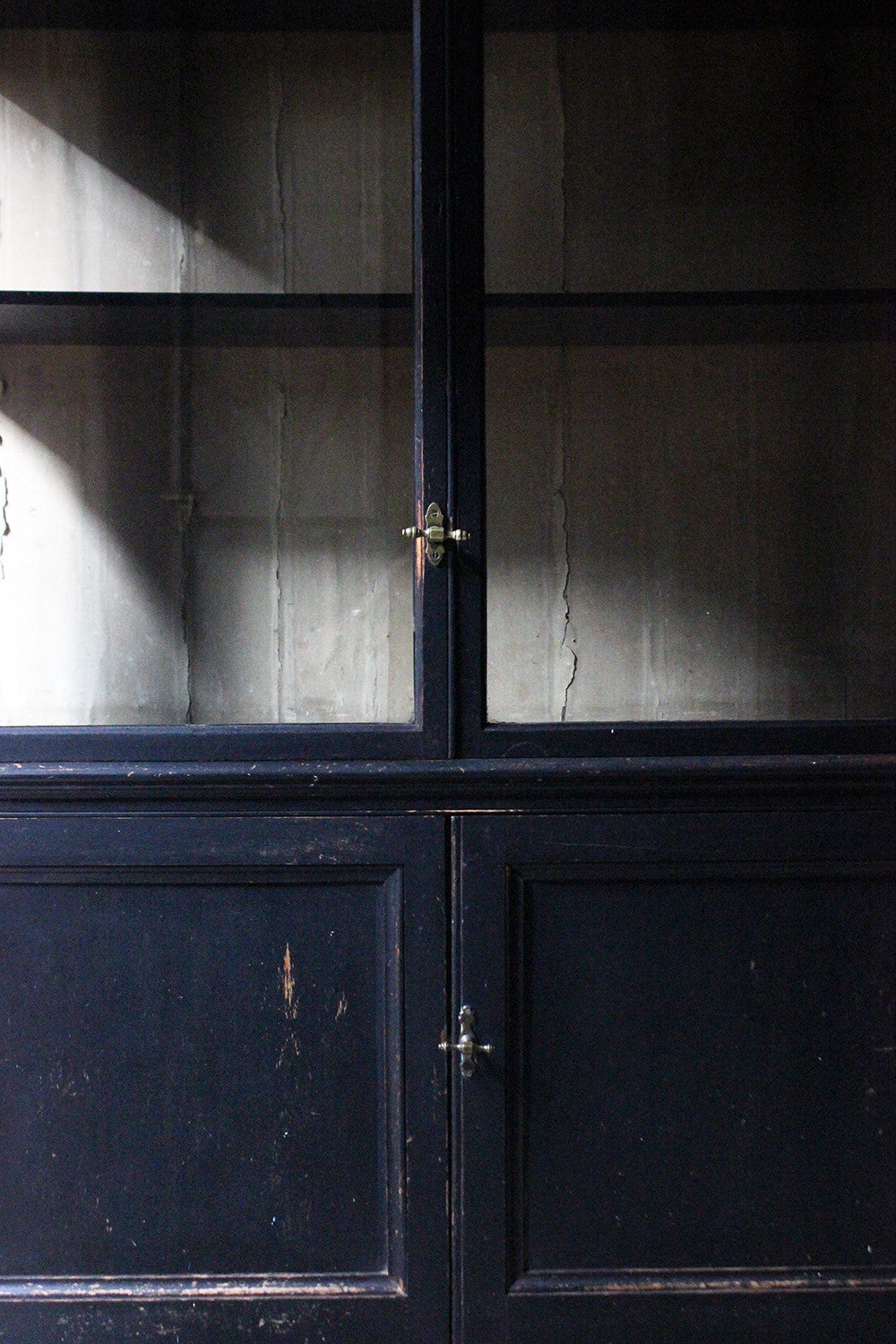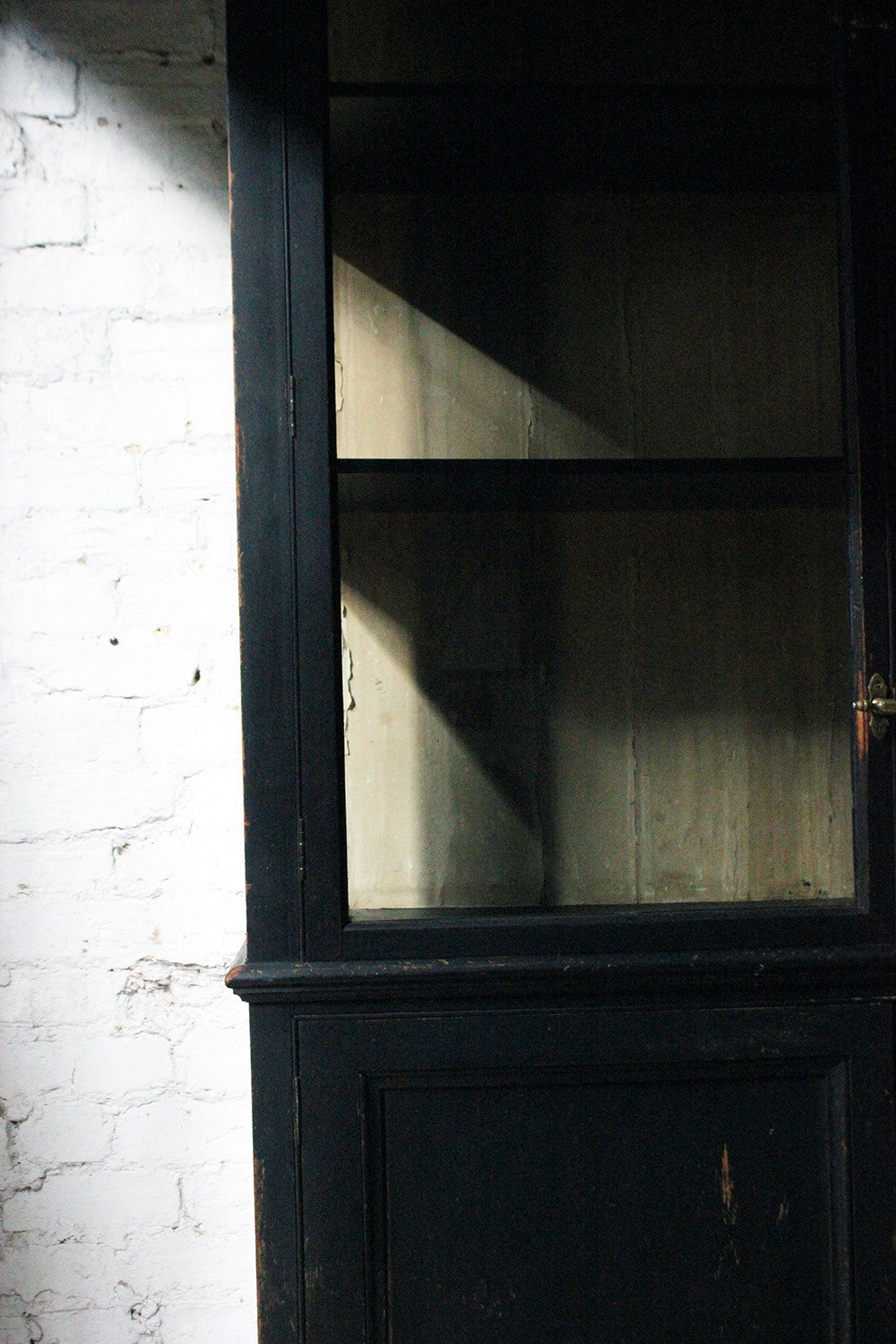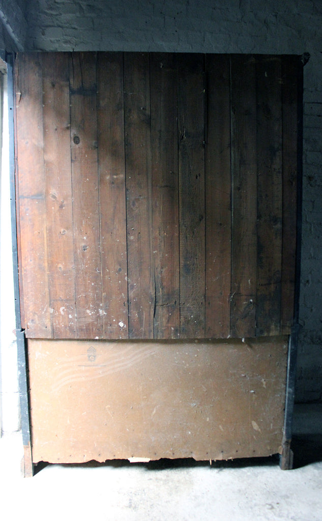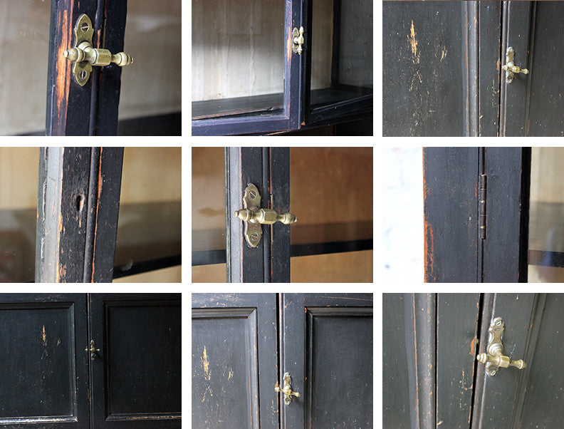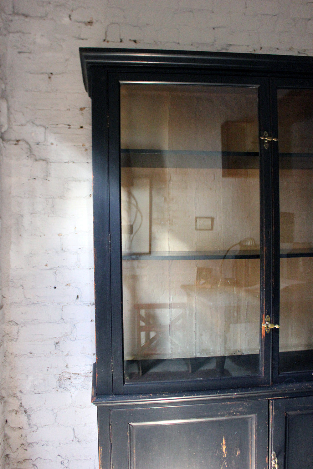 The cabinet is in good overall condition with all components being original aside from the shelves, which are later replacements. The surface has the expected signs of wear to the ebonised finish to the extremities, for example to the top, with some light surface marks making for a decorative piece. The cornice has a small section of loss to one corner. She remains sturdy and we have given the piece a light polish to the ebonised finish. The lower section to the rear of the cabinet has had a replacement mdf backing added.