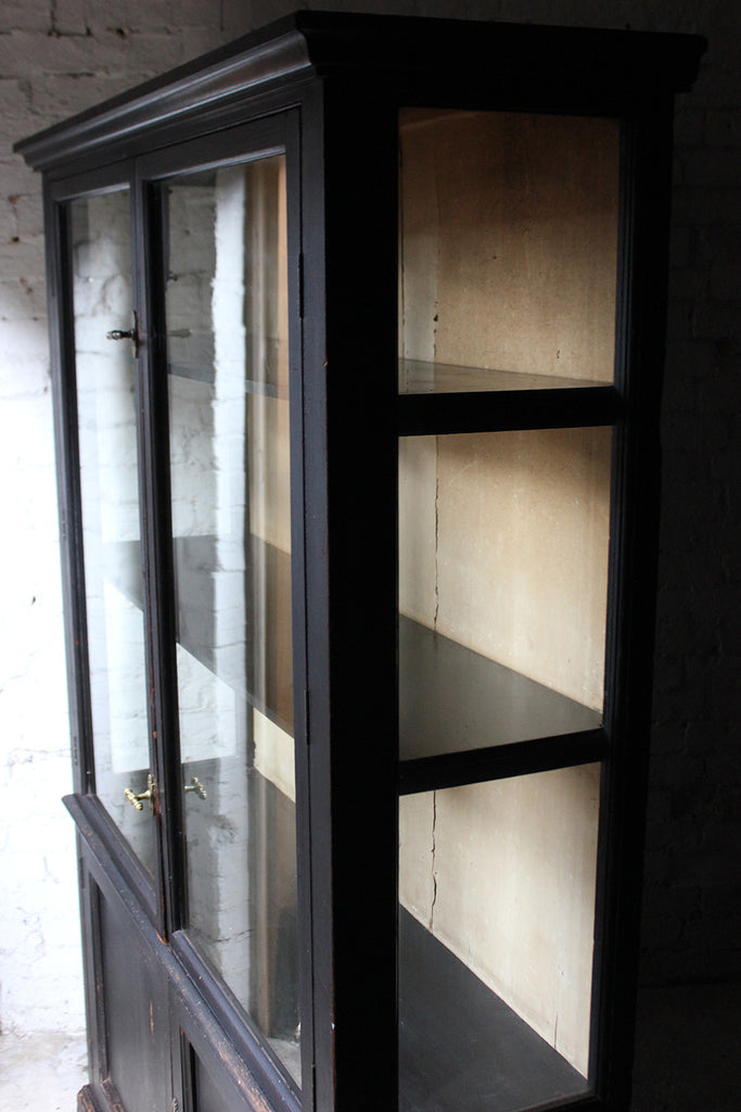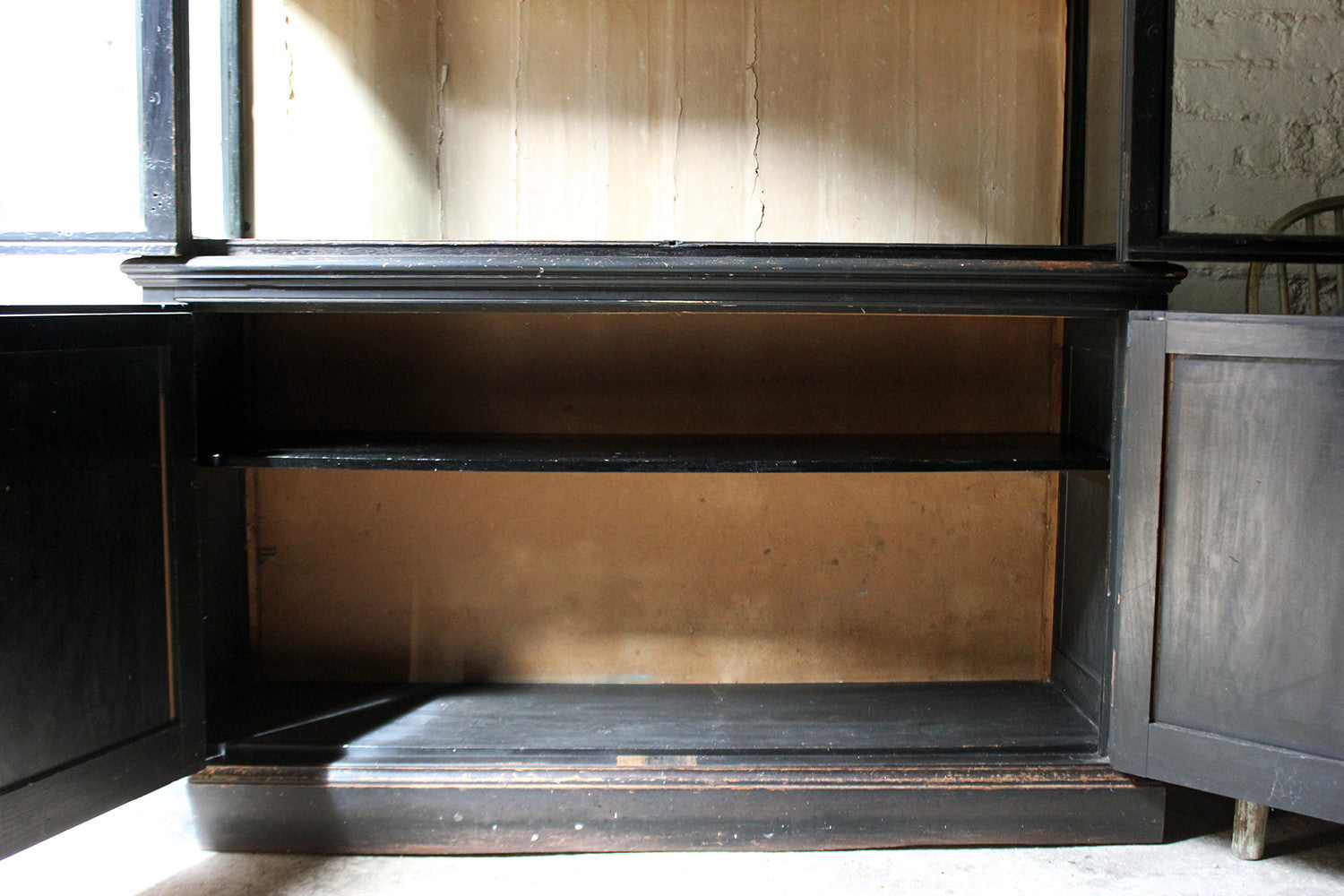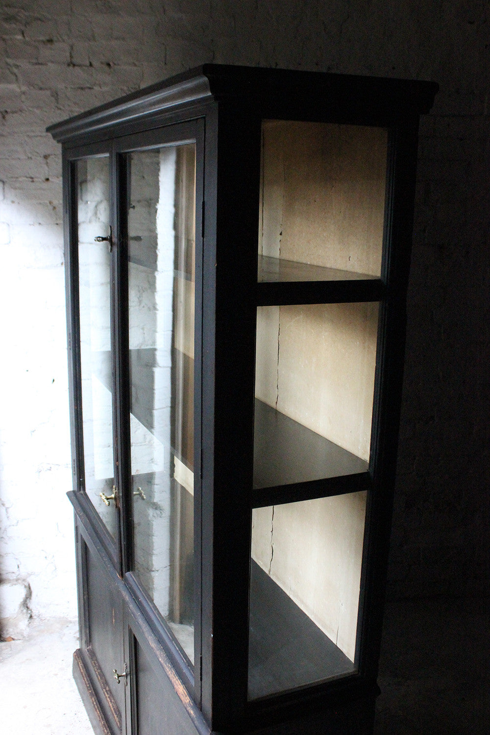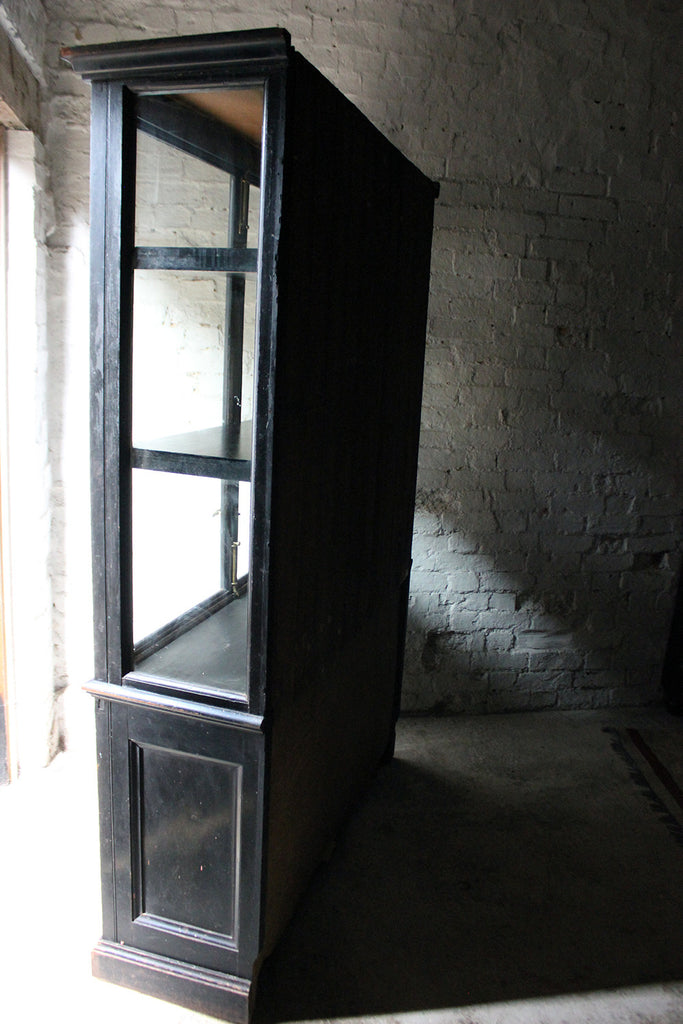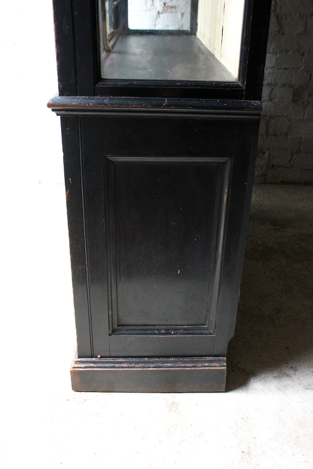 The good quality one piece ebonised shop display cabinet being glazed to all three sides, the carcass having a moulded cornice and plinth base, the original brass shop fitting handles opening to two shelves, the back showing the original parchment paper lining, the cupboard base with fielded panels opening to reveal a further shelf, the whole surviving from a department store in the Midlands and from the Edwardian period.