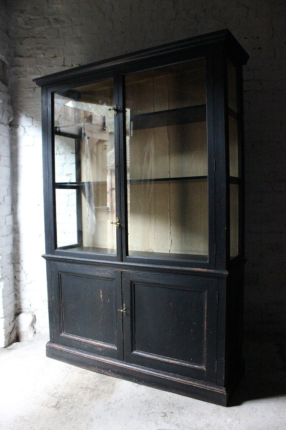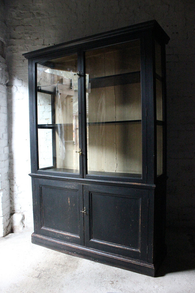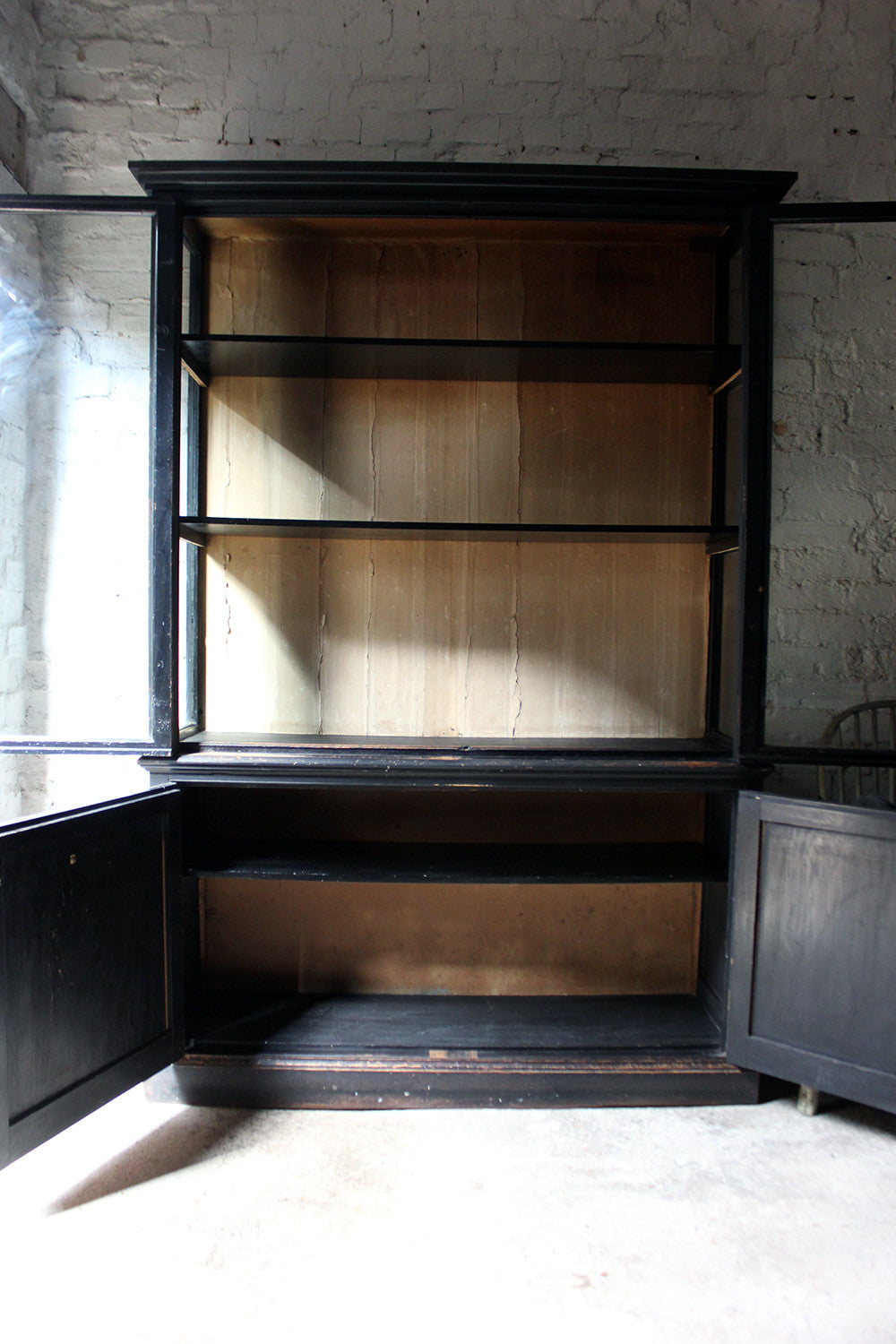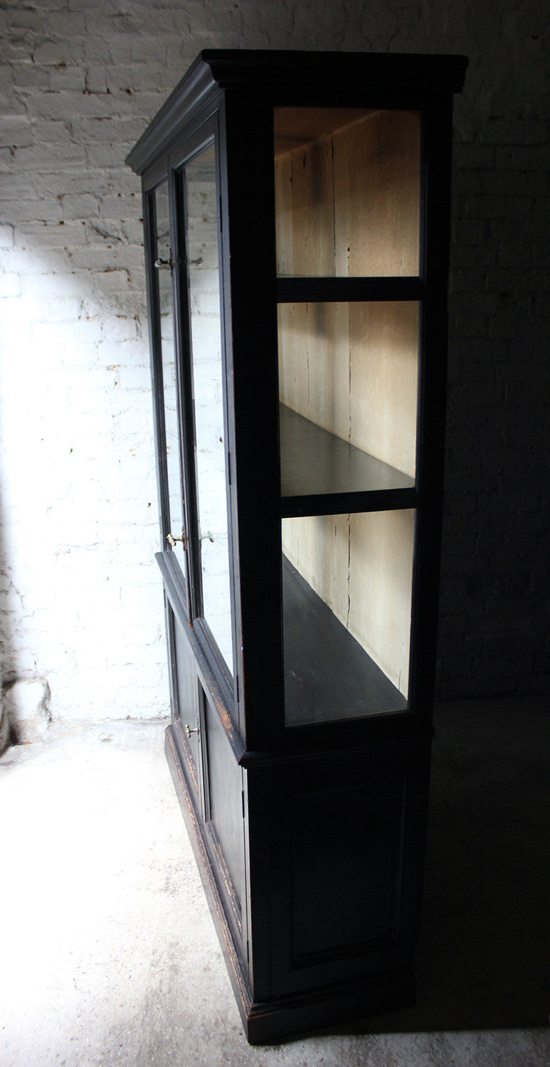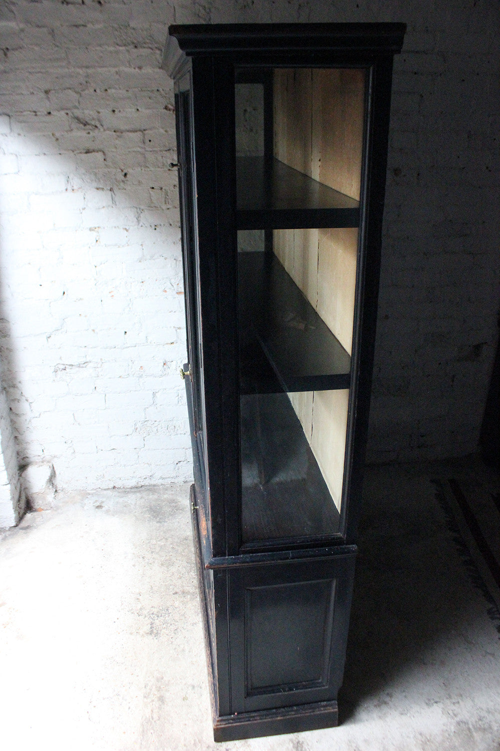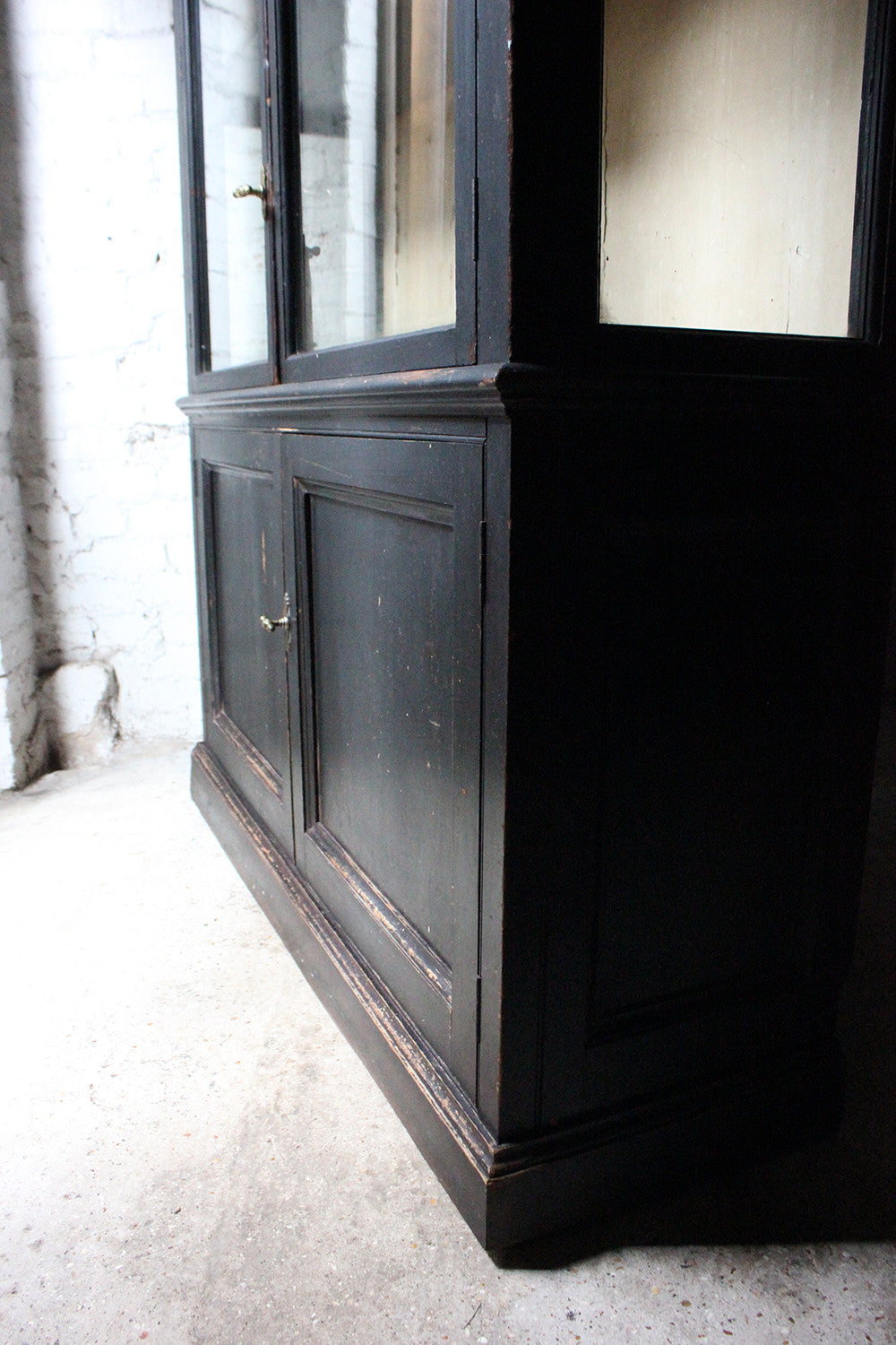 The good quality one piece ebonised shop display cabinet being glazed to all three sides, the carcass having a moulded cornice and plinth base, the original brass shop fitting handles opening to two shelves, the back showing the original parchment paper lining, the cupboard base with fielded panels opening to reveal a further shelf, the whole surviving from a department store in the Midlands and from the Edwardian period.