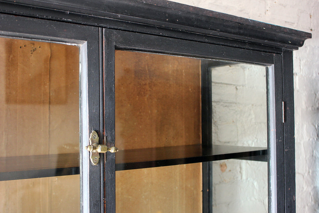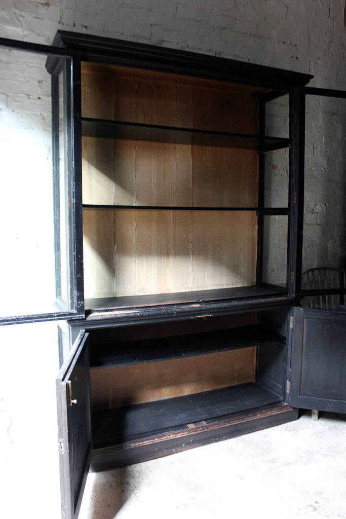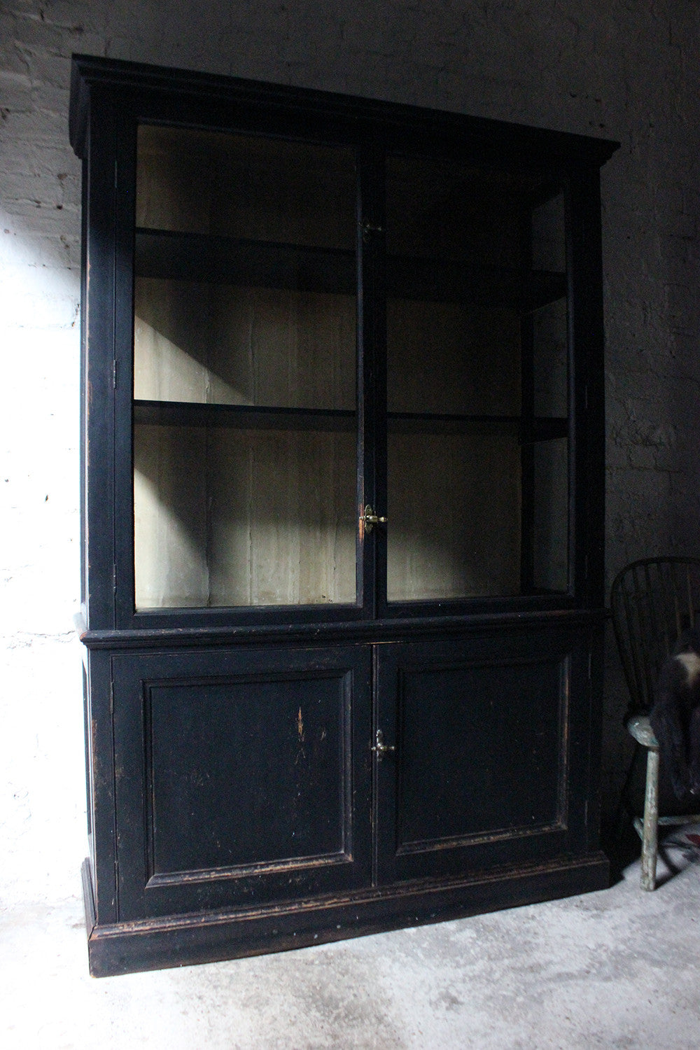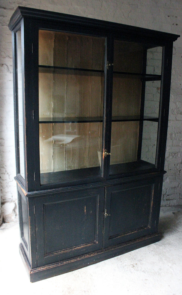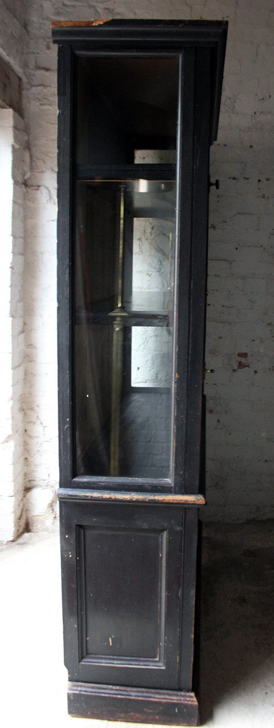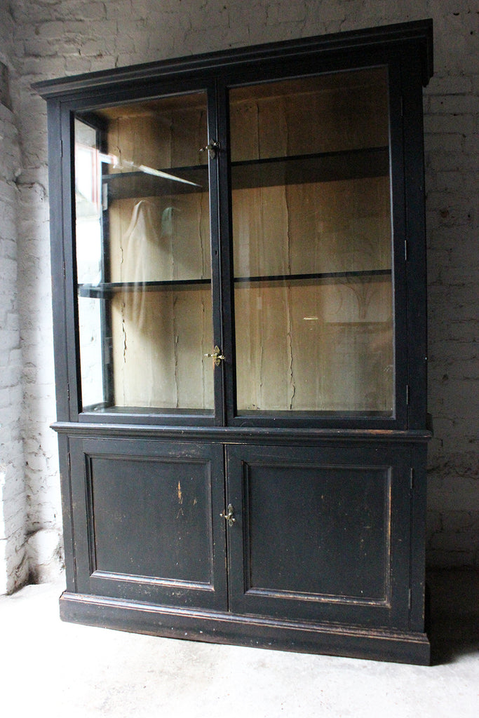 The good quality one piece ebonised shop display cabinet being glazed to all three sides, the carcass having a moulded cornice and plinth base, the original brass shop fitting handles opening to two shelves, the back showing the original parchment paper lining, the cupboard base with fielded panels opening to reveal a further shelf, the whole surviving from a department store in the Midlands and from the Edwardian period.
