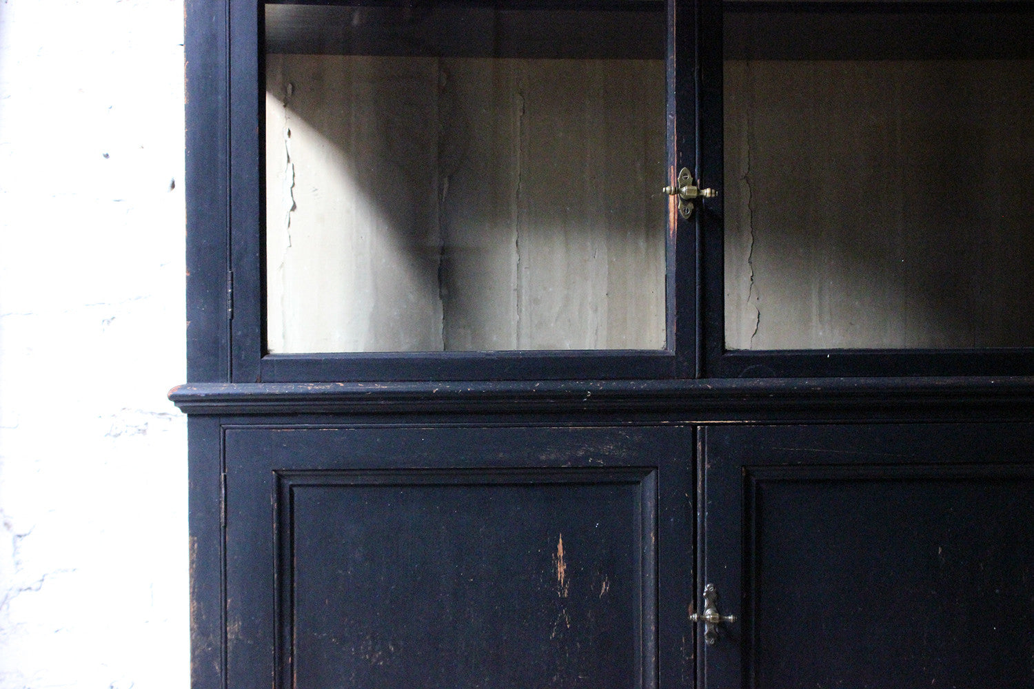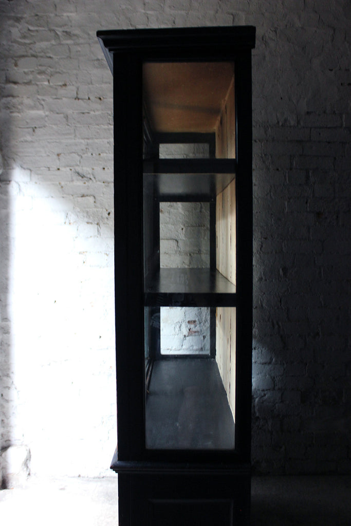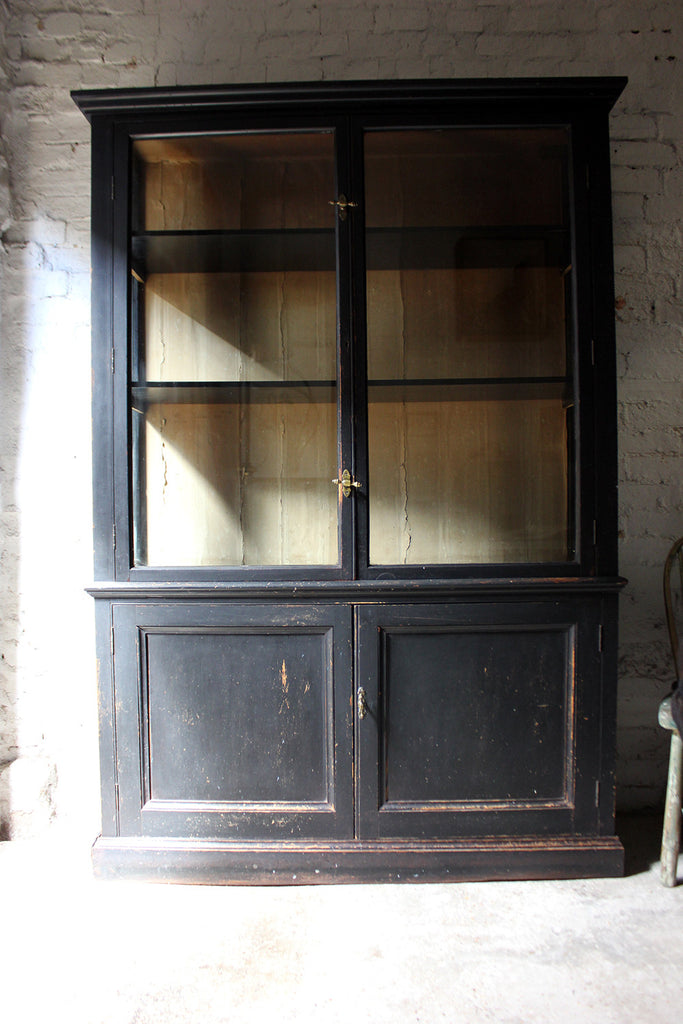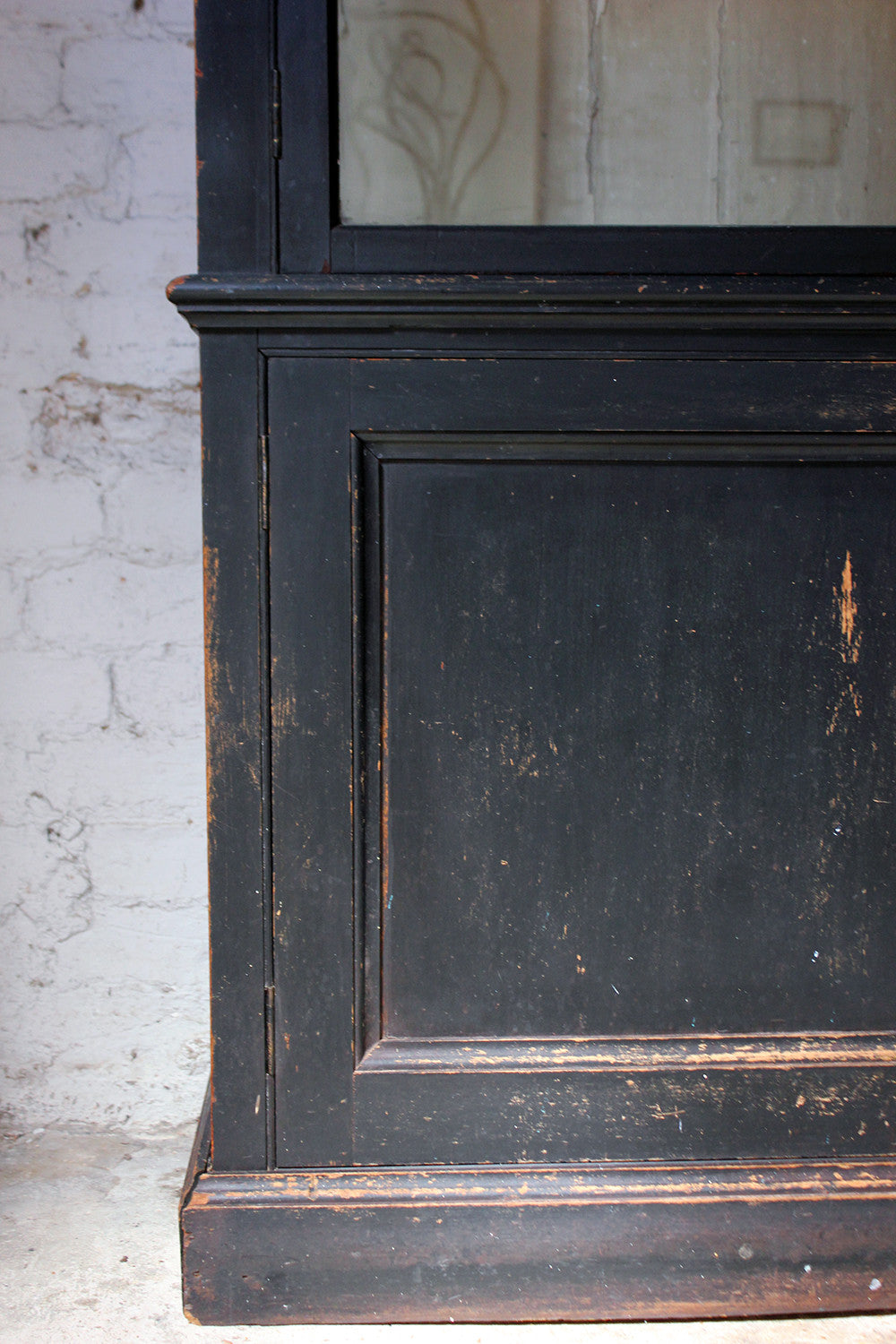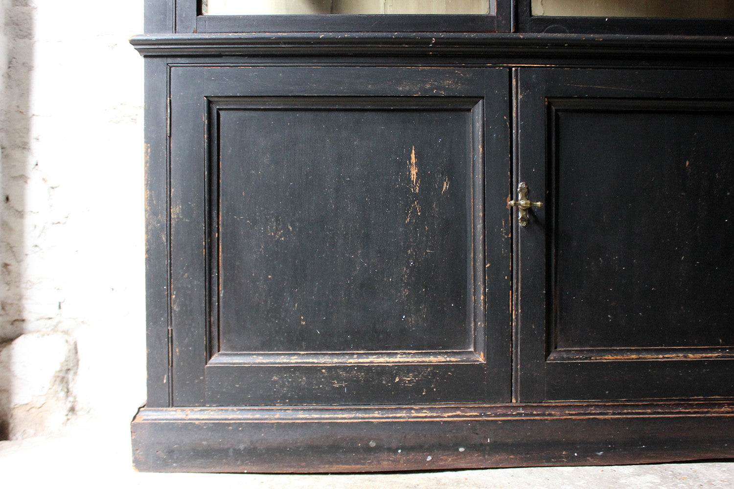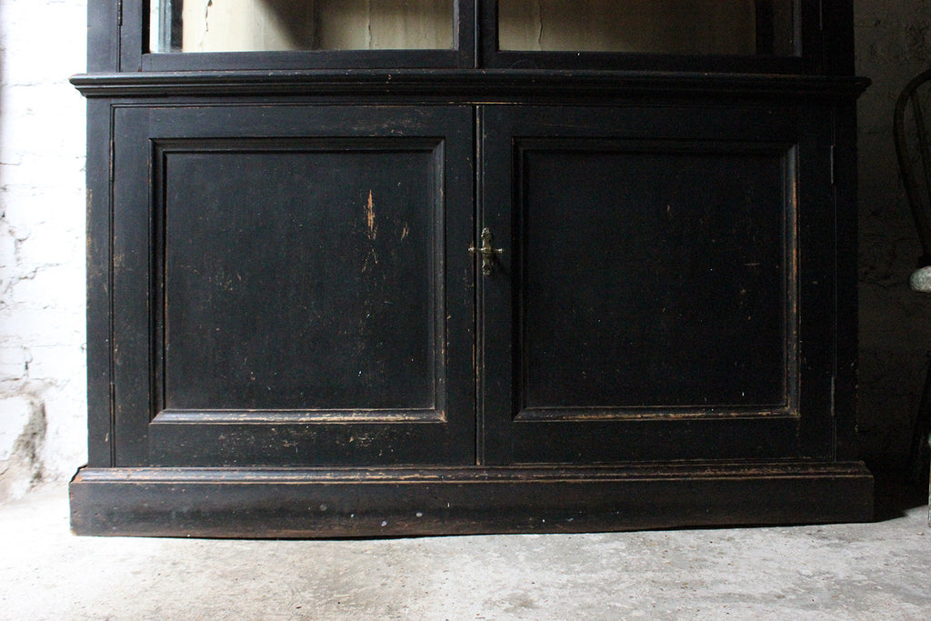 The good quality one piece ebonised shop display cabinet being glazed to all three sides, the carcass having a moulded cornice and plinth base, the original brass shop fitting handles opening to two shelves, the back showing the original parchment paper lining, the cupboard base with fielded panels opening to reveal a further shelf, the whole surviving from a department store in the Midlands and from the Edwardian period.